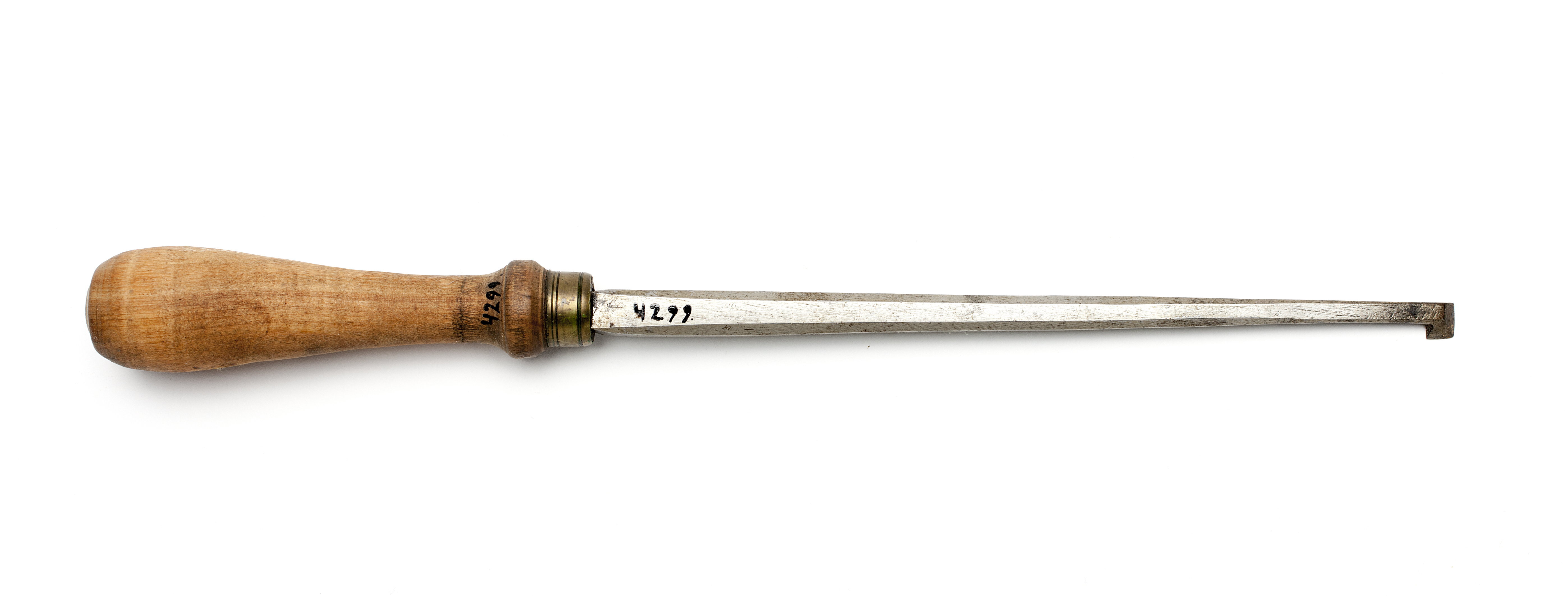 Klinga med rektangulär genomskärning. Stämplat på klingan: hjärta under kors. I änden platta med trapetsoidisk genomskärning. Egg efter två av plattans sidor. Svarvat skaft av päronträ med en vulst nedtill. Mässingsring.