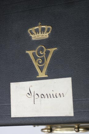 Schatull av trä överklätt med svärtat skinn, låses på framsidan med två nedfällbara profilerade spännen av förgylld mässing, på mitten utdraget rektangulär platta fäst med fyra skruvar samt ovalt handtag och nyckelhål med 32 mm lång nyckel av stål. Nyckeln fästad vid handtaget med vit tvinnad snodd av silke. På lockets ovansida ett "G" inom romersk femma. Ovanför kunglig krona av förgylld mässing samt vit rektangulär etikett med text i svart bläck: "Spanien". Schatullet inuti klätt med vit silkesammet och bottenfack för sabel med tillbehör: balja, portepé, gehäng, livrem och bärrem. Locket klätt med vitt atlassiden samt text med svart: "C. Jordana principe- 9. Madrid".