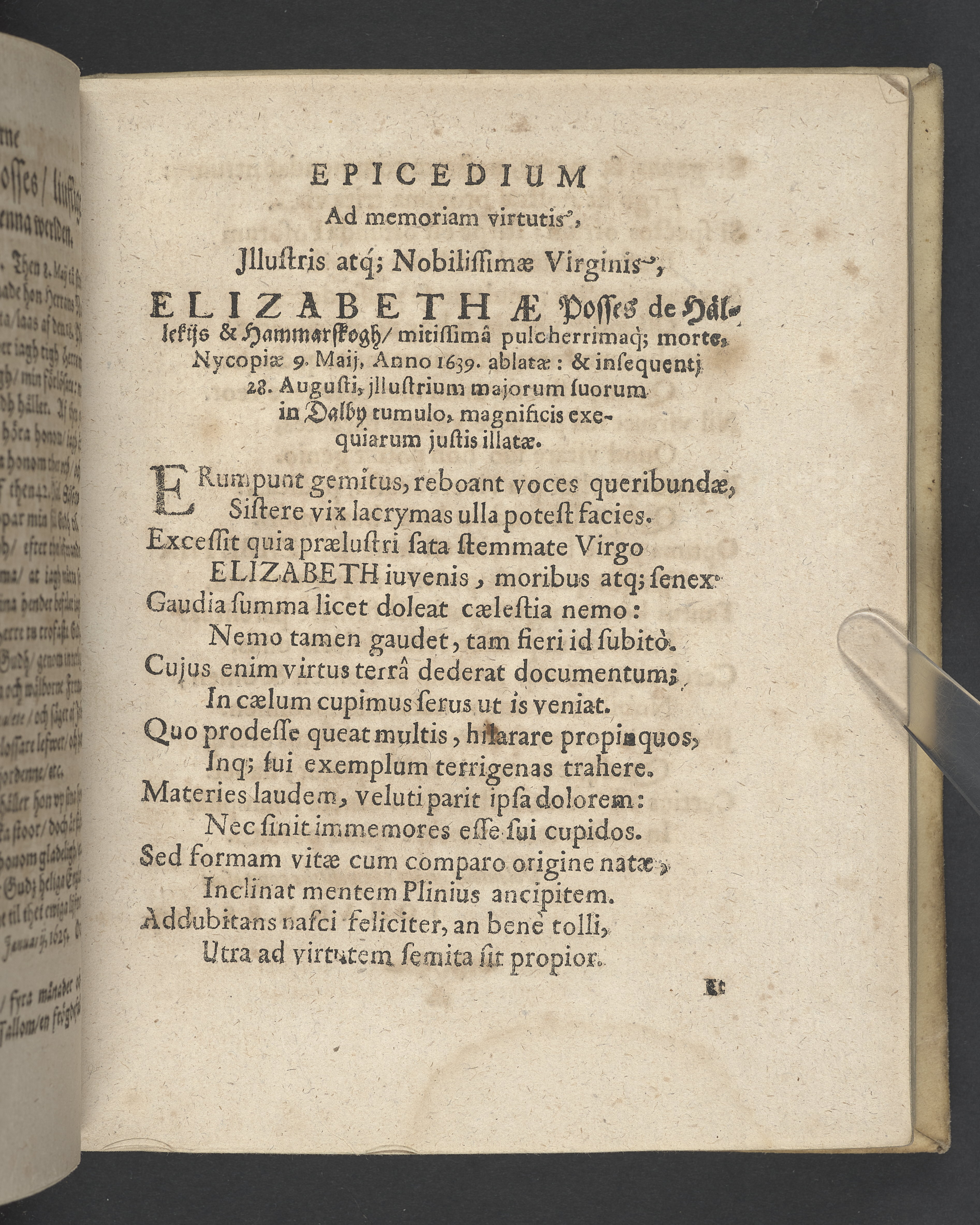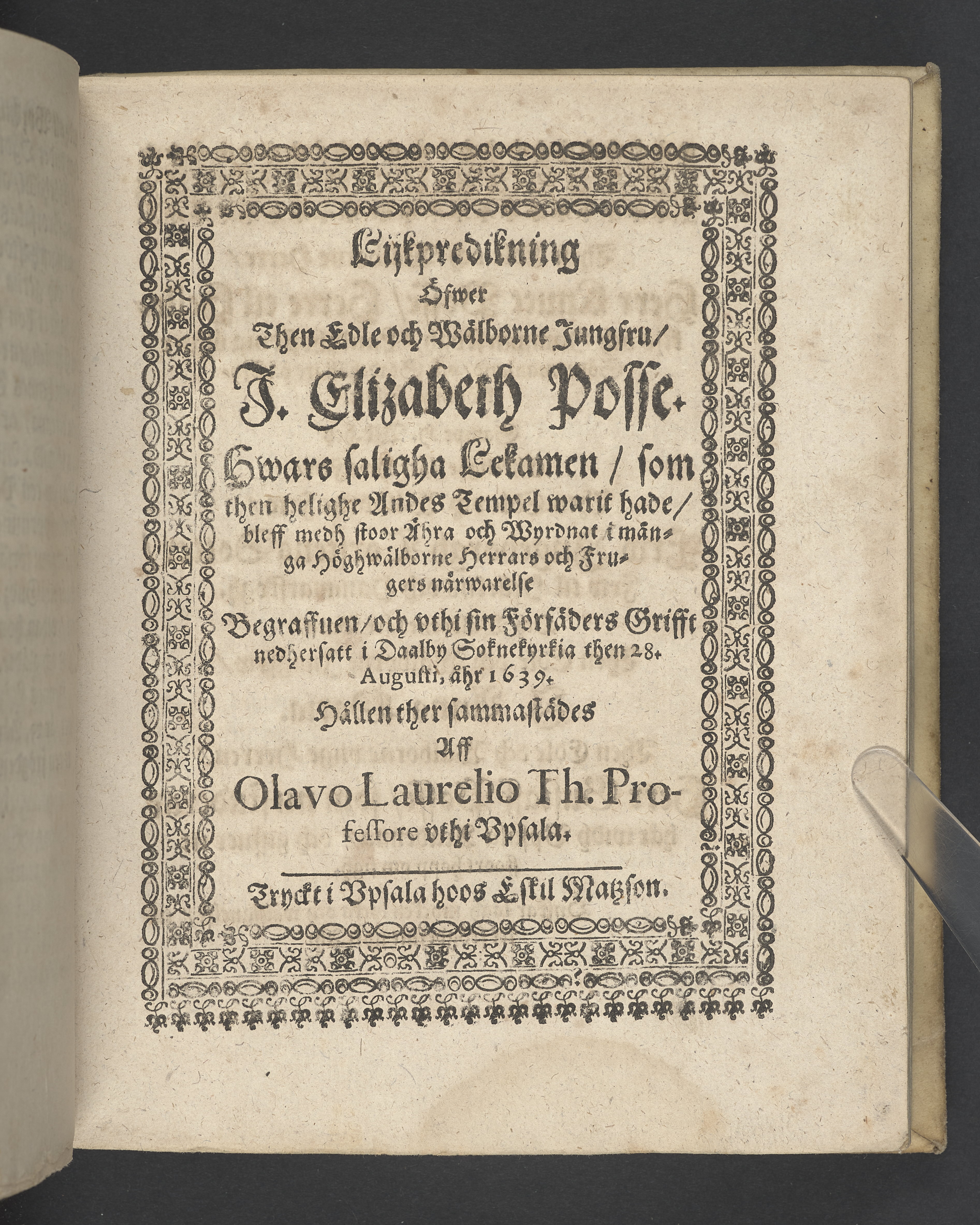 Lijkredikning öfwer... I. Elisabeth Posse... begraffven... i Daalby soknekyrkia then 28. augusti, åhr 1639... Tryckt i Upsala hoos Eskil Matzon.