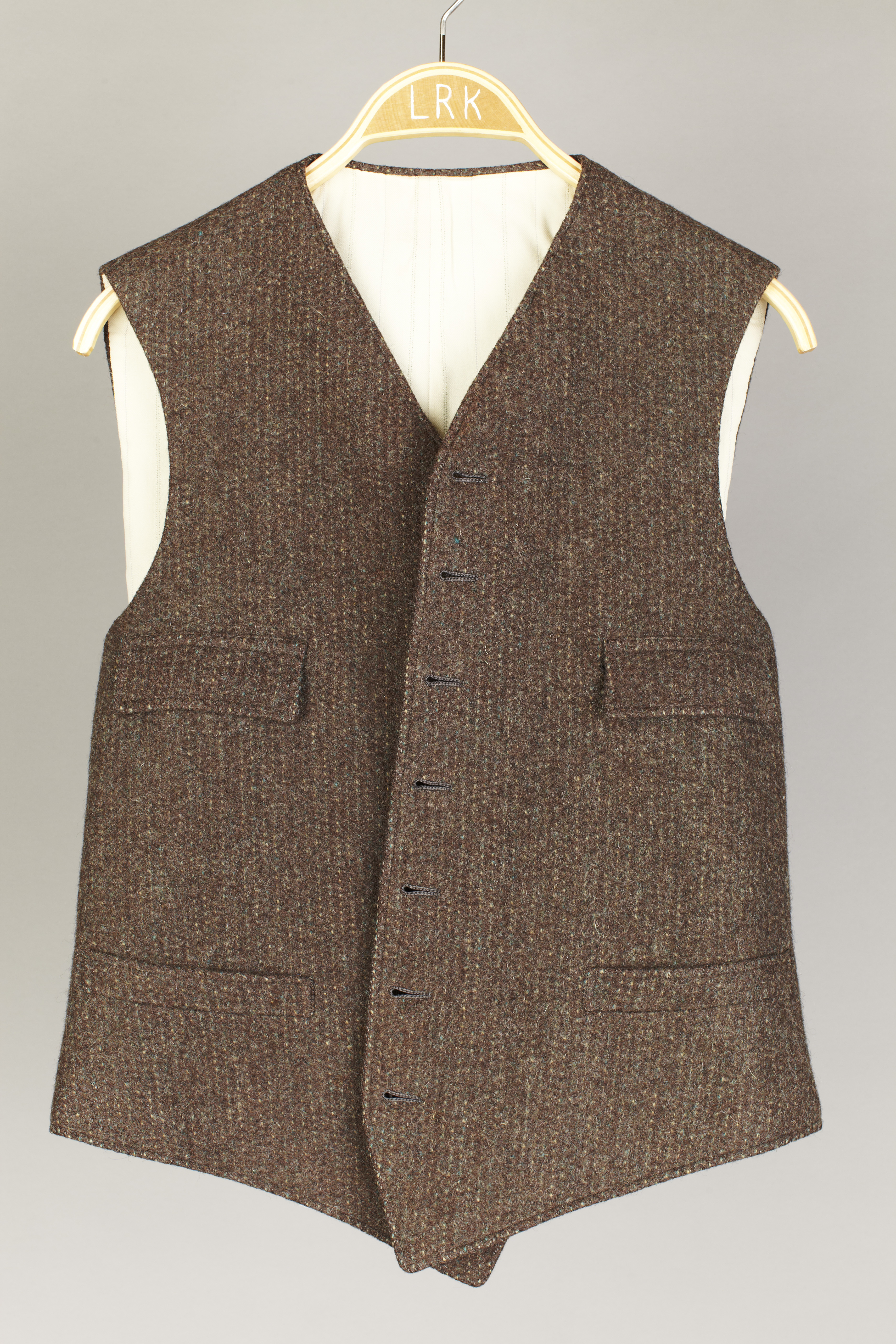 Väst av brun-grönmelerad tweed. Enkelknäppt utan slag. Sju knappar d: 15 mm av brunflammigt horn. Fyra fickor, de övre med lock, de nedre stolpfickor. I ryggen spänntampar av grönt kyprat siden med grönlackerad sölja med text: "SOLIDE". Foder av vitt tunt ylle med smala gröna och blå ränder. Dessutom mellanfoder.