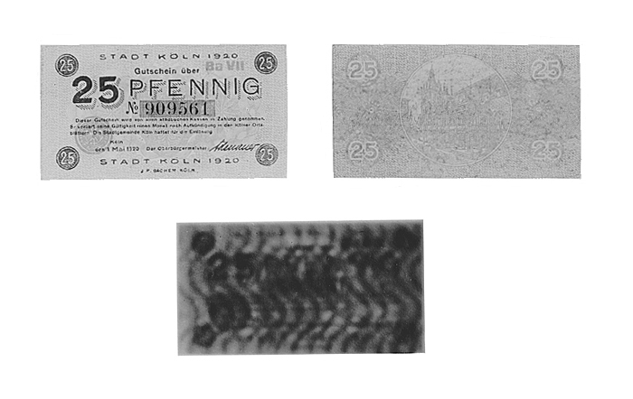 25 PFENNING 1920. Vit. Framsida: Undertryck i gult, i mitten en ornering av tre guillocherade rosetter. Baksida: Tryck i gultint, i runt mittfält vy av stadens rådhus, på ömse sidor därom en guillocherad rosett i varje hörn ett runt fält med värdesiffrorna, för övrigt med textrader som på framsidan. Vattenmärke: se Planschverket. Mått: Längd: 87 mm.; bredd: 48 mm.