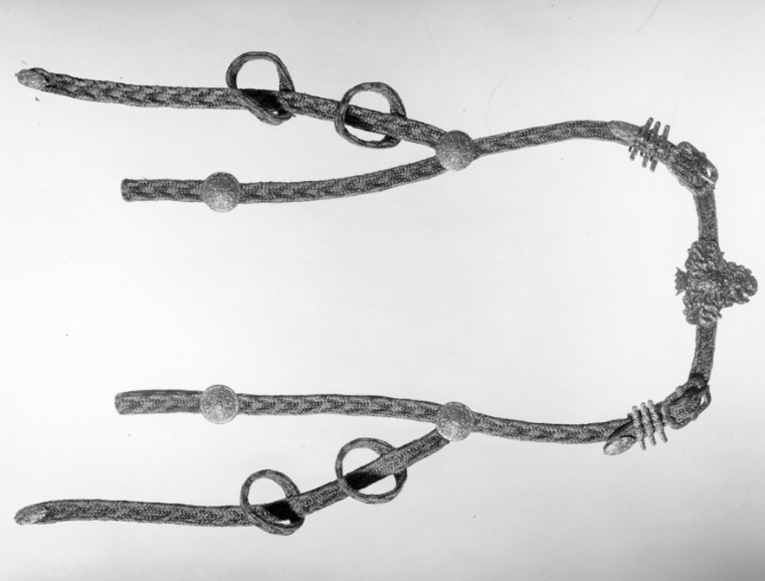 Hufvudställe och handtygel lika förbögeln, beslagen af pucklor, söljor, stiften af 6lödigt silfver samt 4 små kedjor för pannan