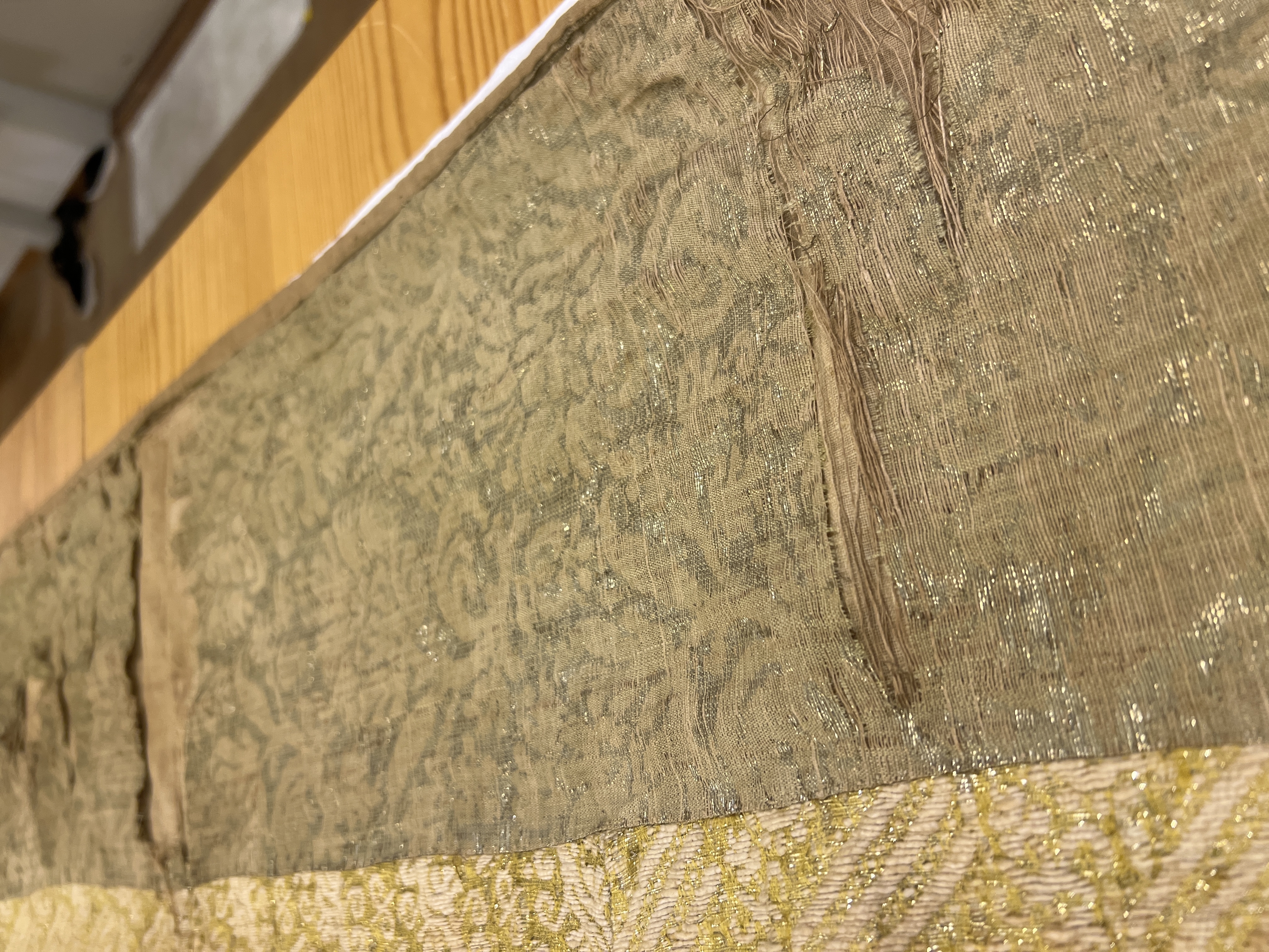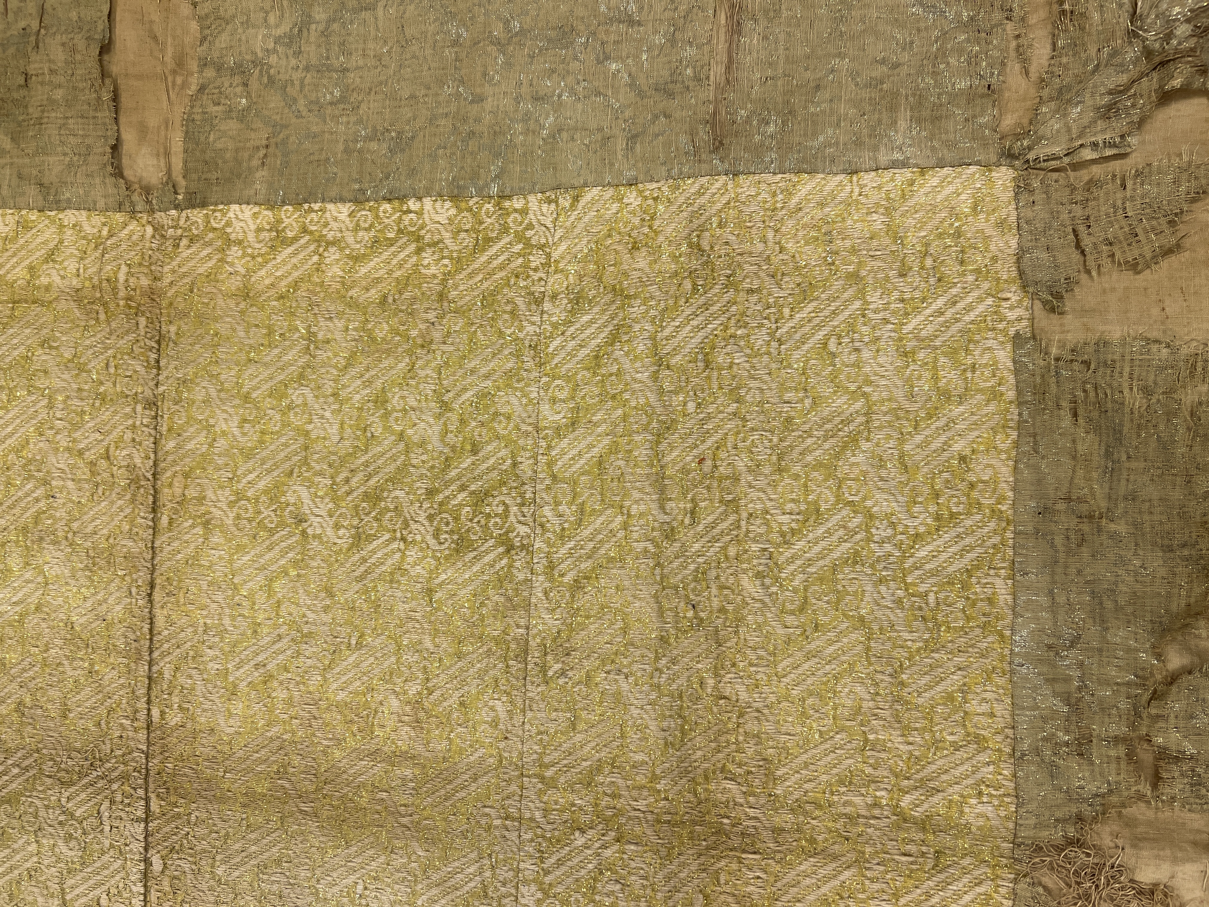 Brudpäll med brokadtyg och foder. Rätsidan har ett gult brokadtyg infällt i en ram av ett annat brokadtyg. Tyget i mitten är klart gult och guldskimmrande. Mönsterformerna skapas av ett tjockt, kardat silkesgarn i vitt. Invävt är också ett guldlan. Detta parti består av flera hopsydda våder. Tyget i ramen har ett floralt mönster. Ramen består av fyra sammanfogade tygstycken. Dessa tyger är dock mycket sköra och på flera ställen trasiga. Antagligen har tyget ursprungligen varit rött med inslag av guldtrådar, idag är det mycket blekt och många trådar ligger lösa. Baksidan består av flera sammanfogade linnetyger. Dessa är sydda med en tvåtrådig lintråd. Pällen uppvisar inga spår av öglor eller någon form handtag i hörnen.