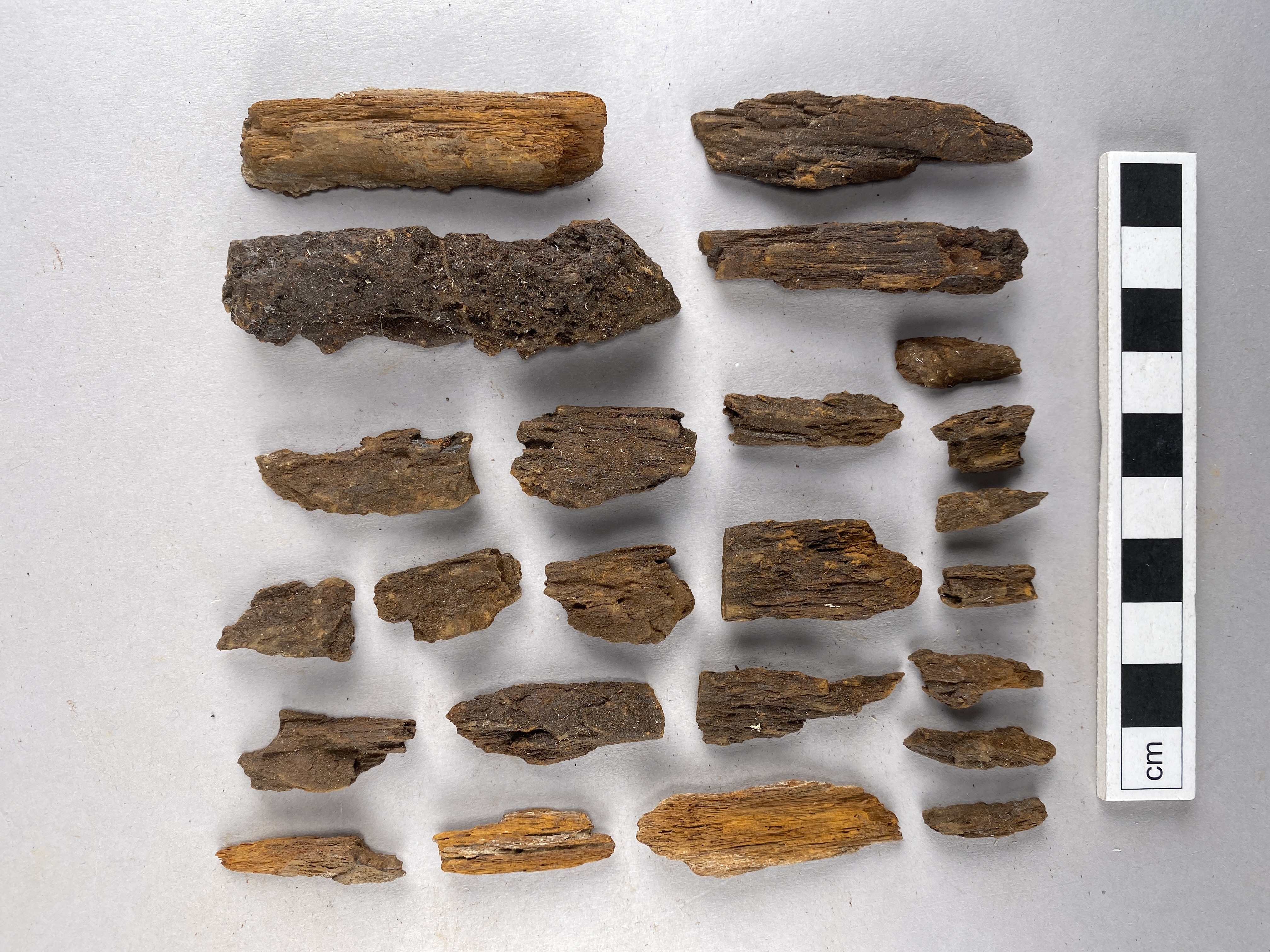1 träfragment med fastsittande textilfragment.