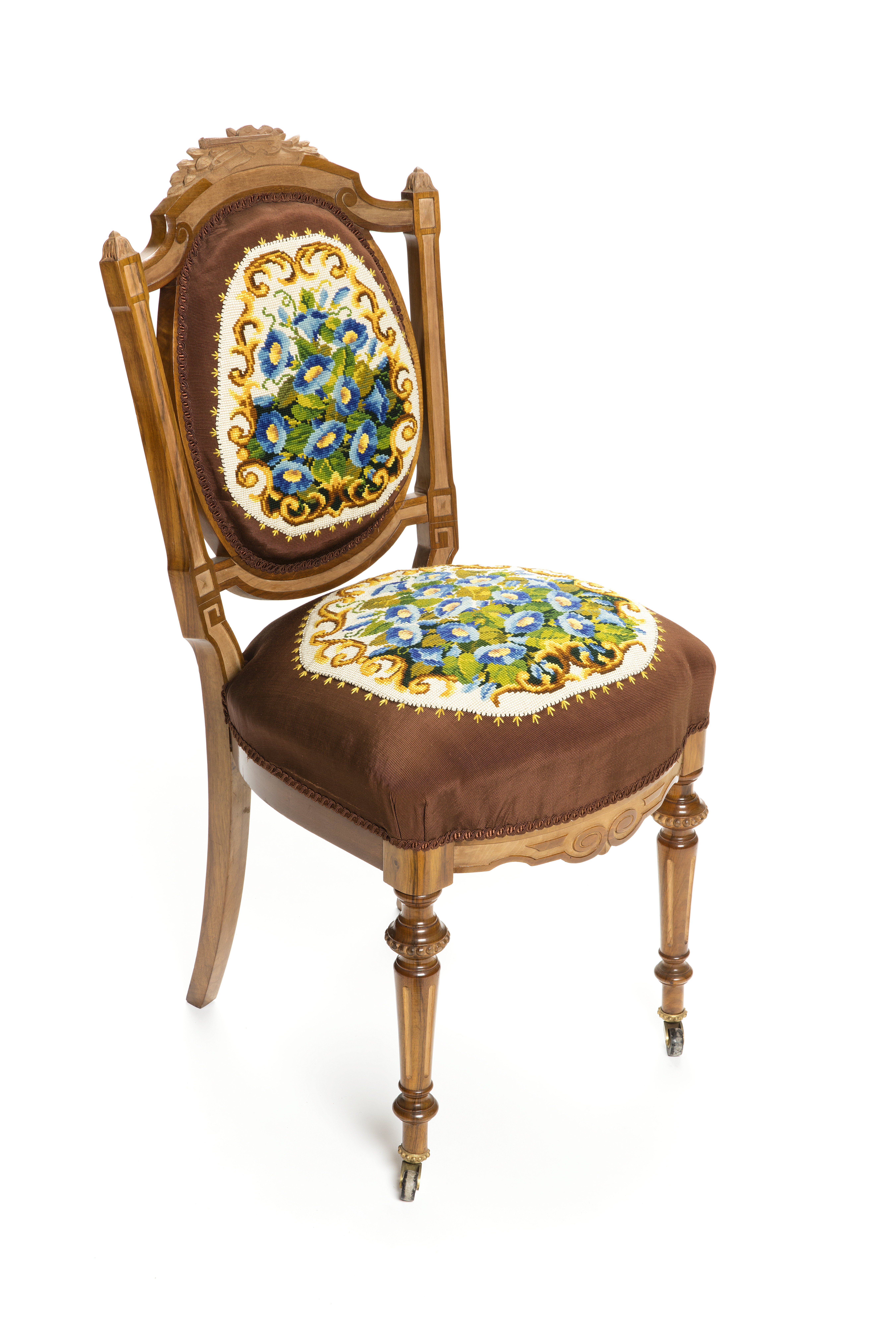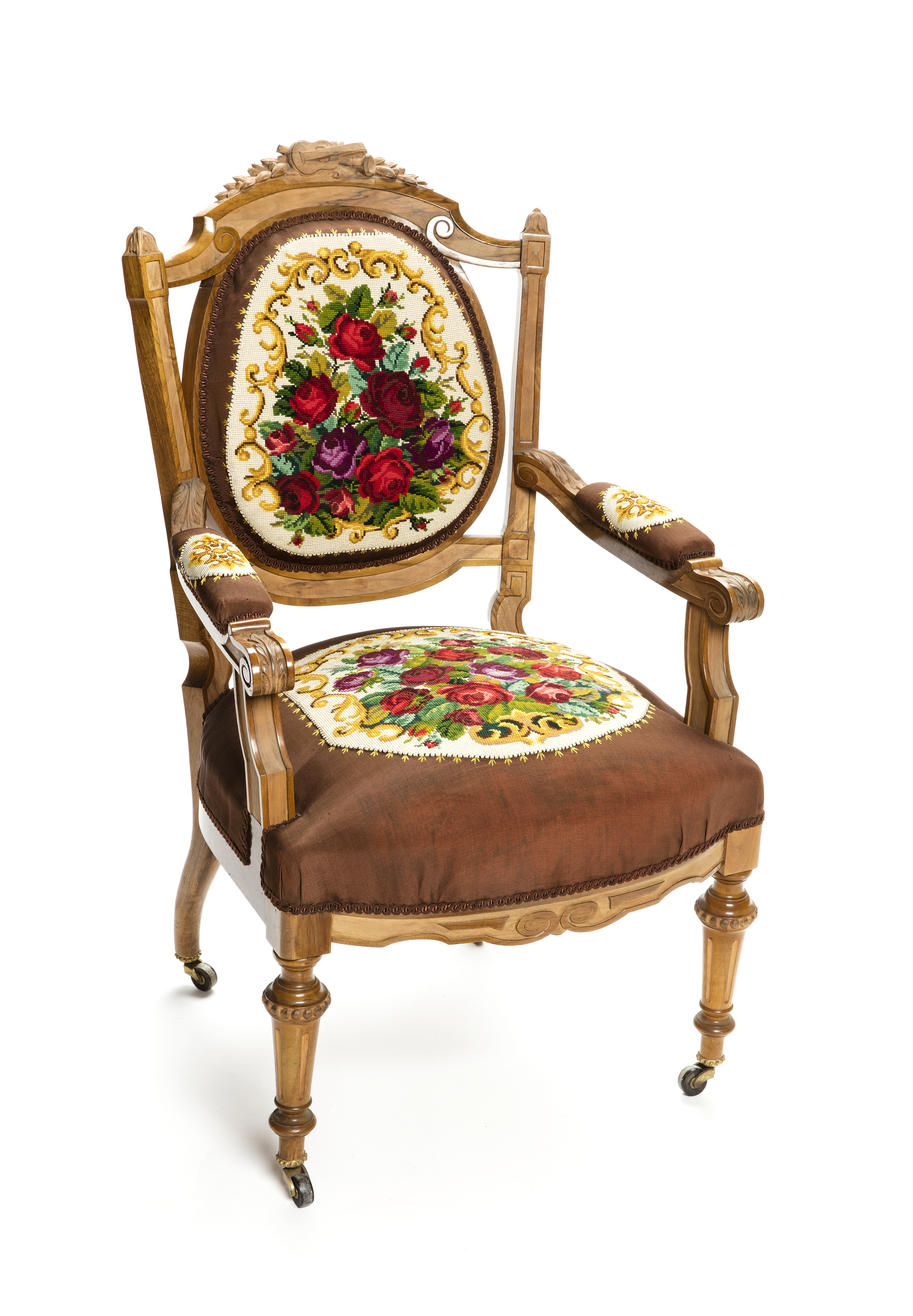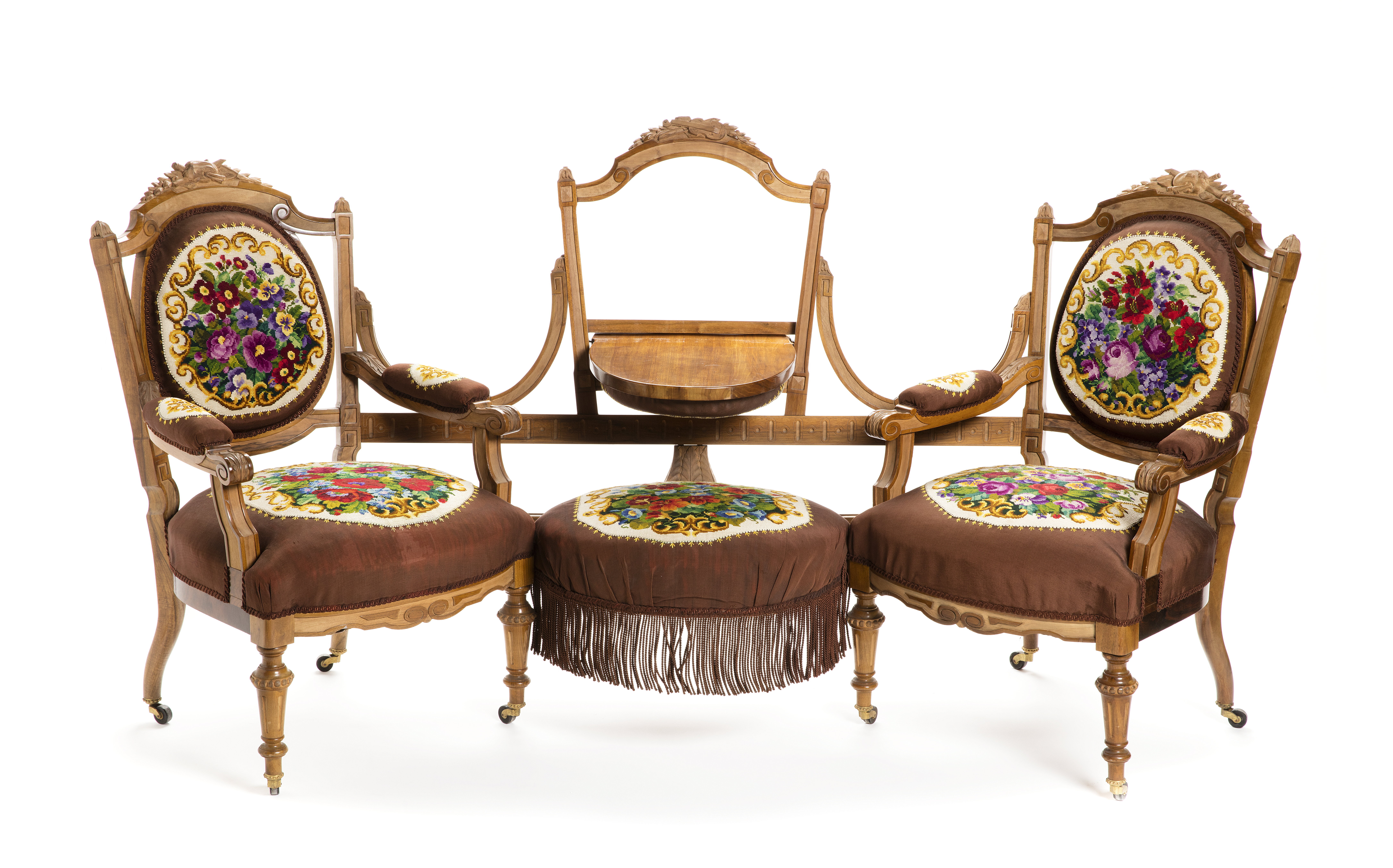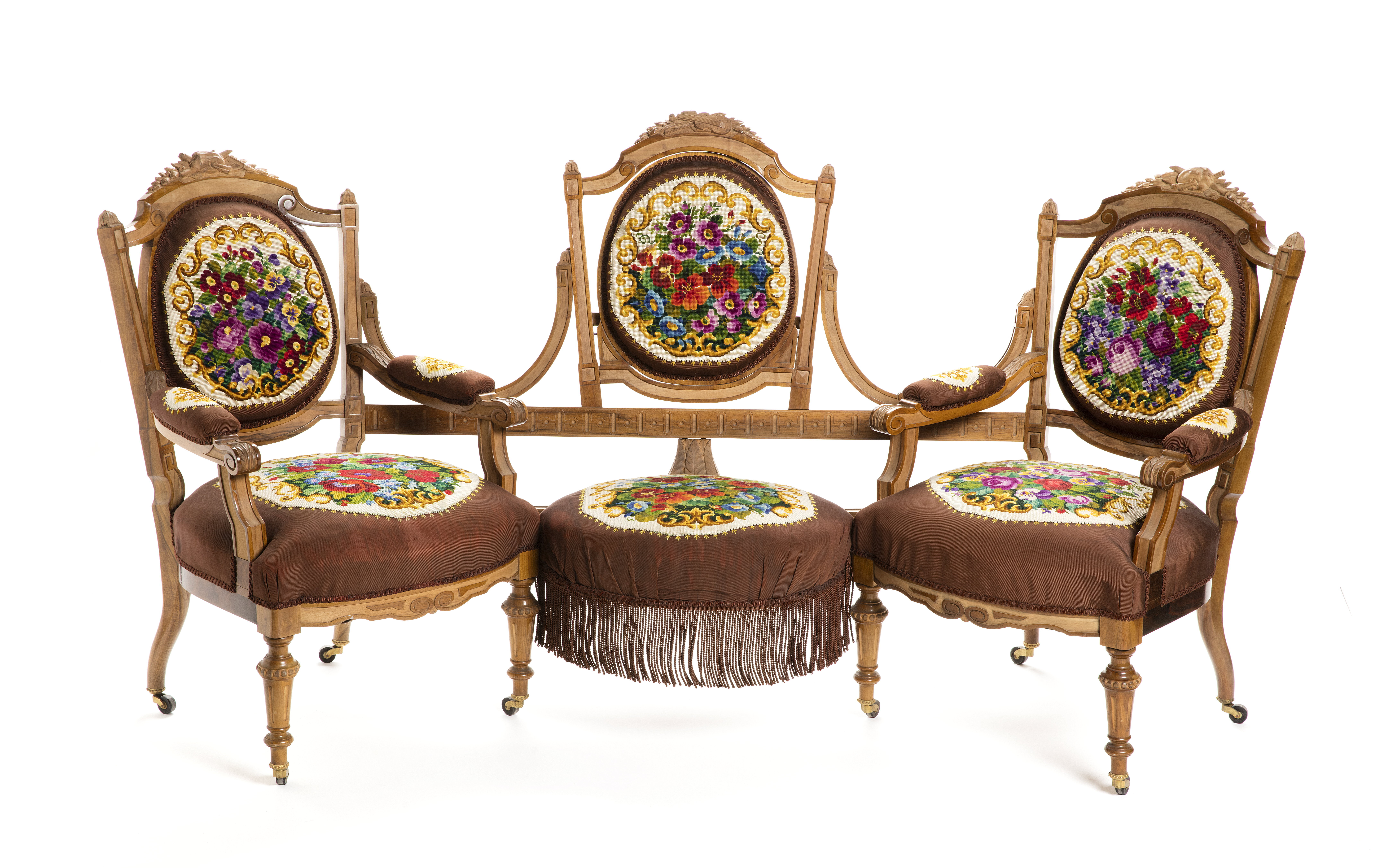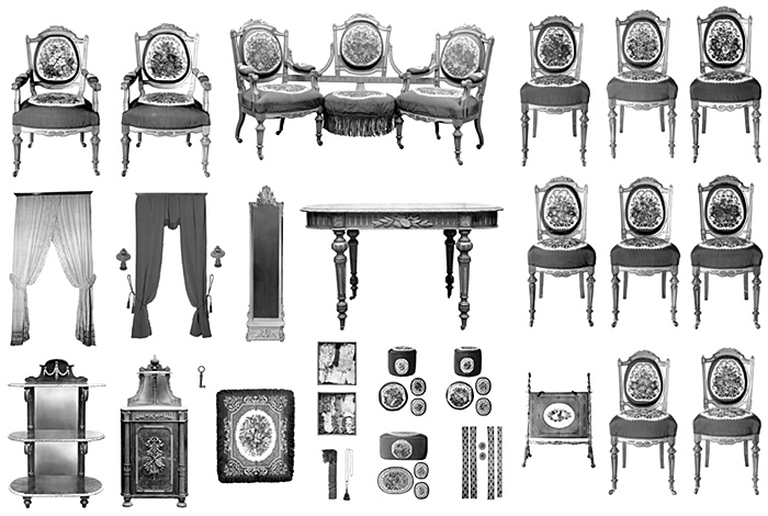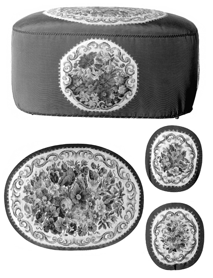 MÖBELUPPSATS bestående av bord, hylla, notportfölj med fotställ, hörnskåp med nyckel, soffa, två länstolar, åtta stolar, en avlång puff, två runda puffar, en trymå, två undergardiner med fyra hållare, två lufter övergardiner med två kappor, fyra broderade bårder, två ovala broderier jämte en lös frans, fyra gardinhållare, fyra gardinrosetter, två kornischer, två gardinbrädor, ett spjällsnöre, en matta samt överblivet garn. Möbeluppsatsen har till 1916 stått på Ericslund, Västerljungs socken, Södermanland, därefter i hushållerskans rum i hallwylska palatset. Möbeluppsatsen, utom trymån, är inköpt 1873 hos möbelhandlaren D. Heyman, Hamburg. Alla broderier har utförts av Wilhelmina von Hallwyl, åren 1870-1873.
