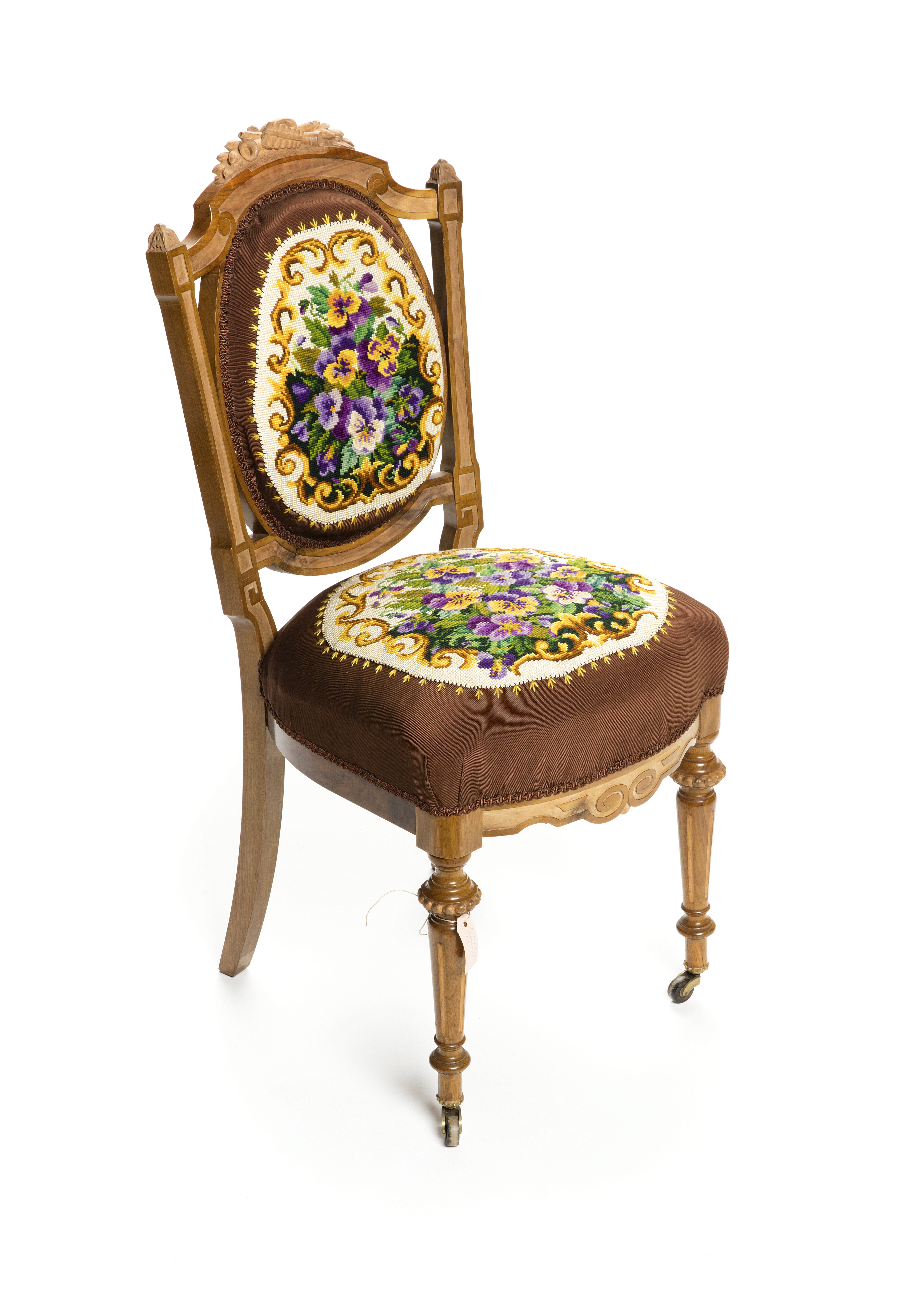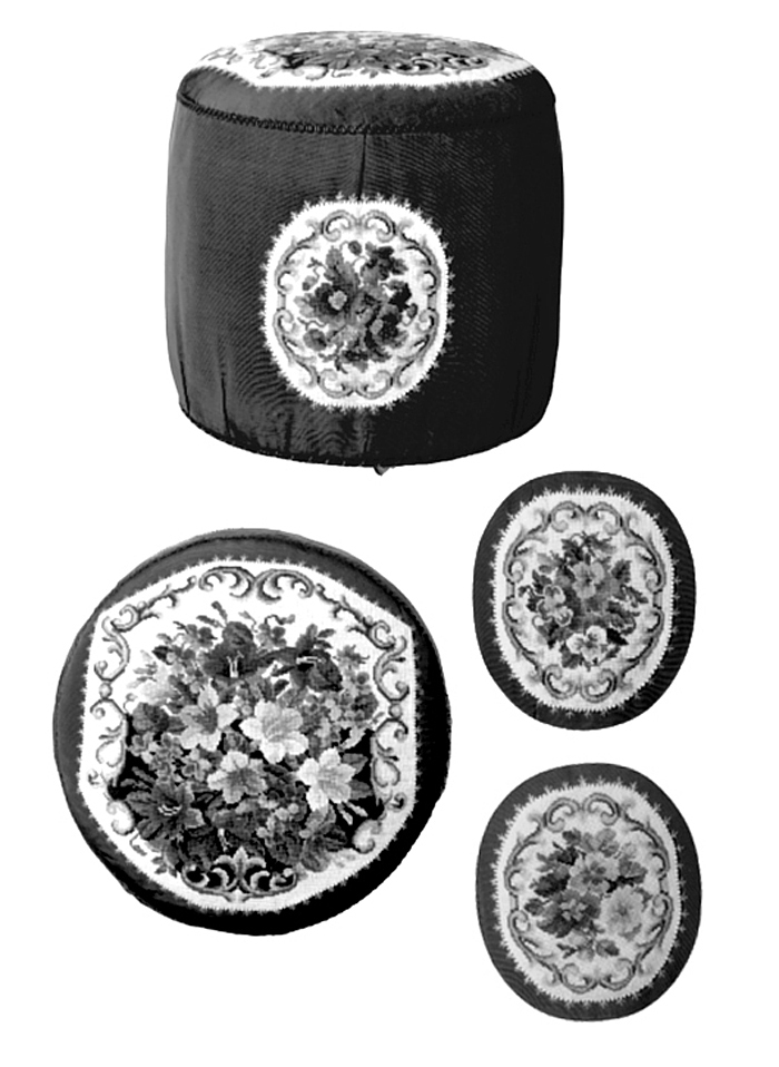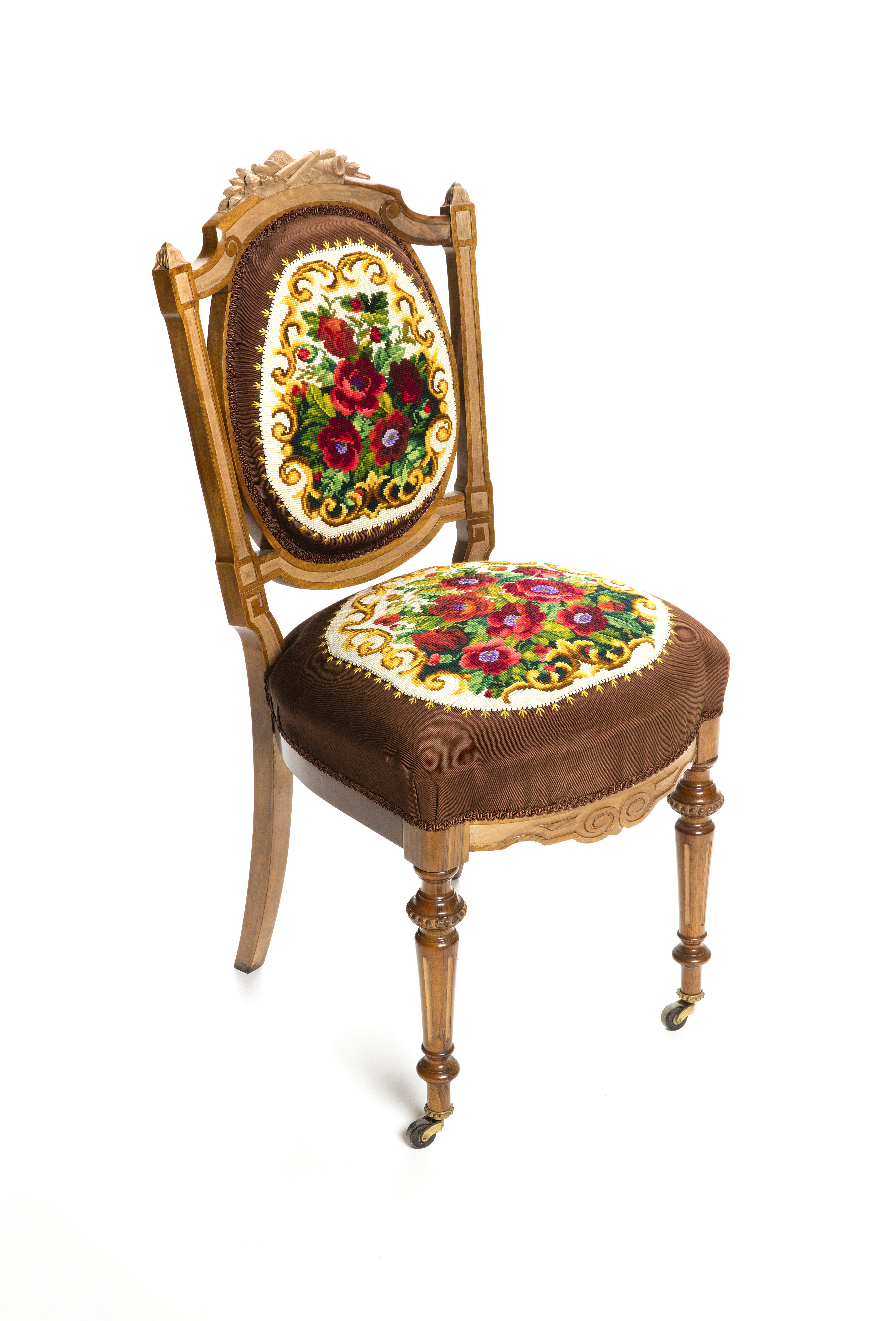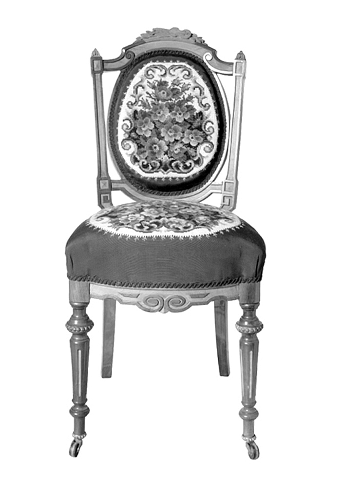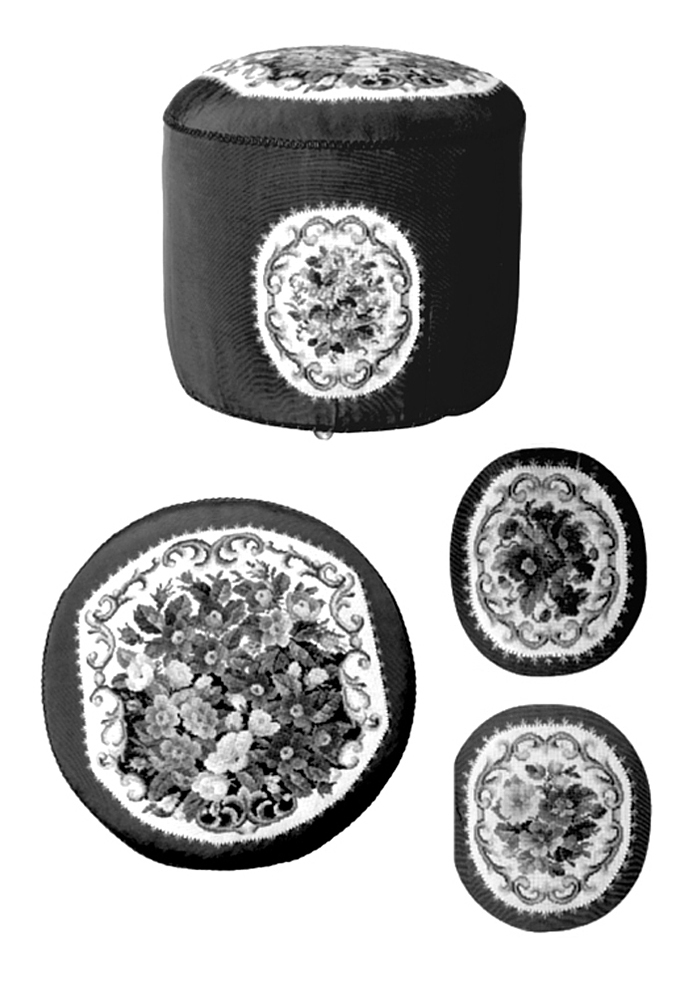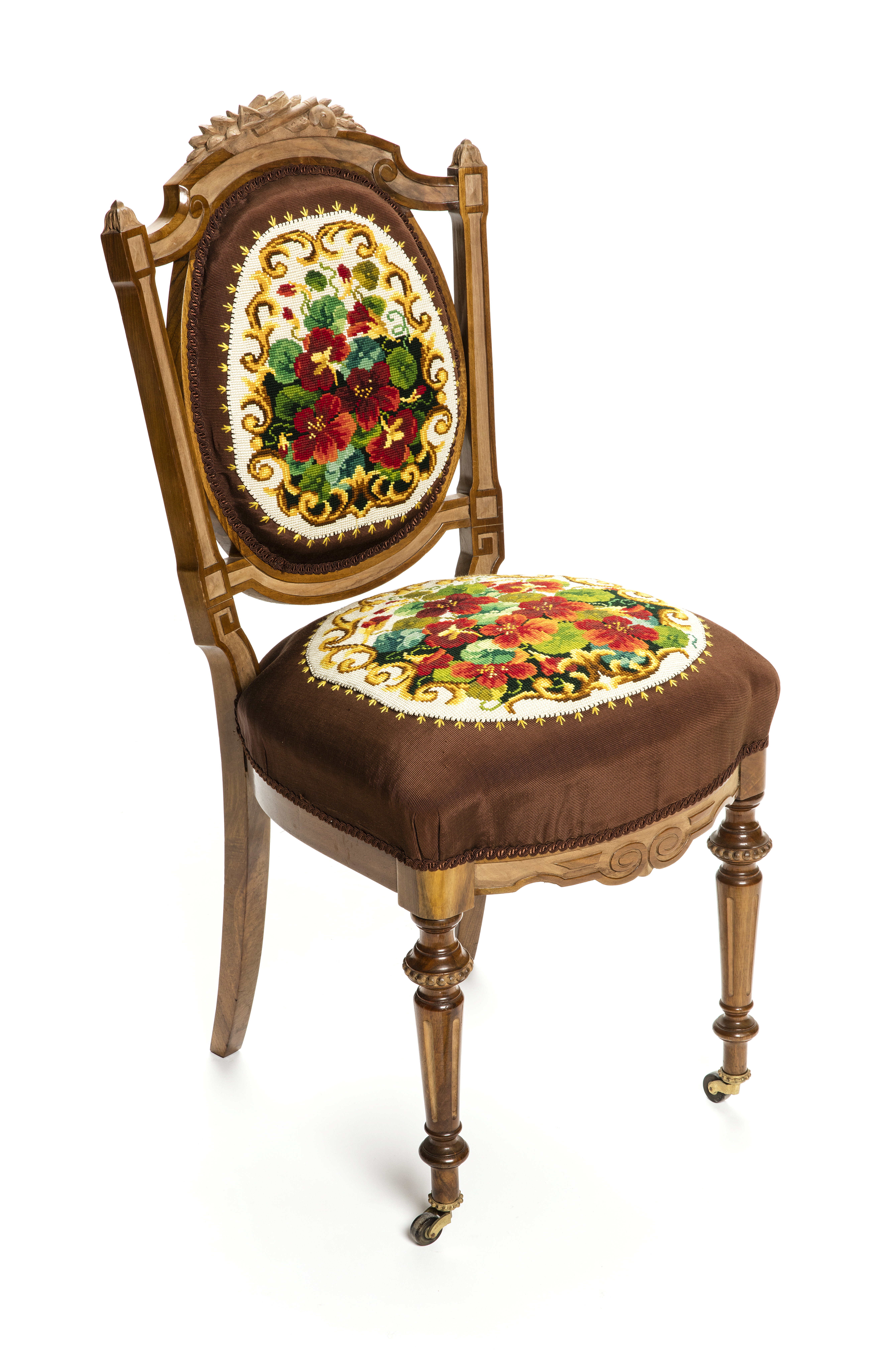 MÖBELUPPSATS bestående av bord, hylla, notportfölj med fotställ, hörnskåp med nyckel, soffa, två länstolar, åtta stolar, en avlång puff, två runda puffar, en trymå, två undergardiner med fyra hållare, två lufter övergardiner med två kappor, fyra broderade bårder, två ovala broderier jämte en lös frans, fyra gardinhållare, fyra gardinrosetter, två kornischer, två gardinbrädor, ett spjällsnöre, en matta samt överblivet garn. Möbeluppsatsen har till 1916 stått på Ericslund, Västerljungs socken, Södermanland, därefter i hushållerskans rum i hallwylska palatset. Möbeluppsatsen, utom trymån, är inköpt 1873 hos möbelhandlaren D. Heyman, Hamburg. Alla broderier har utförts av Wilhelmina von Hallwyl, åren 1870-1873.