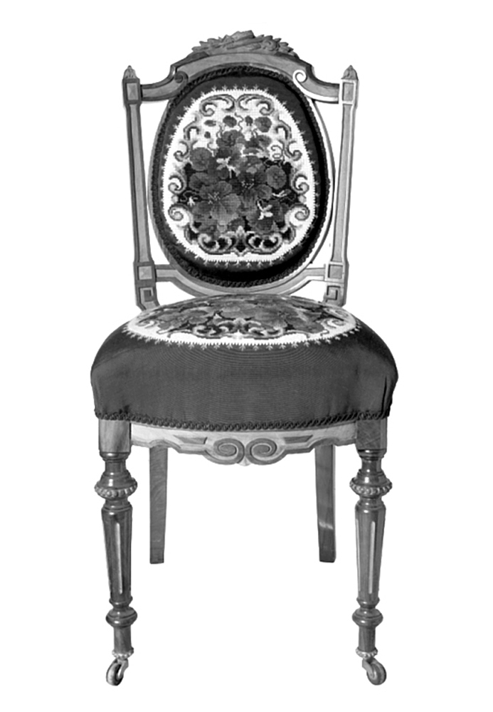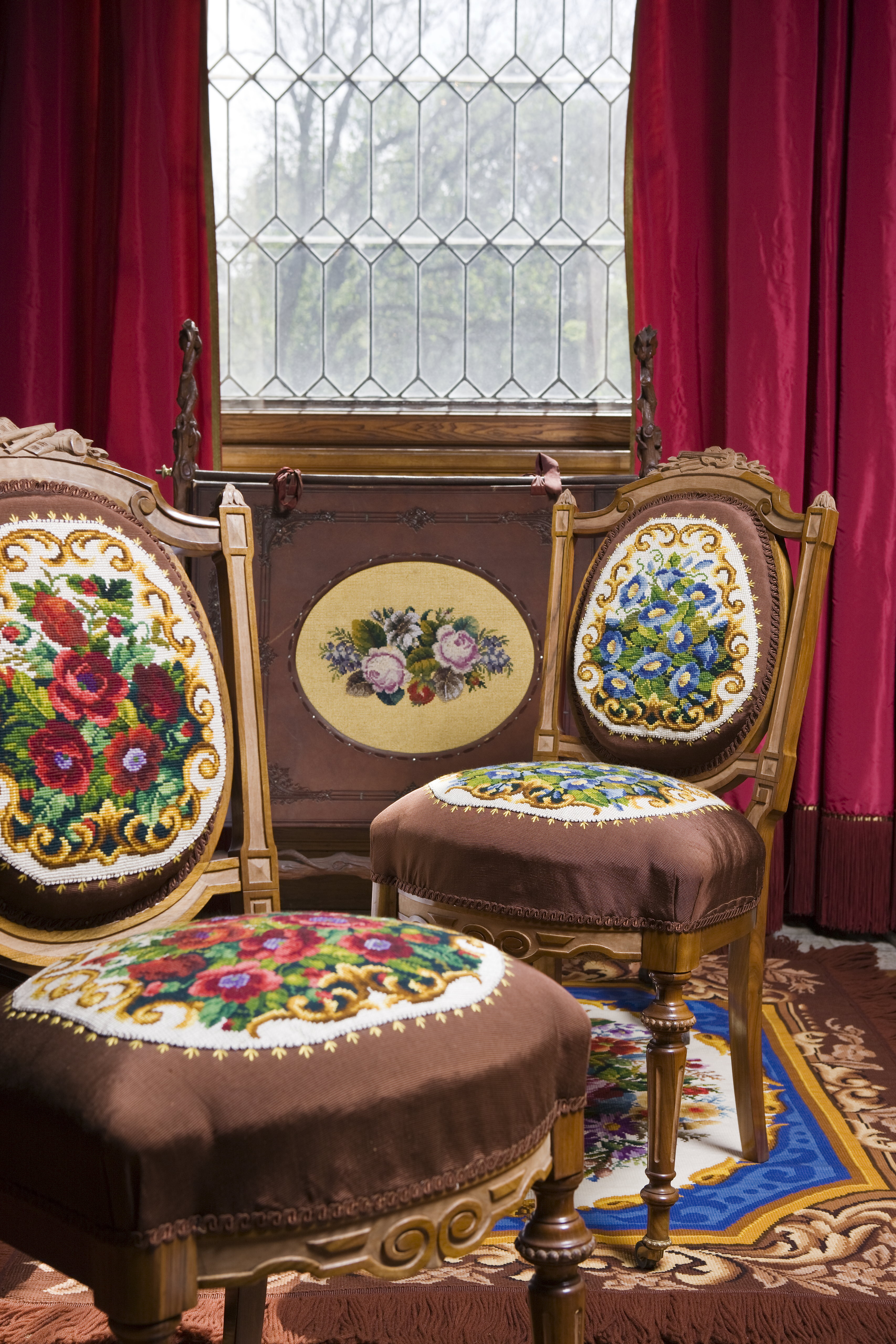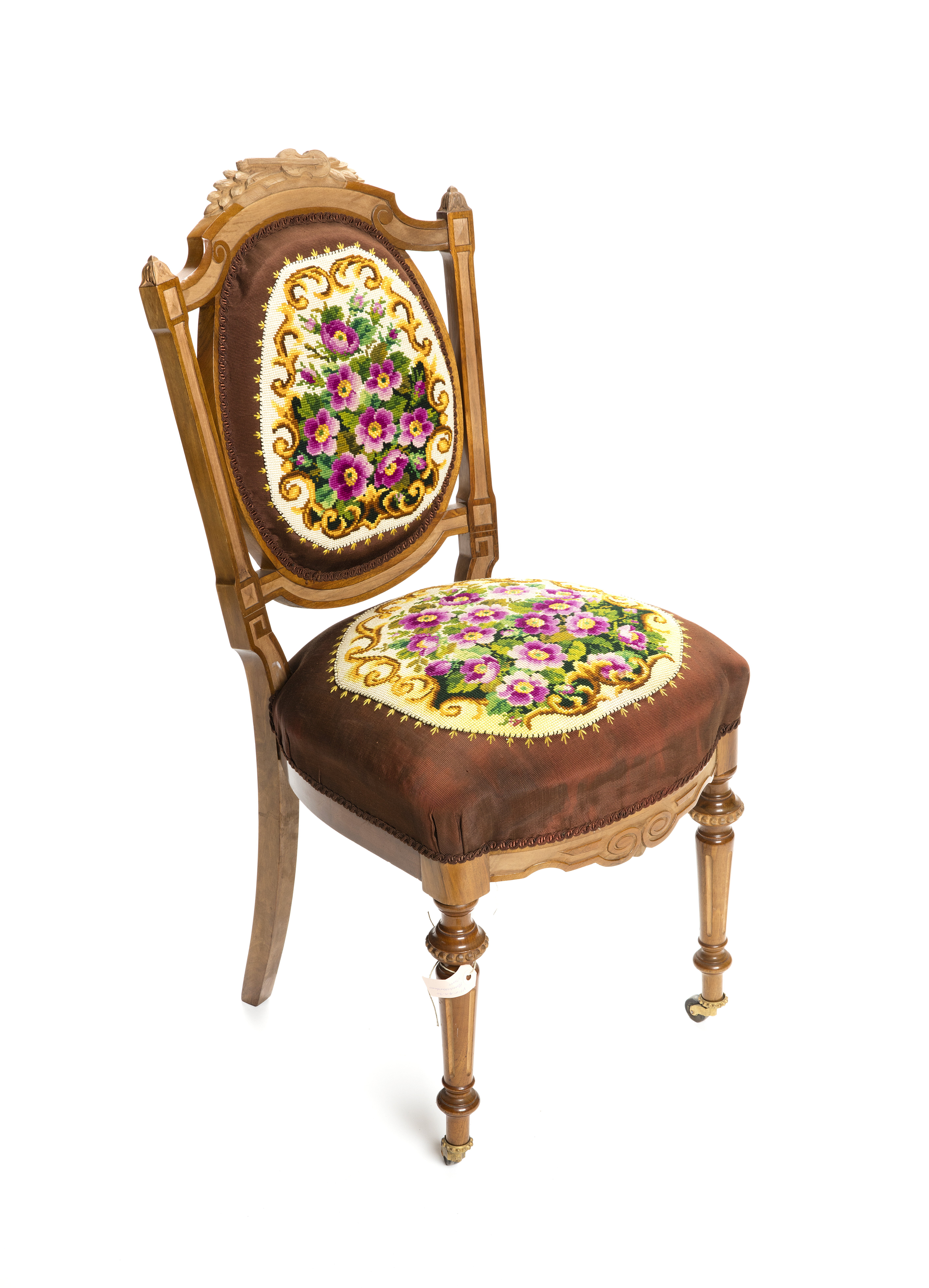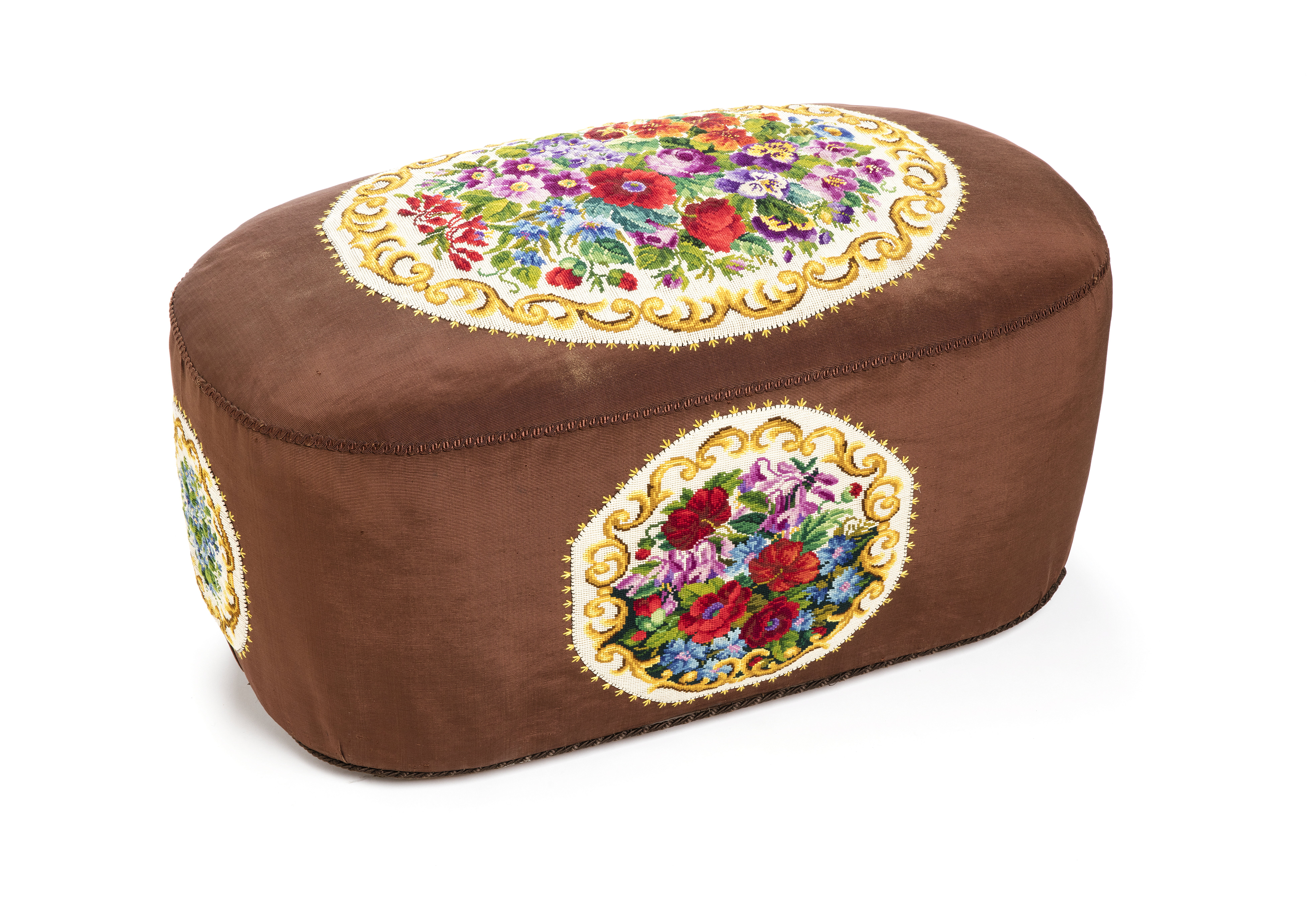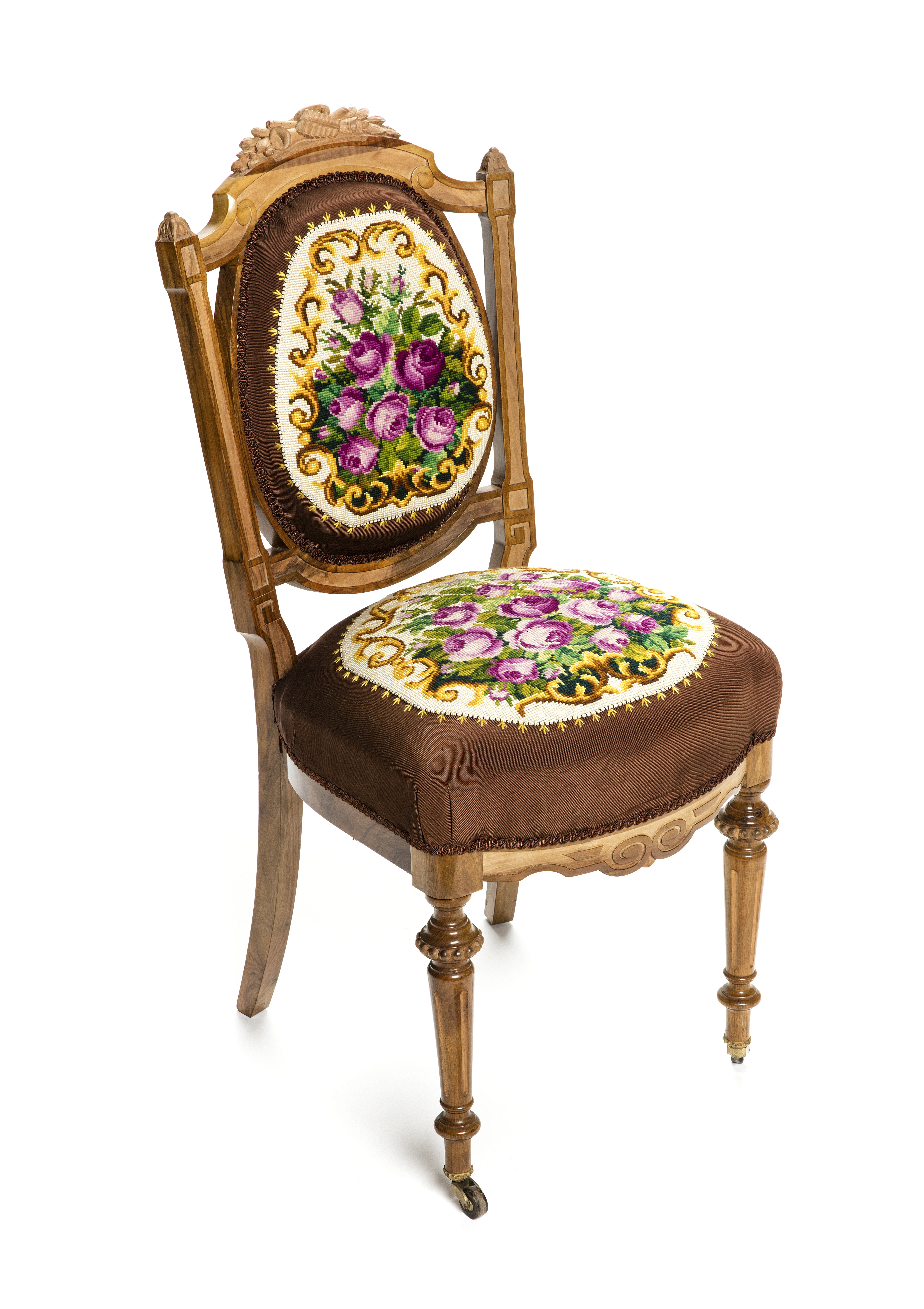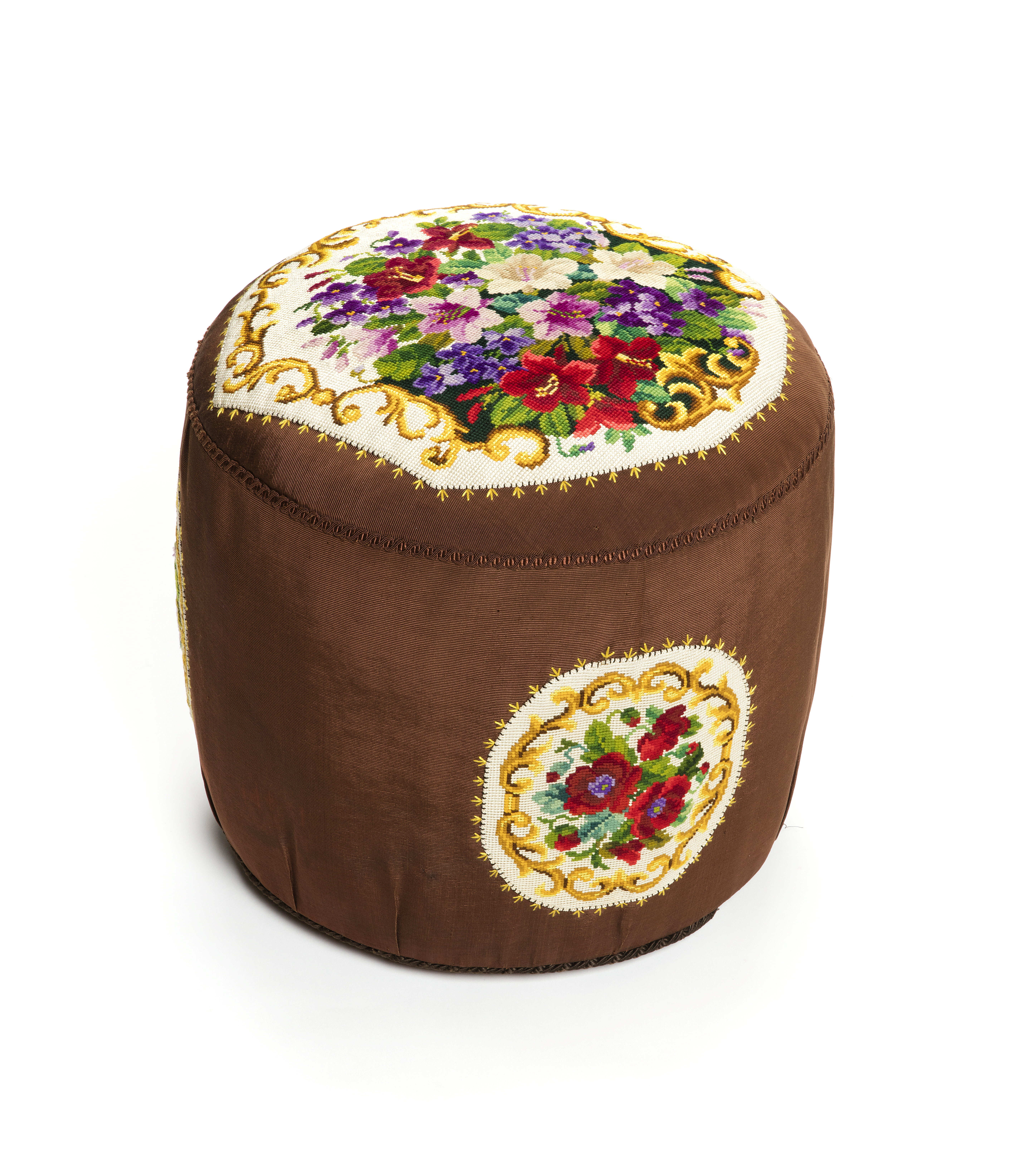 MÖBELUPPSATS bestående av bord, hylla, notportfölj med fotställ, hörnskåp med nyckel, soffa, två länstolar, åtta stolar, en avlång puff, två runda puffar, en trymå, två undergardiner med fyra hållare, två lufter övergardiner med två kappor, fyra broderade bårder, två ovala broderier jämte en lös frans, fyra gardinhållare, fyra gardinrosetter, två kornischer, två gardinbrädor, ett spjällsnöre, en matta samt överblivet garn. Möbeluppsatsen har till 1916 stått på Ericslund, Västerljungs socken, Södermanland, därefter i hushållerskans rum i hallwylska palatset. Möbeluppsatsen, utom trymån, är inköpt 1873 hos möbelhandlaren D. Heyman, Hamburg. Alla broderier har utförts av Wilhelmina von Hallwyl, åren 1870-1873.