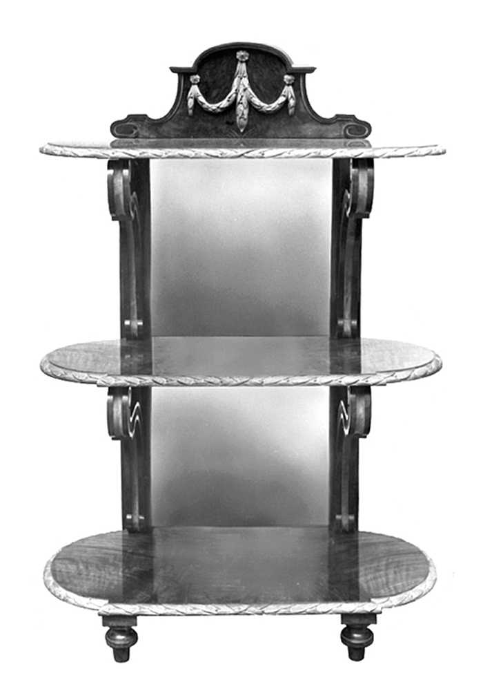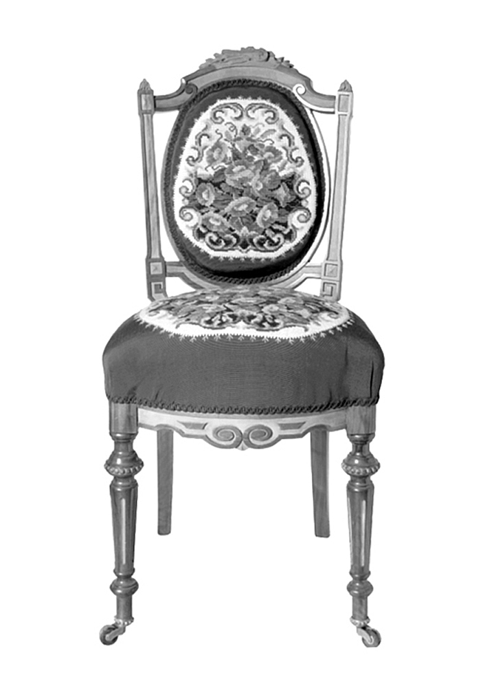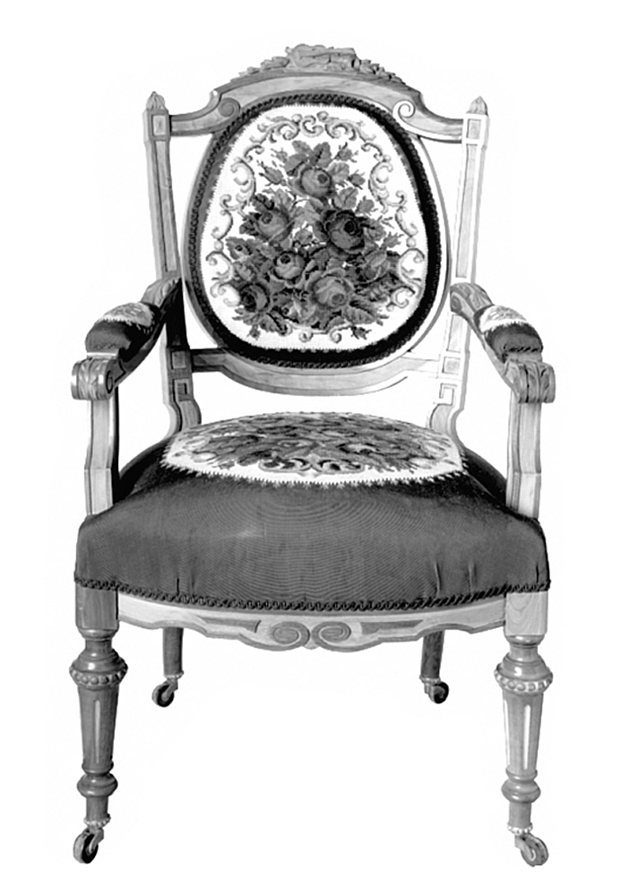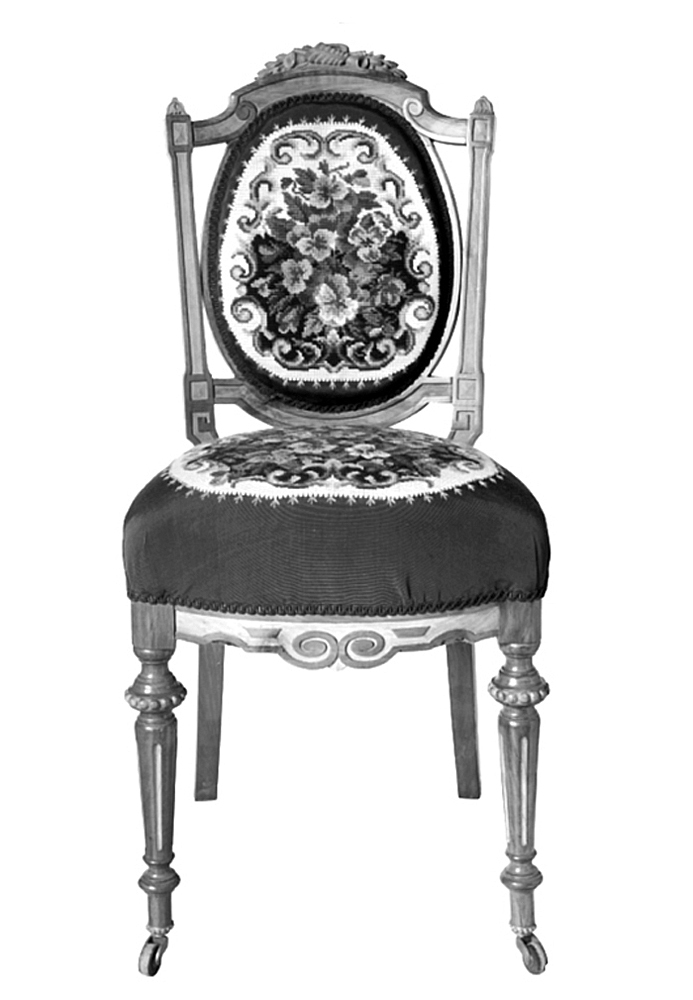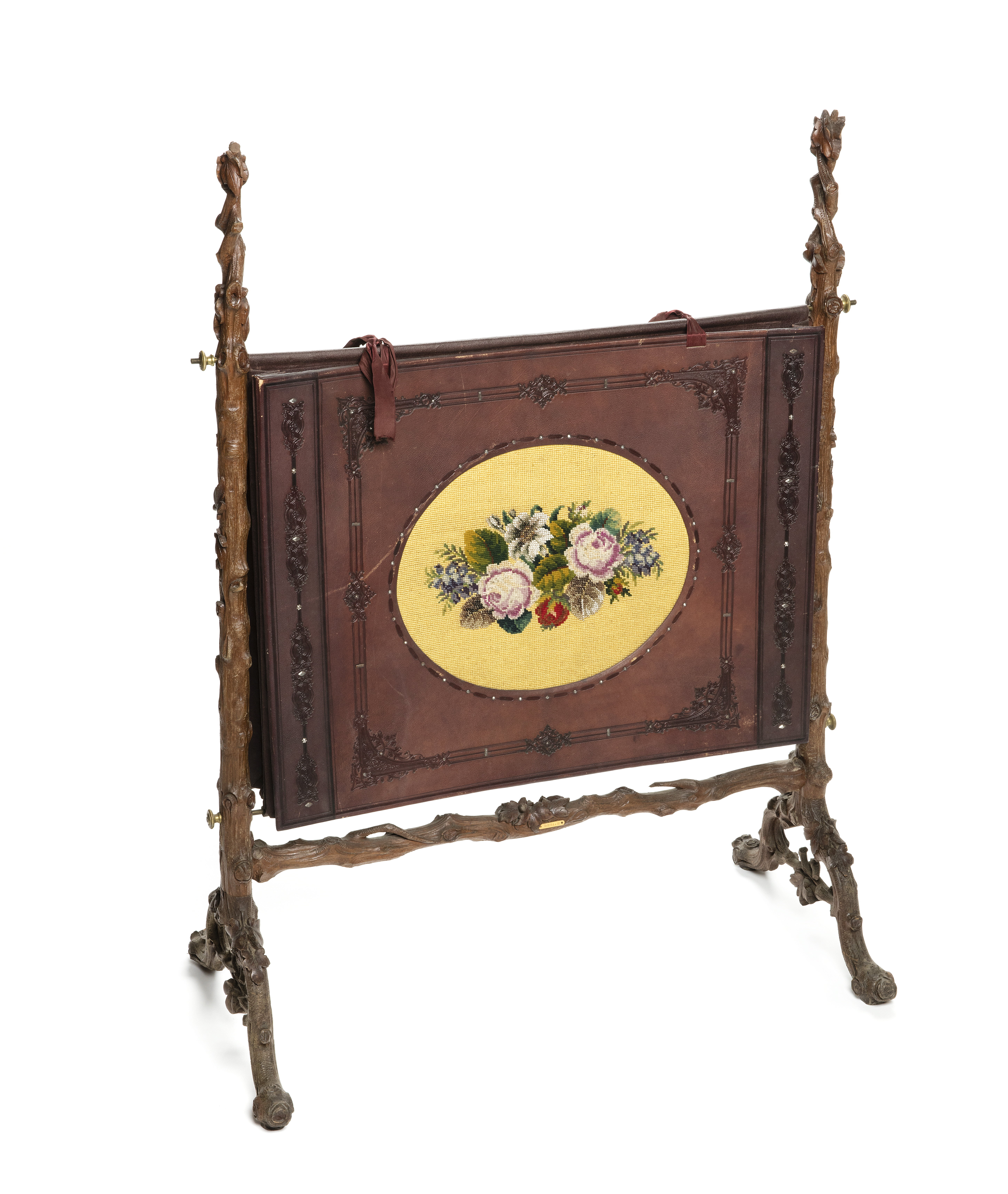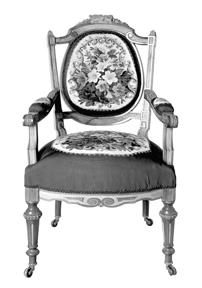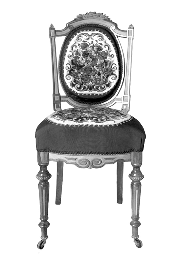 MÖBELUPPSATS bestående av bord, hylla, notportfölj med fotställ, hörnskåp med nyckel, soffa, två länstolar, åtta stolar, en avlång puff, två runda puffar, en trymå, två undergardiner med fyra hållare, två lufter övergardiner med två kappor, fyra broderade bårder, två ovala broderier jämte en lös frans, fyra gardinhållare, fyra gardinrosetter, två kornischer, två gardinbrädor, ett spjällsnöre, en matta samt överblivet garn. Möbeluppsatsen har till 1916 stått på Ericslund, Västerljungs socken, Södermanland, därefter i hushållerskans rum i hallwylska palatset. Möbeluppsatsen, utom trymån, är inköpt 1873 hos möbelhandlaren D. Heyman, Hamburg. Alla broderier har utförts av Wilhelmina von Hallwyl, åren 1870-1873.