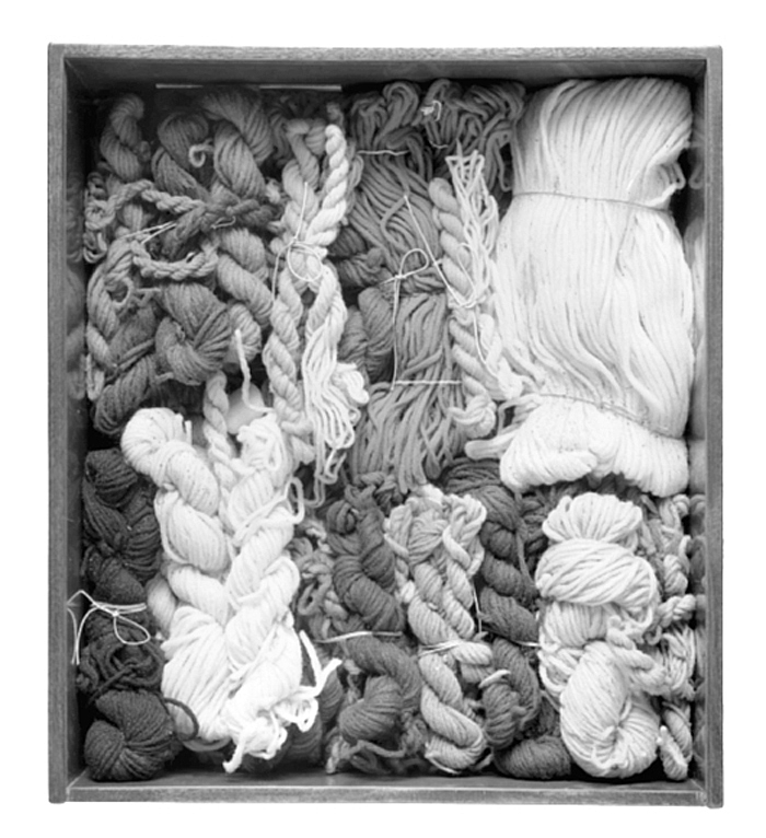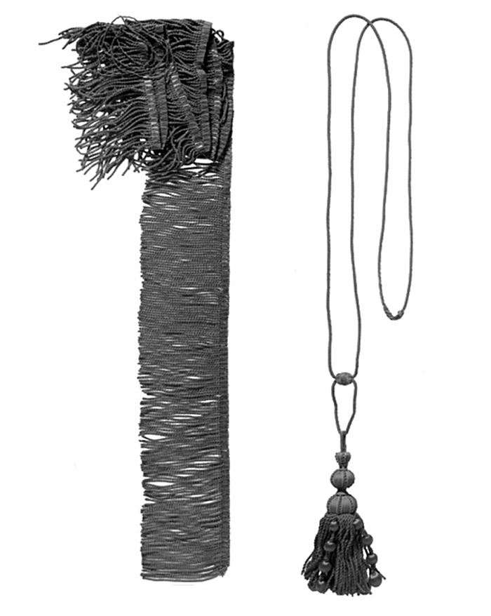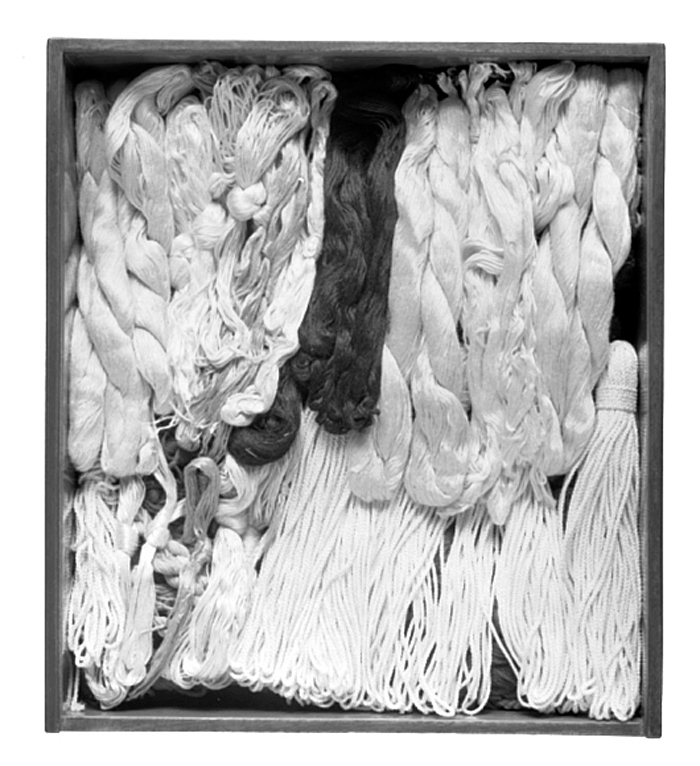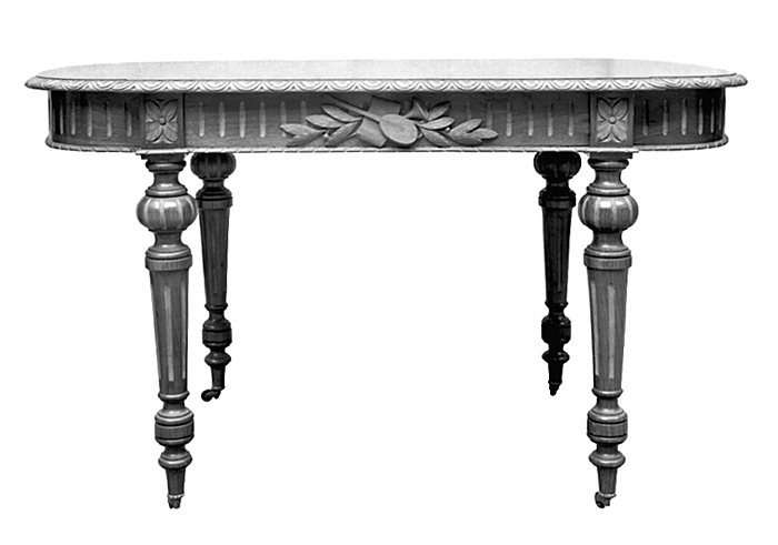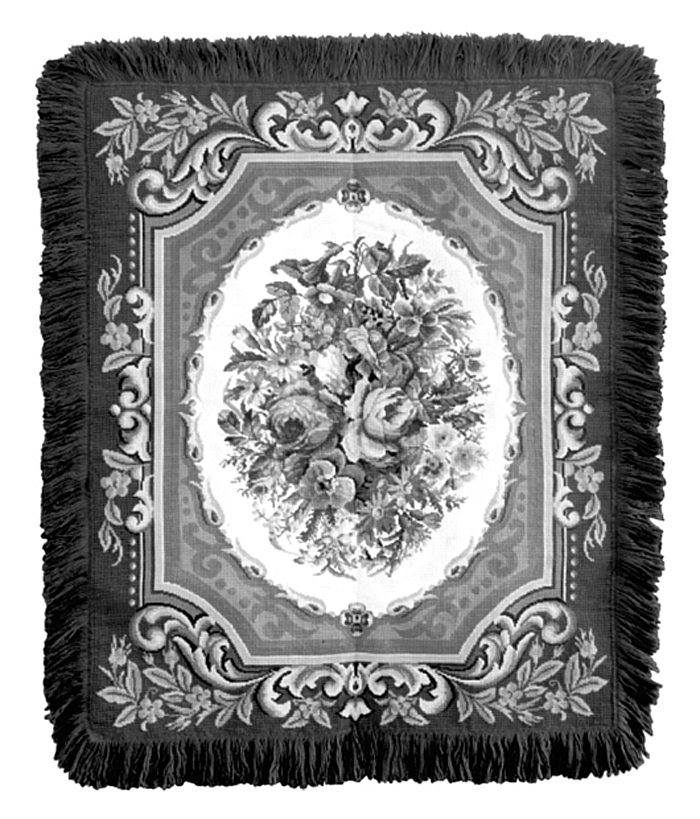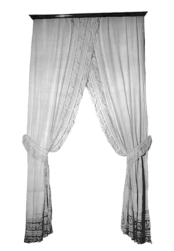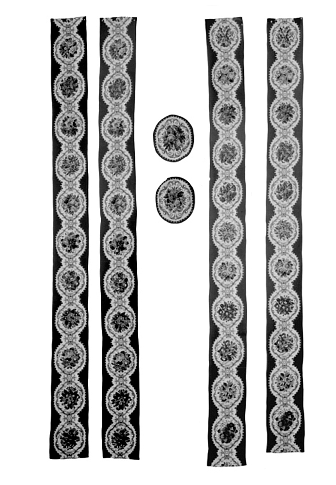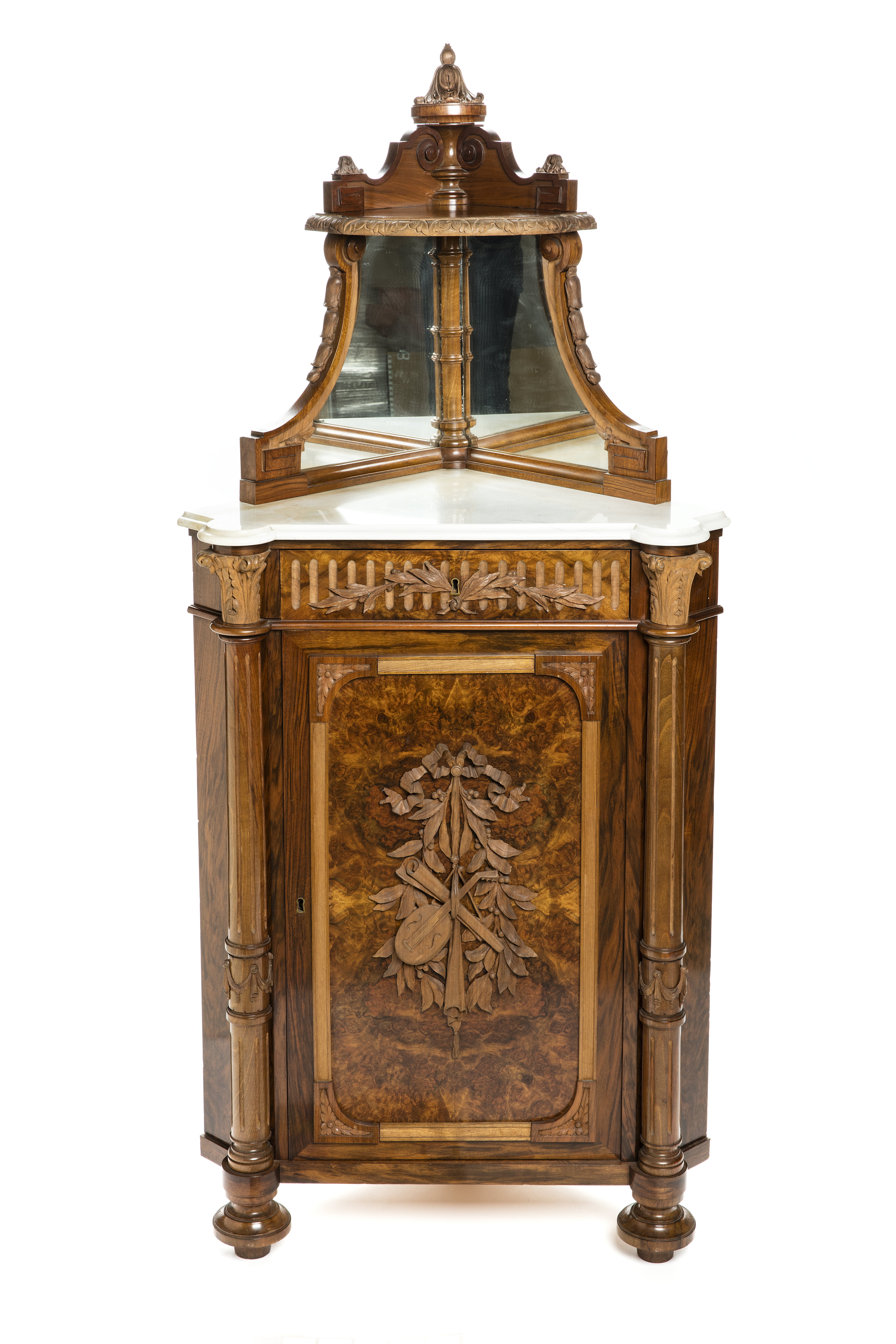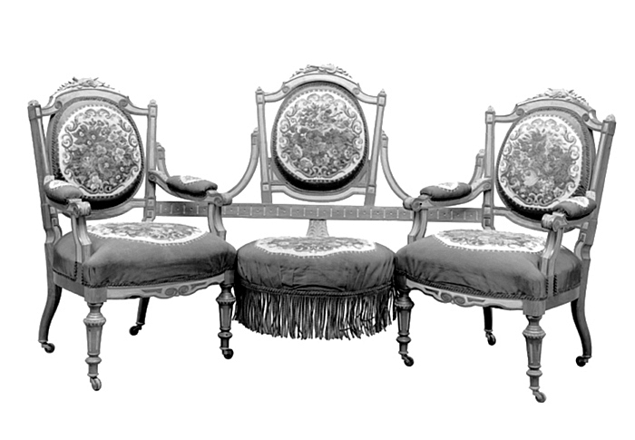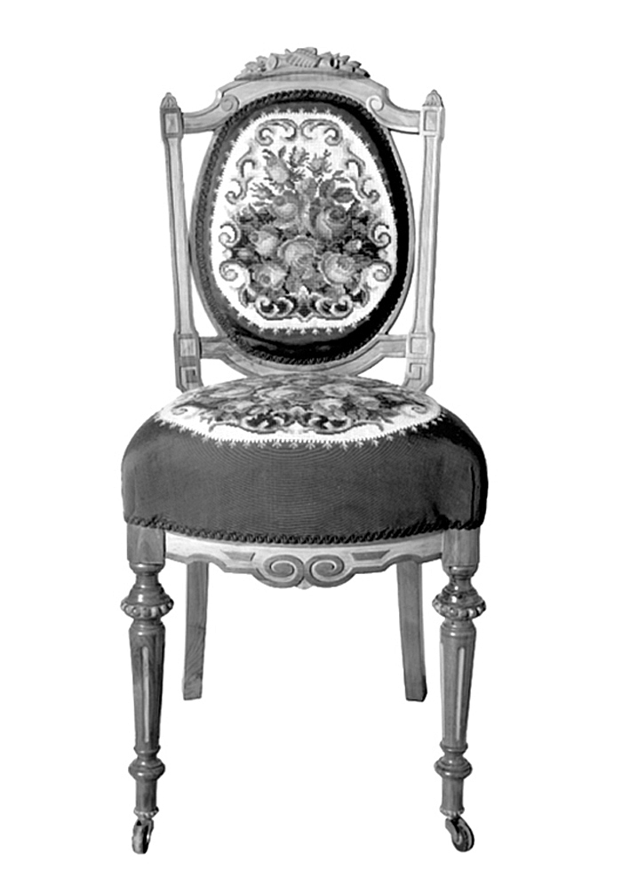 MÖBELUPPSATS bestående av bord, hylla, notportfölj med fotställ, hörnskåp med nyckel, soffa, två länstolar, åtta stolar, en avlång puff, två runda puffar, en trymå, två undergardiner med fyra hållare, två lufter övergardiner med två kappor, fyra broderade bårder, två ovala broderier jämte en lös frans, fyra gardinhållare, fyra gardinrosetter, två kornischer, två gardinbrädor, ett spjällsnöre, en matta samt överblivet garn. Möbeluppsatsen har till 1916 stått på Ericslund, Västerljungs socken, Södermanland, därefter i hushållerskans rum i hallwylska palatset. Möbeluppsatsen, utom trymån, är inköpt 1873 hos möbelhandlaren D. Heyman, Hamburg. Alla broderier har utförts av Wilhelmina von Hallwyl, åren 1870-1873.