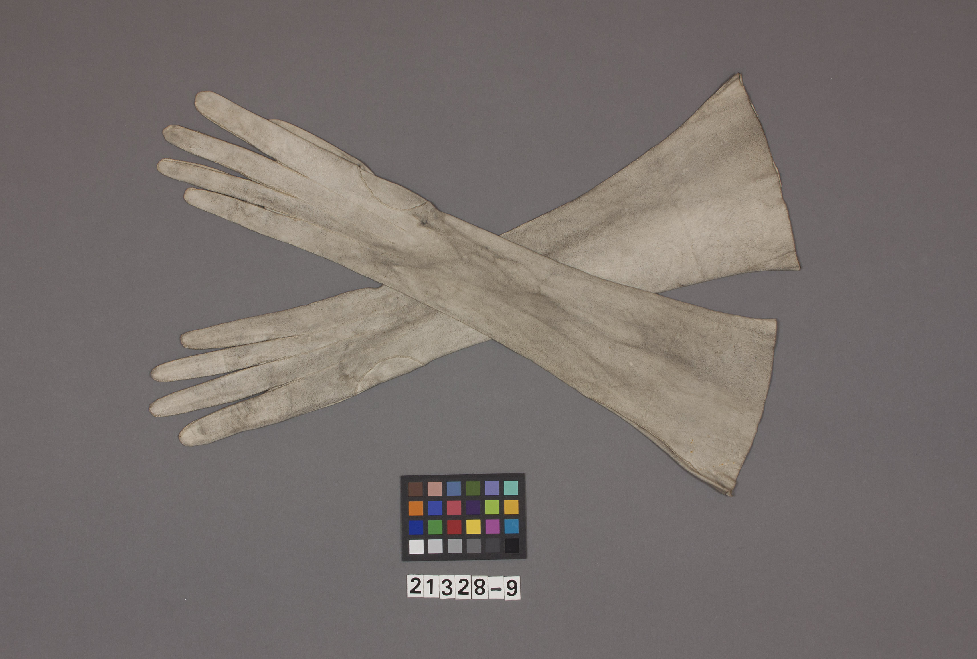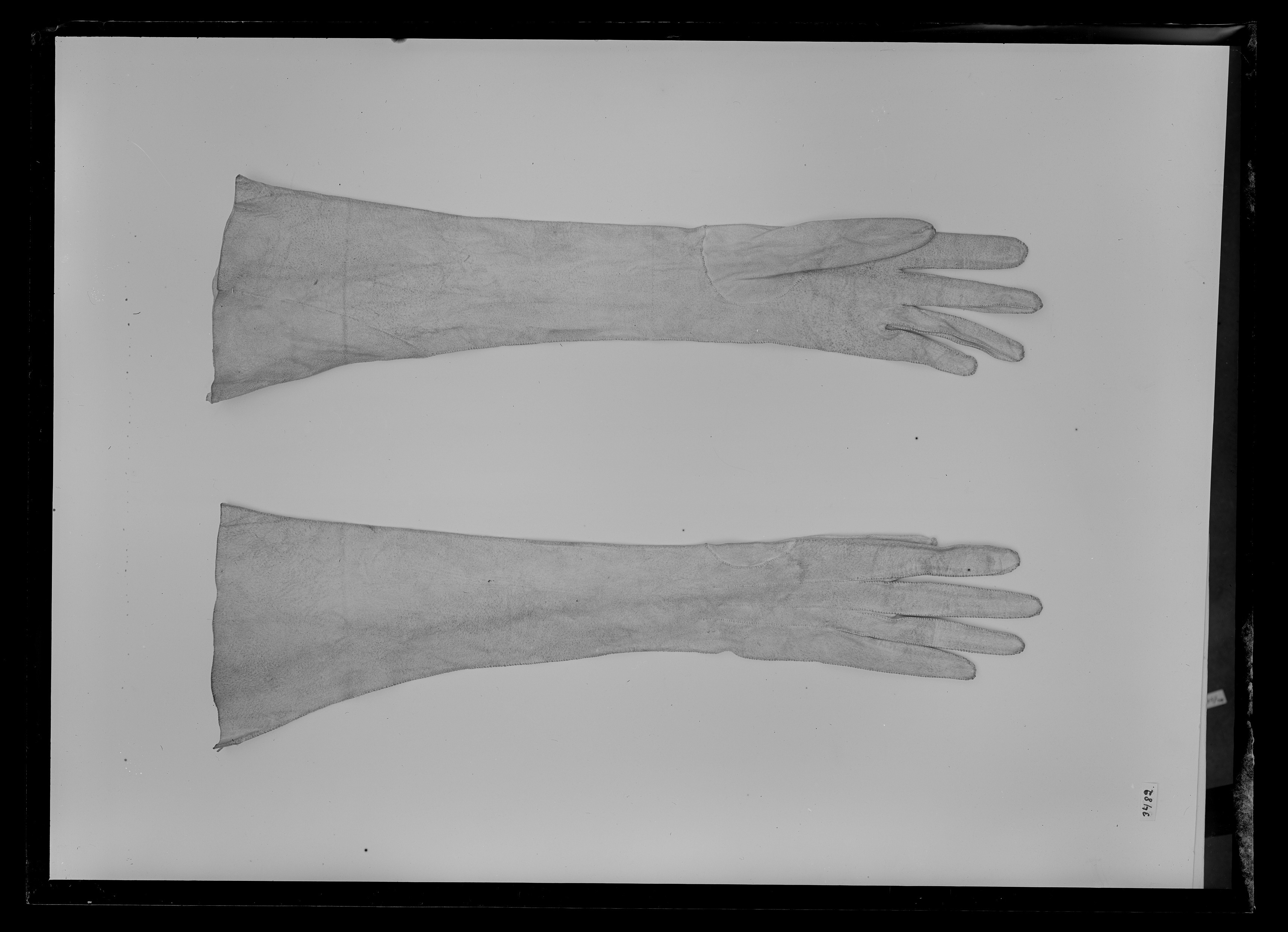 Lång fingerhandske av vit mocka. Sydd av ett stort skinn som i övre delen skarvats med ett triangulärt stycke. Långa smala fingrar sydda med smala kilar. Tre stickningar på ryggen fram till fingersömmarna.