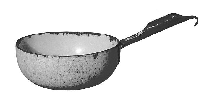 SKOPA Av emaljerad stålplåt; emaljen utanpå gråspräcklig, inuti vit. Nästan halvsfärisk, med svagt skålig botten samt utstående runt skaft. Skaft blåemaljerat, rännformigt, på mitten en från vardera kanten inåt omböjd flik, flikarna mötande varandra i mitten och bildande en rörformig del; skaftets yttre del insvängd från kanterna och avsmalnande utåt samt med nedåt till en hake omböjd ytterände; inneränden nedböjd i en hjärtformig flik, fäst med tre nitar. Höjd: 7,5 cm.; diameter: 18,6 cm.
