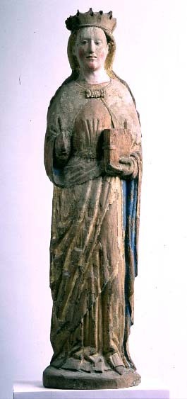 Kondition: höger underarm med attribut bortbruten, kronan fragmentarisk. Färg: karnationen välbevarad, för övrigt fragmentarisk.