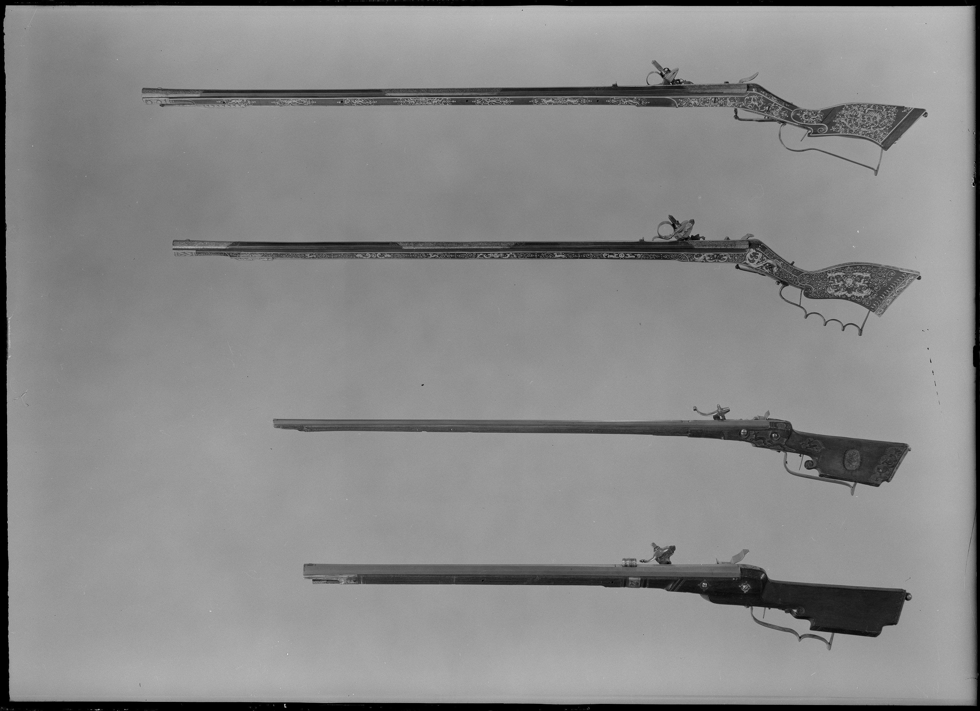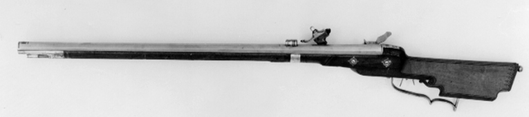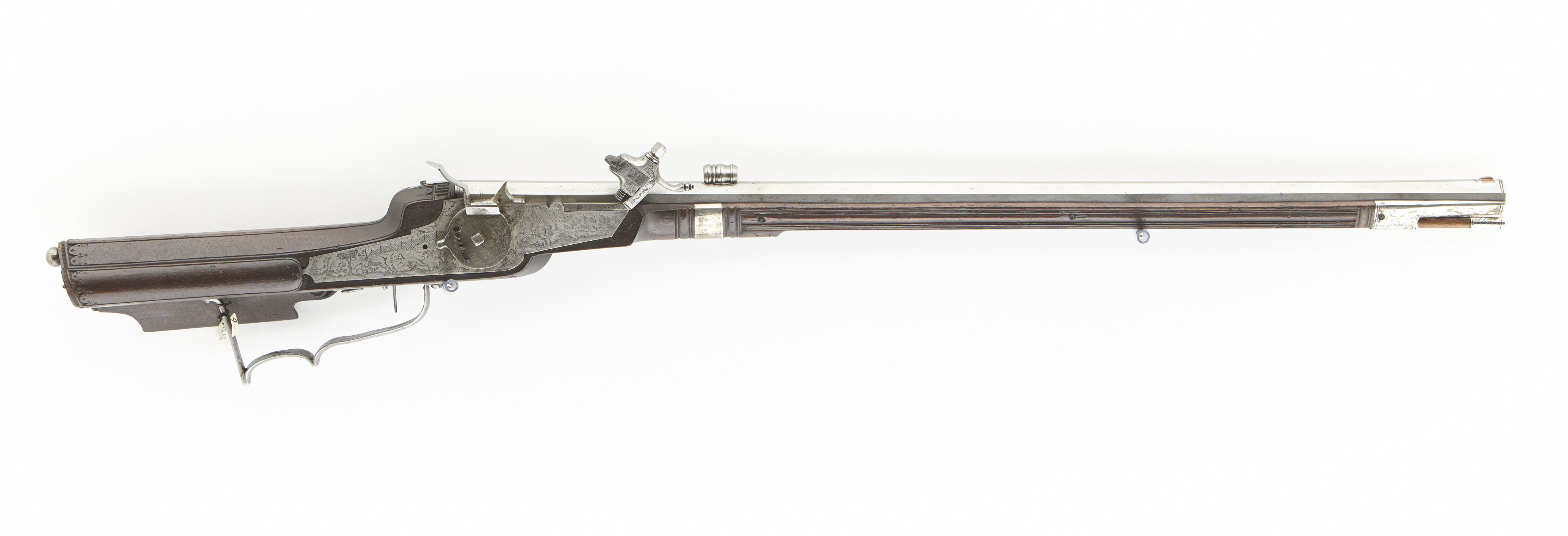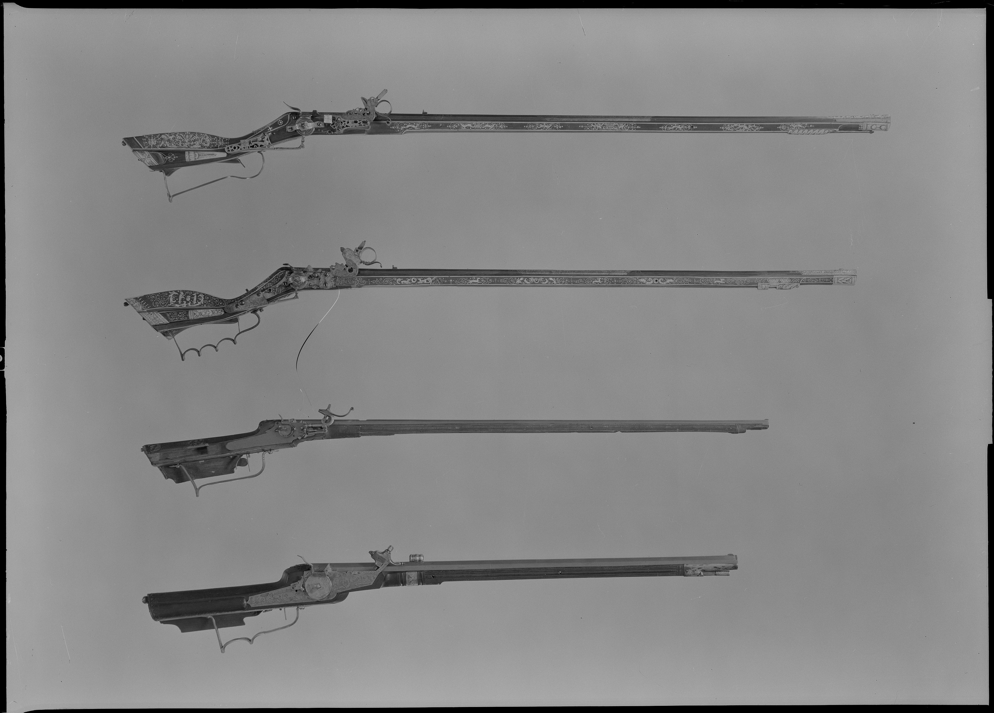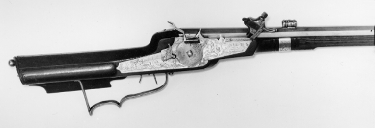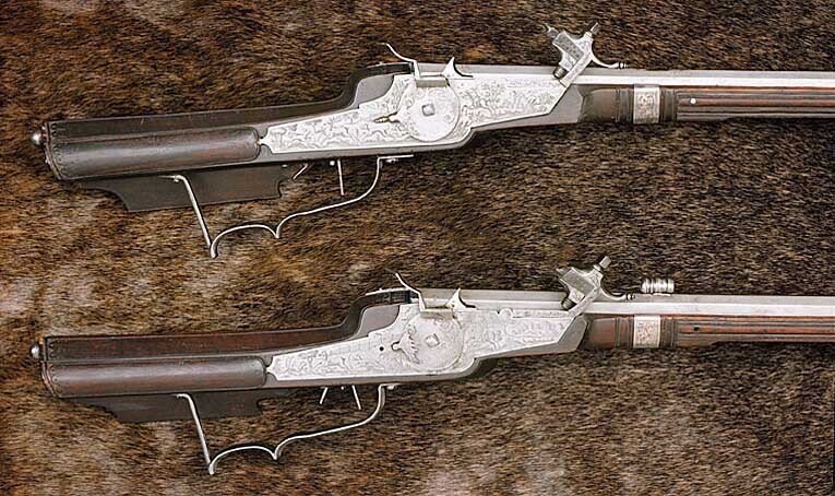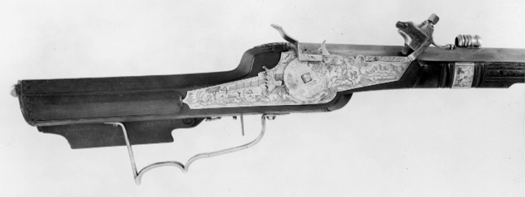 Två stycken Räfflade Bössor med Hjul Lås utstuckne, och på Piporne hvälfde Syften; Ståckarne af brunt träd beslagne med Silfver, den ena litet sönder vid hjulen