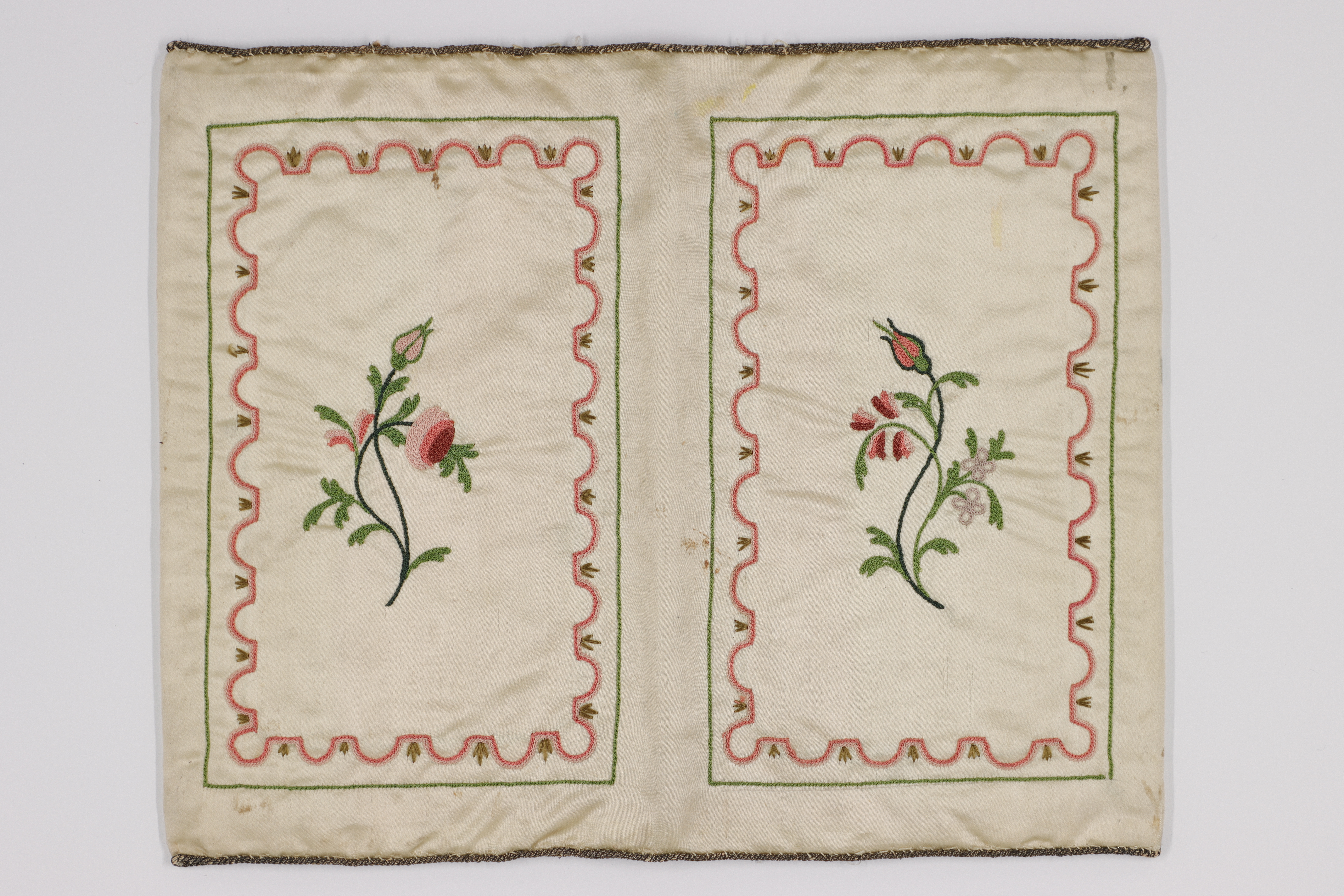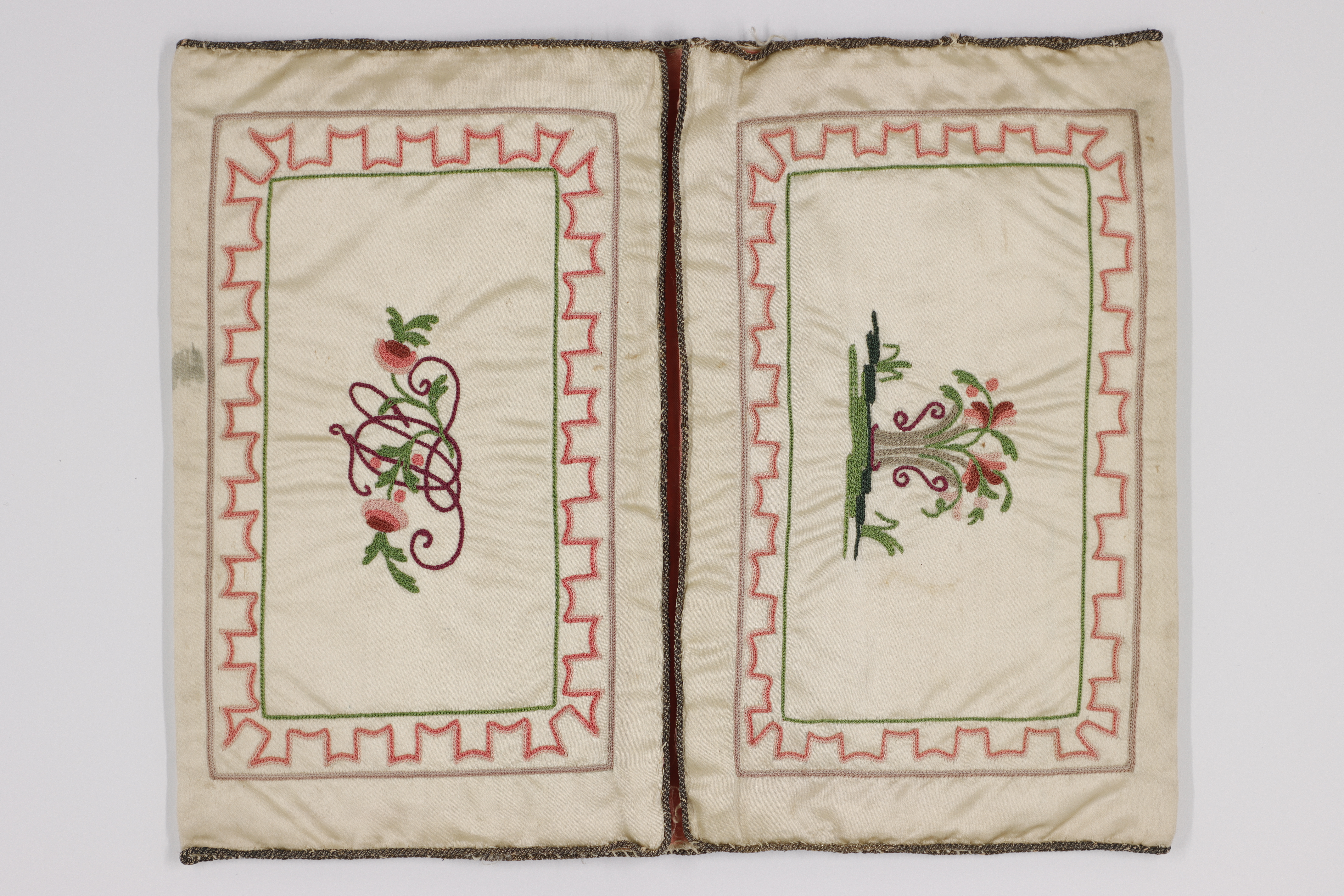 Plånbok av gulvitt atlassiden med silkebroderier i främst gröna och ljusröda toner. Insidan har två fickor kantade med snodd av nu silverfärgad metalltråd. Broderier av samma typ som utsidan.Monogram I O L och blomstermotiv inom en ram. Broderiet till största delen utfört i tambursöm. Fickorna fodrade med ljusrött taftsiden. Tunn styvnad av papper.