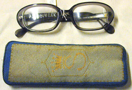 Glasögonfodral av virkat linne. Runt kanten löper linnesnoddar. Snodden och kanten avfodralet är blåa. Bottenfärgen är ljusgrön. Mellan det blå och gröna en rad gula punkter.På ena sidan i gult krönt S omgivet av sexhörning. Motstående sida motiv av blommor iblått, grönt, gult och lila. Inuti fodrad med bomullssammet.