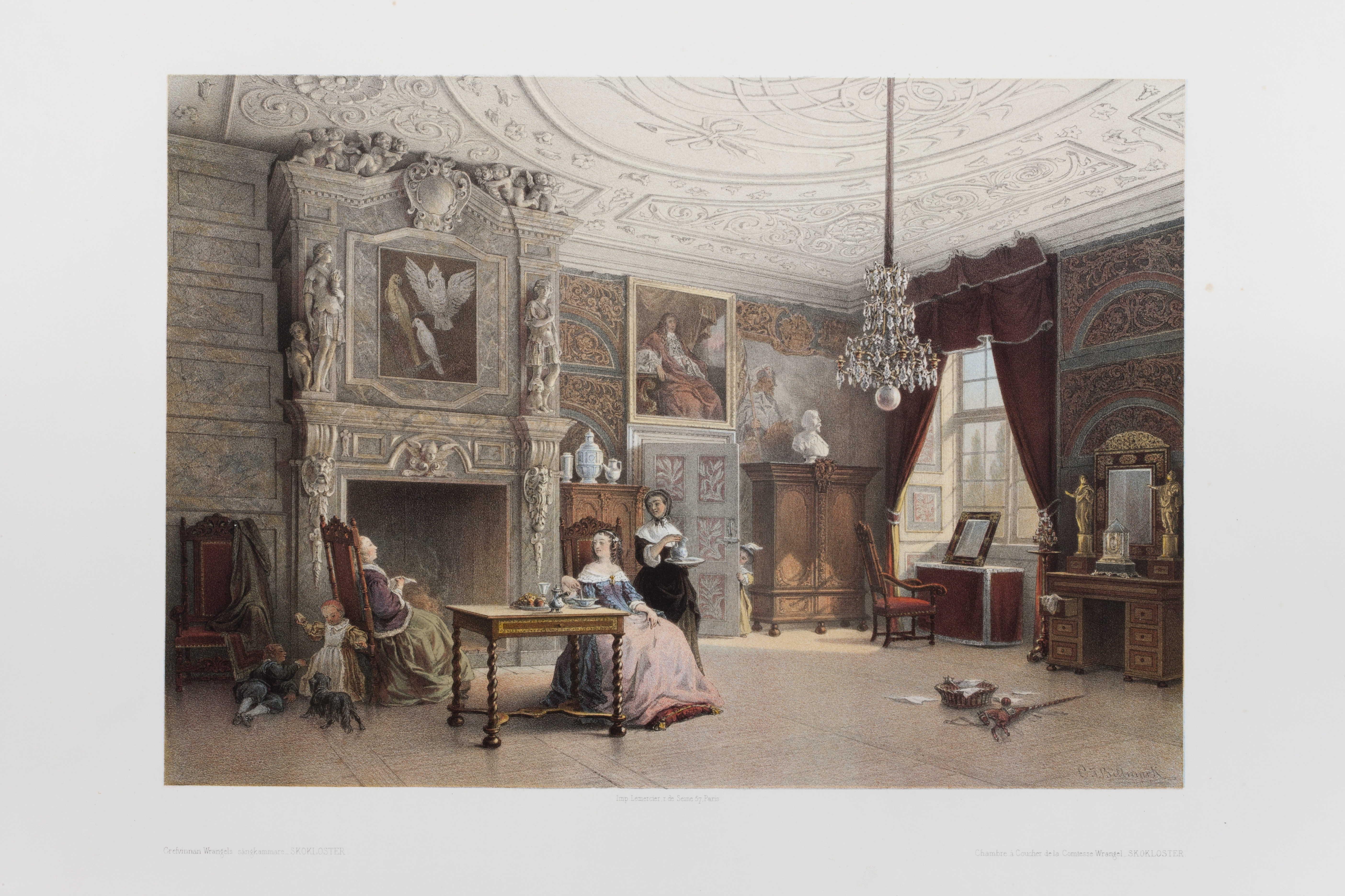 Interiörbild från Grevinnans sängkammare på Skokloster slott. Färglitografi av Carl J. Billmark, 1861-64. Troligen föreställande A M von Haugwitz med barn och tjänarinna samt en dam sittande vid öppna spisen. Nedtill t.v "Grefvinnan Wrangels sängkammare Skokloster". I mitten under bilden: "Imp. Lemercier, r de Seine 57 Paris". Nedtill t.h. "Chambre a Coucher de la Comtesse Wrangel - Skokloster". Sign. nedtill t.h. på bilden: "C J Billmark".