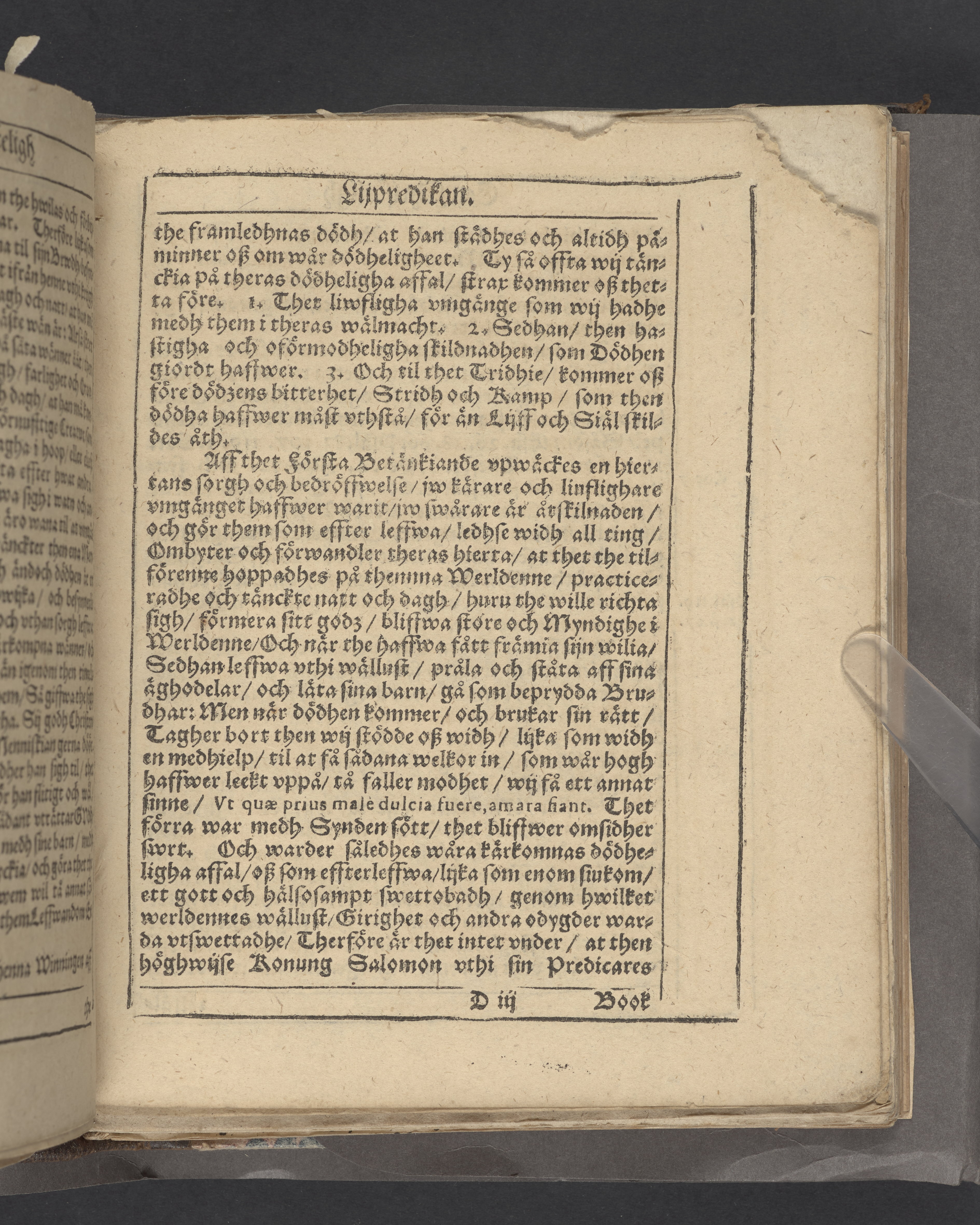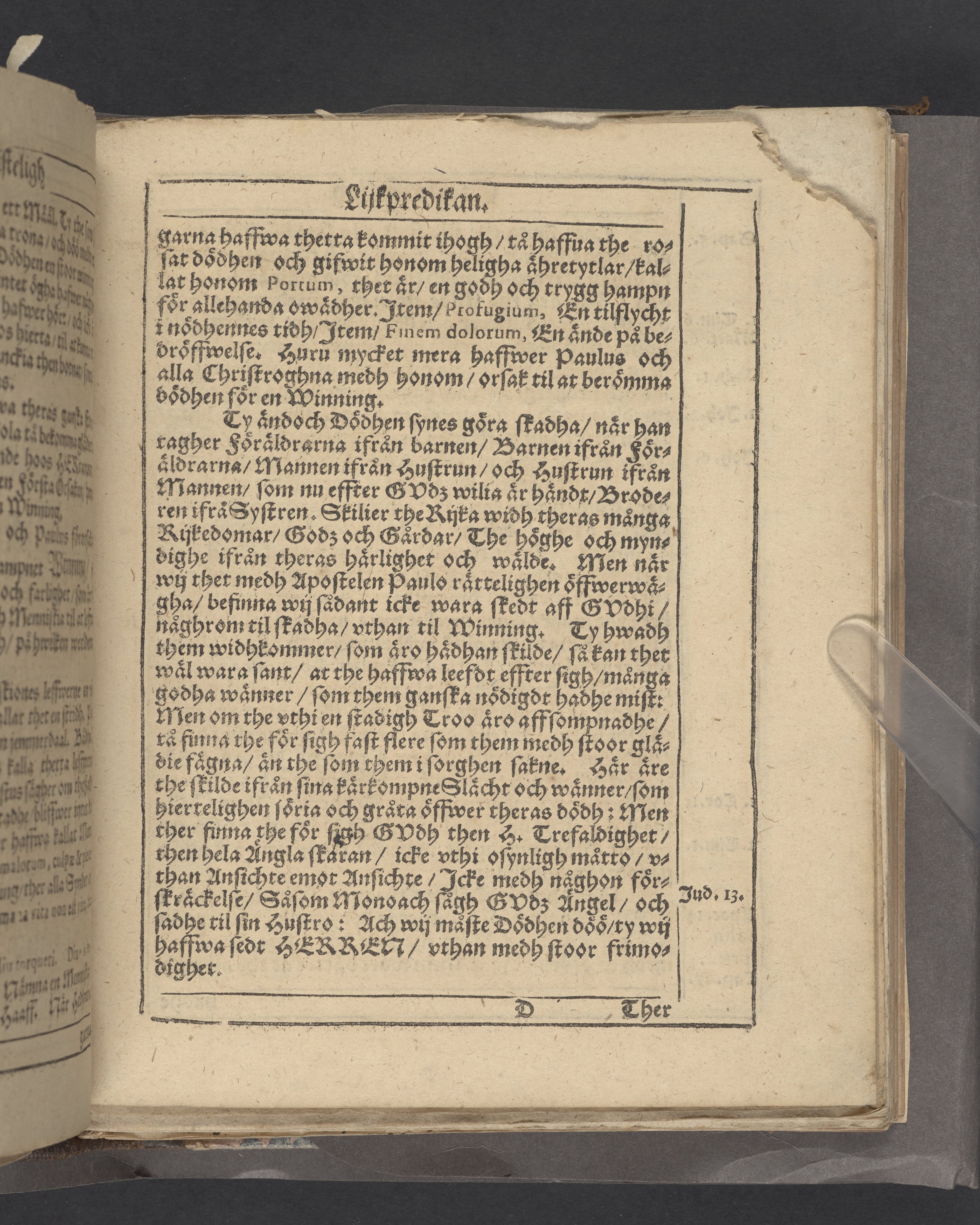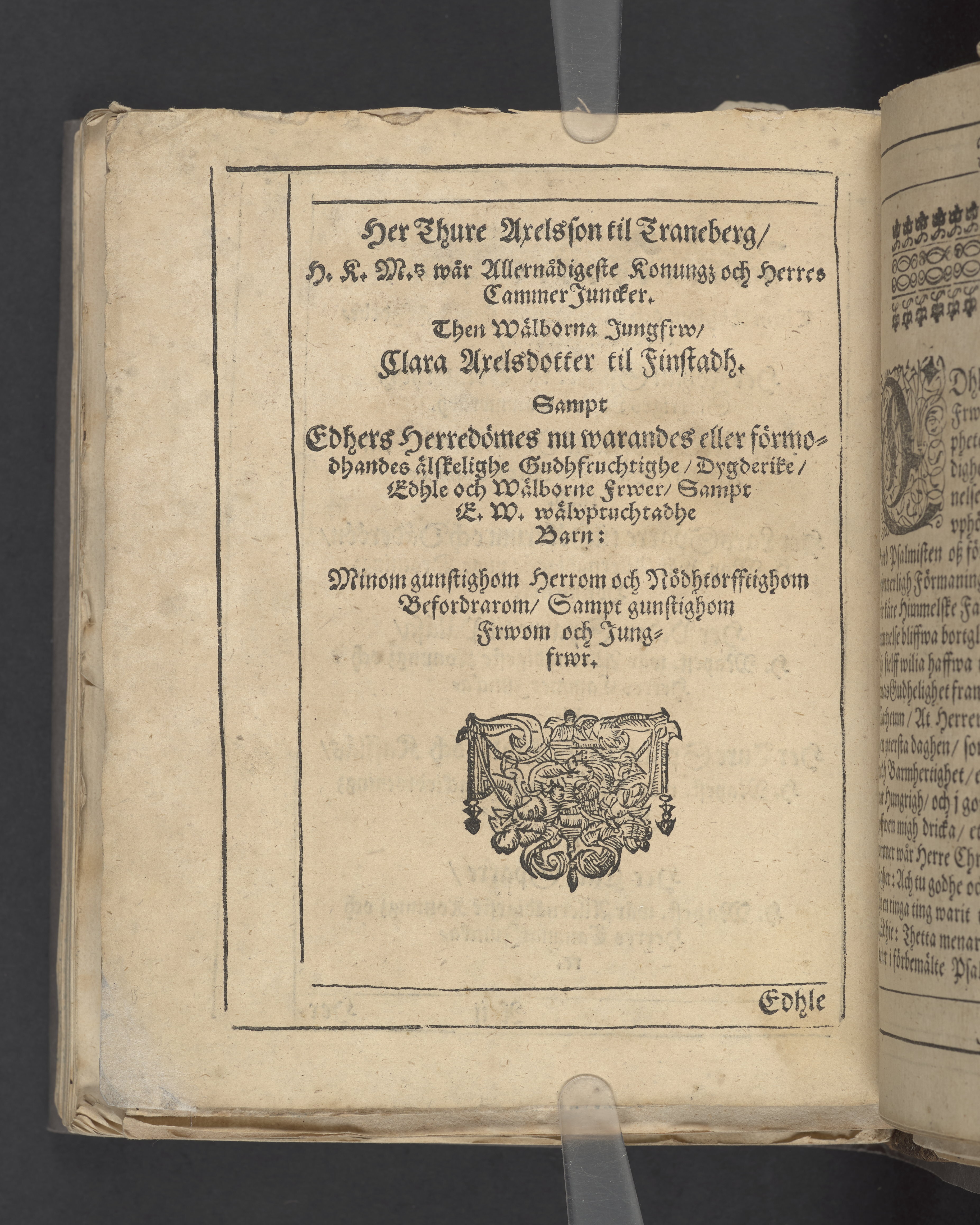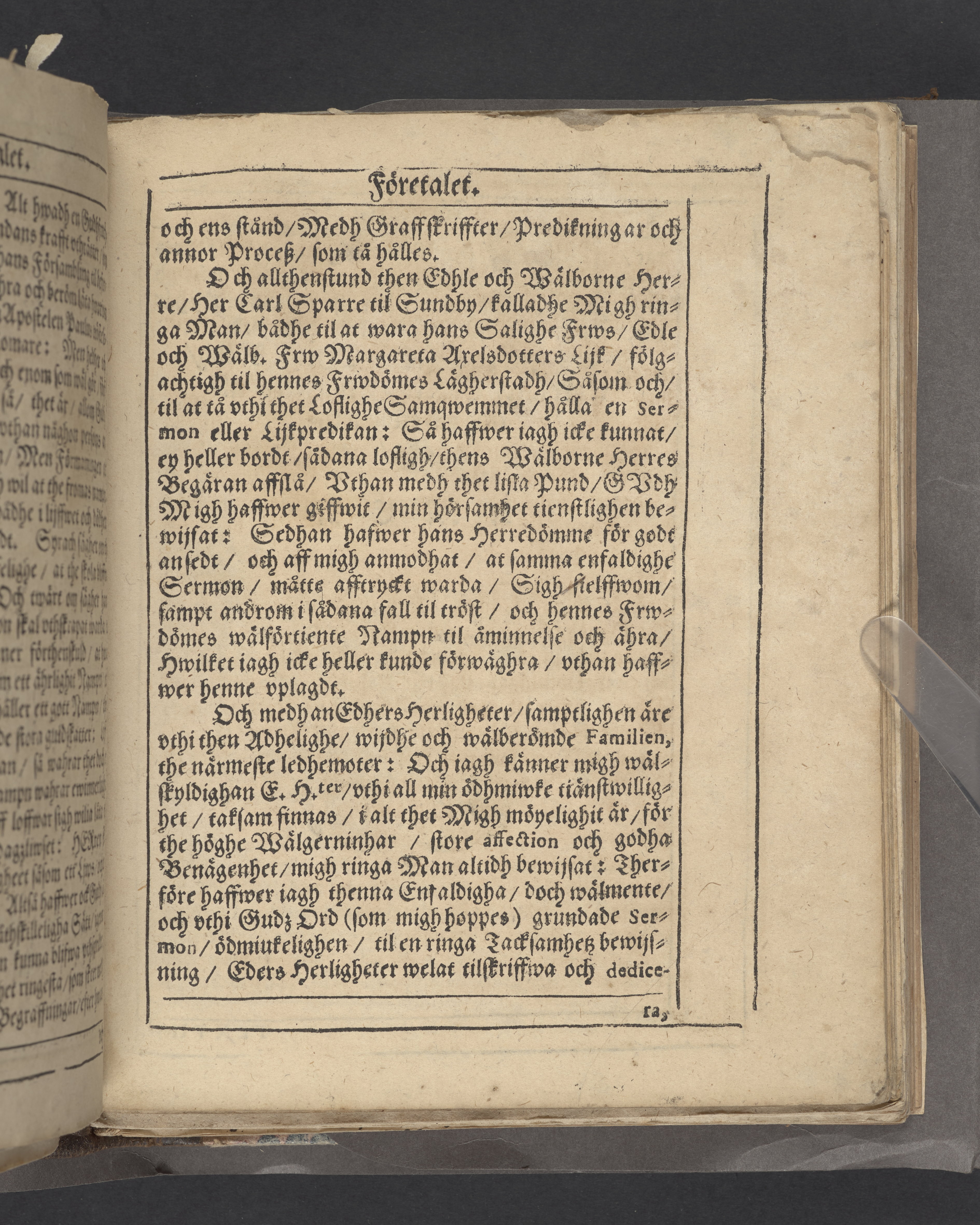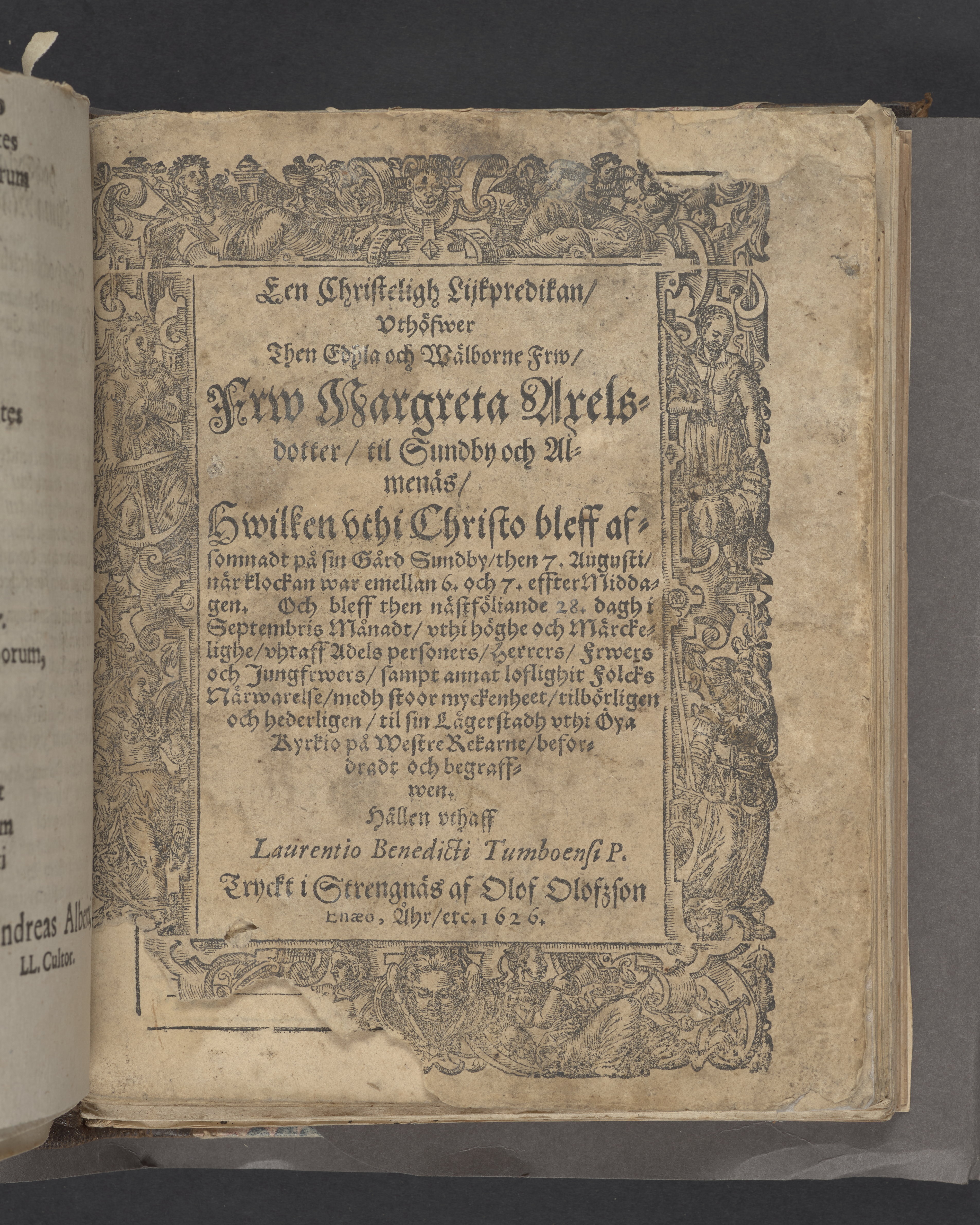 Een christeligh lijkpredikan, vthöfwer then edhla och wälborne frw, frw Margreta Axelsdotter, til Sundby och Almenäs, hwilken vthi Christo bleff afsomnadt på sin gård Sundby, then 7. augusti ... Och bleff then nästföliande 28. dagh i septembris mnadt ... til sin lägerstadh vthi Öya kyrkio pä Westre Rekarne, befordradt och begraffwen. Hållen vthaff Laurentio Benedicti Tumboensi P. Tryckt i Strengnäs af Olof Olofzson Enæo, åhr, etc. 1626.