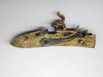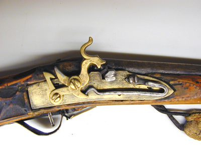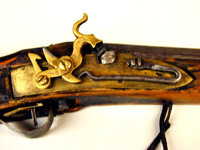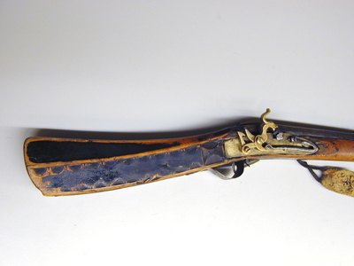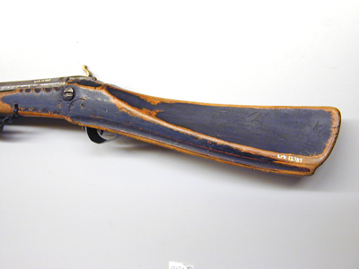 Åttsidig, åttaräfflad pipa med plana bommar. Rektangulär svansskruv. På v. övre fasen vid pipbasen en otydlig stämpel: F i rektangel. Femsidig snäcka, nippel med fyrsidig bas. Pipan är något avsmalnande framåt. Pipan är obearbetat på undersidan. Riktmedel: Inlaxat ståndsikte av stål. Avlångt stolpkorn av mässing. Fästning: Ett häfte. Pipan fäst med krysskruv underifrån samt ett pipstift av stål. Slagsnapplås med plant låsbleck, bleck, hane, studel samt skruvar av mässing. Låsblecket baktill tvärt avskuret och framåt utdraget i en spets, fasade kanter. S-formig hane med kraftigt svängt tumgrepp, hälen är på slitytan mot varhaken skodd med stål. Varhaken fästad vid studelskruven. Slagfjäder, stång och stångfjäder av stål. Fästning: En låsskruv. Avtryckaren fyrsidig. Helstock av trä, nordsvenskt yp med svängd kolv utan näsa. Kolven har femsidigt tvärsnitt med plan kolvrygg, kolvänden är lätt profilerad. På kolvens v. sida en vinge med längsgående, inskuren ränna. Laddstocksrännan är sluten till ca 180 mm från mynningen. Kolven är på v. nedre fältet dekorerad med en utskuren, med tjära färgad bladslinga samt på vingen flera parallella linjer. På kolvens högra nedre fält samt framför låsskruven dekor av två rader motstående, utskurna halvcirklar. Varbygel av stål, droppformig med bakre delen inslagen i stocken, främre delen fäst med krysskruven. Tillbehör: Laddstock av blankpolerat stål med plunderskruv i ena änden, hel l: 840 mm.