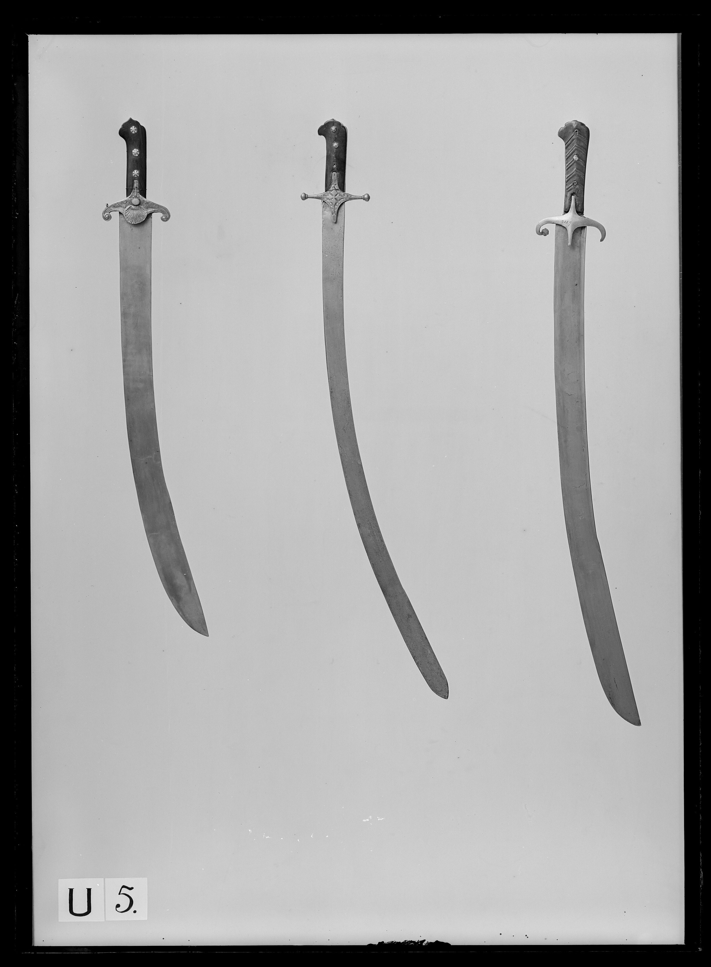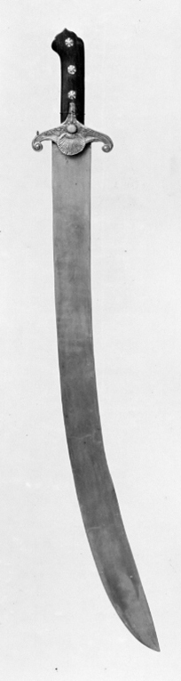 Fäste av vitmetall med korta nedåtböjda parerstänger med inrullade ändar i ett med kryss och styrskenor dekorerade med grov bladdekor i relief. Nedre styrskena i form av snäcka. På utsidan en grön sten infattad i krysset. Kaveln med plattor av mörkt horn på in- och utsidan fästa med tre rosettformiga nitar. Fästet upptill framåtböjd med konturerad överkant. På fram- och baksidan skena av vit- metall med bladranka. Bred klinga av stål, 49 mm vid fästet, böjd, eneggad med jelmani ca 207 mm lång. Intill fästet på insidan en inslagen rund otydlig smedstämpel.
