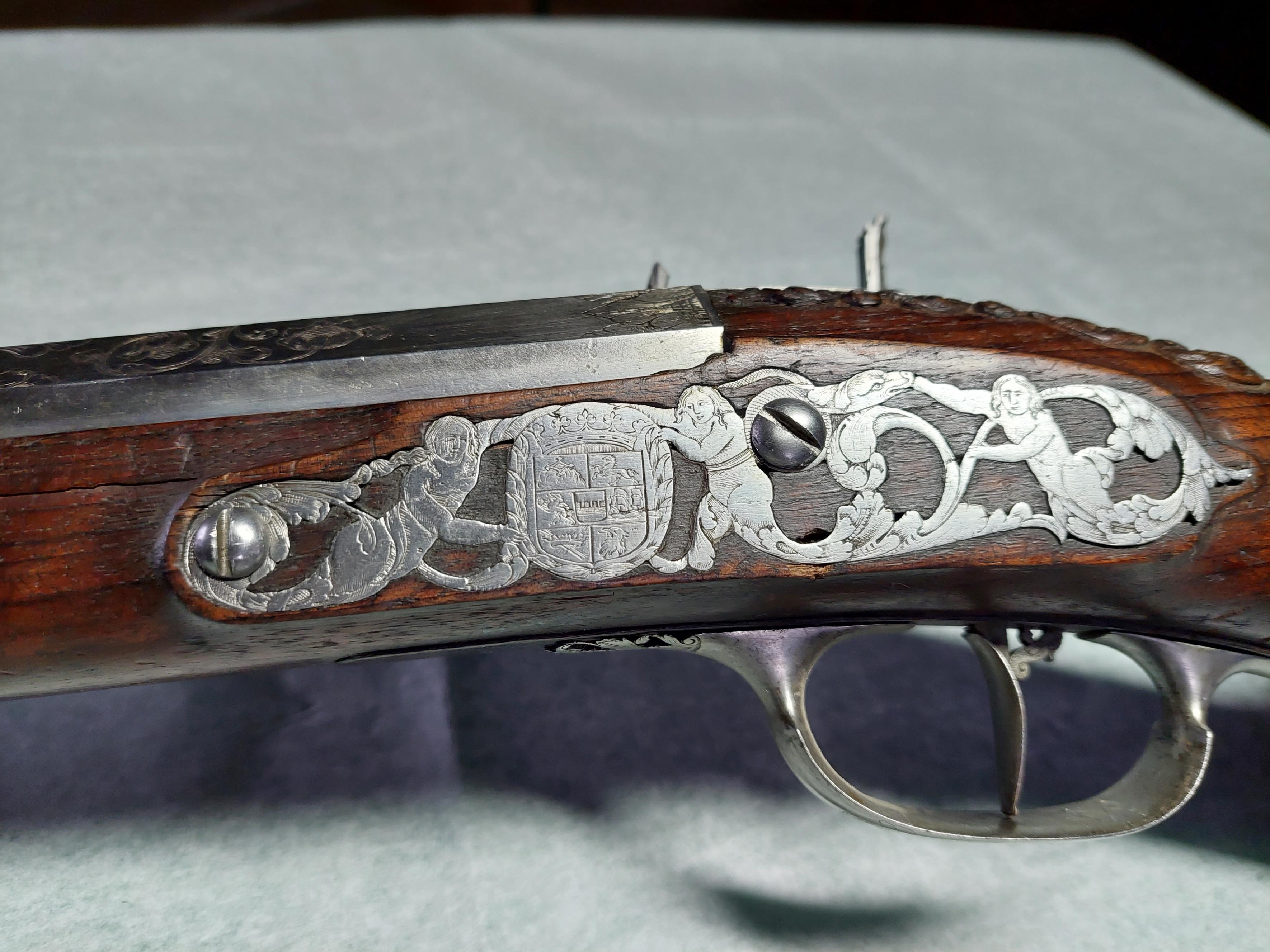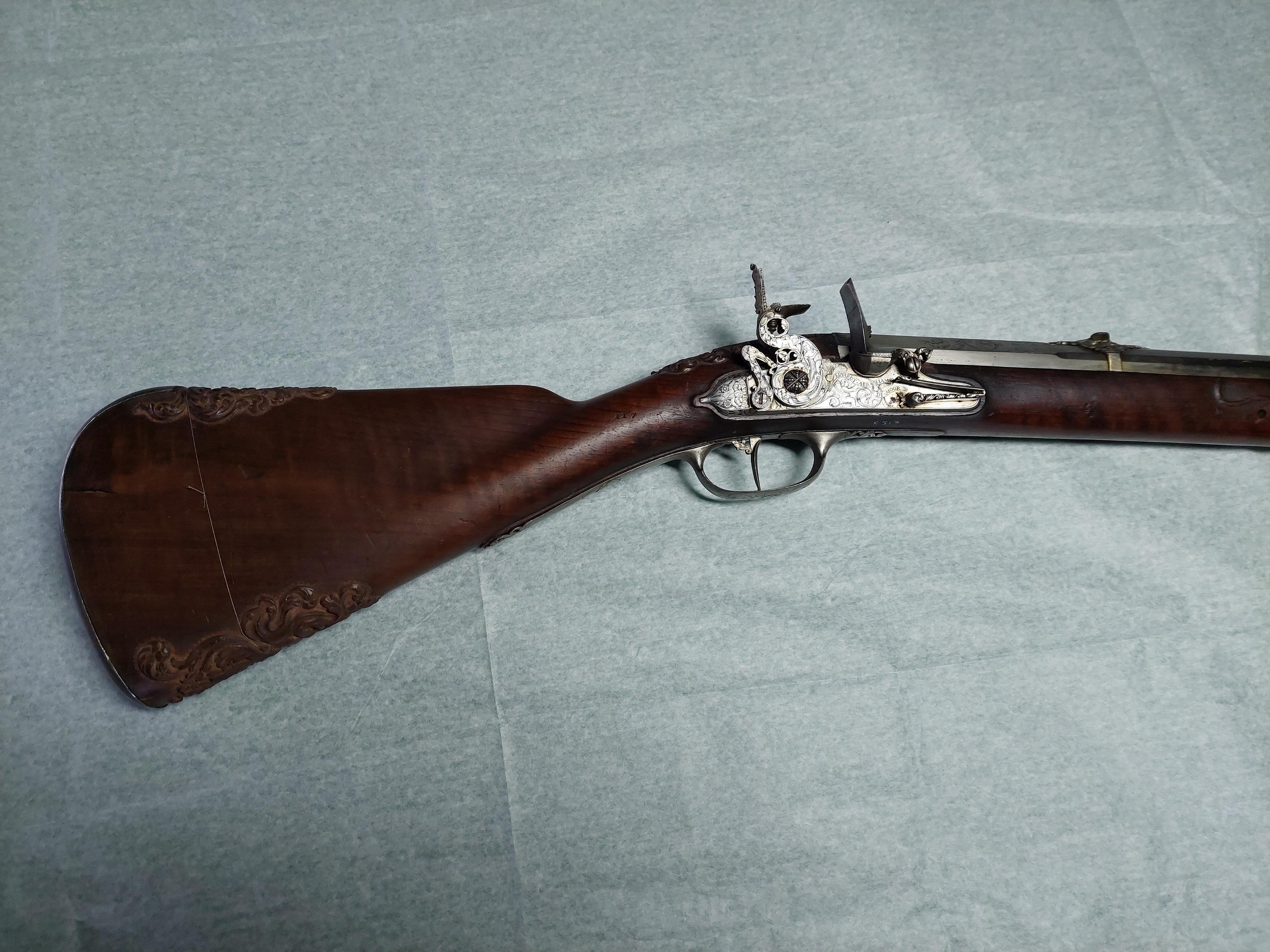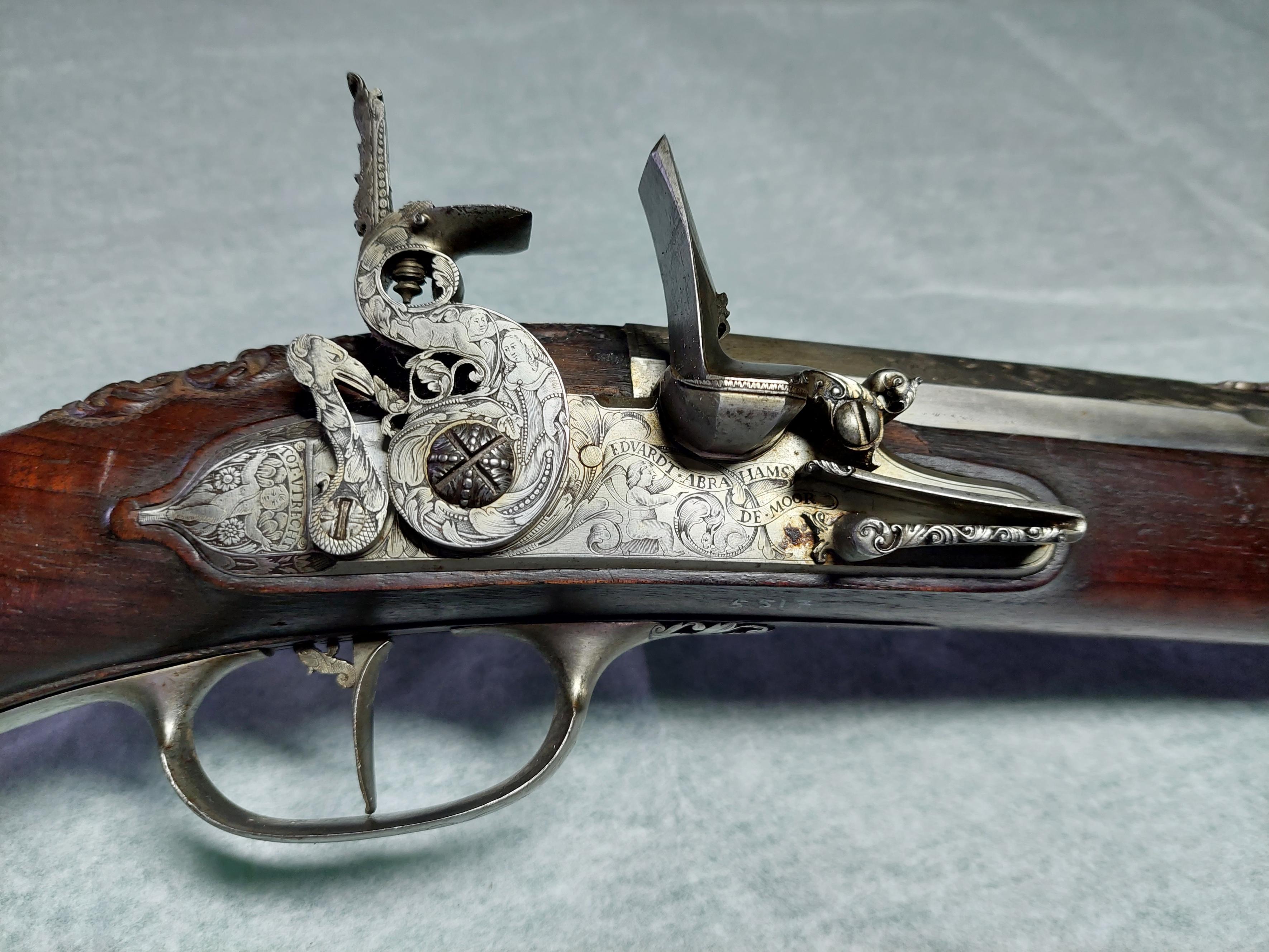 Flintlåsbössa signerad Edvart Abrahams de Moor, Utrecht. Tillhört K.G. Wrangel, i par med inventarienummer 6191. Rund, övre bakre kammaren åttkantig, däröver sextonkantig, slätborrad pipa av stål. På kammaren stämplad med Utrechts vapen (Stöckel nr 1744). Kammaren graverad med ett fint mönster av blad och blomrankor. Gördelsikte av silver, rikt utskuret i bladornament. Knoppkorn av silver. Pipans undersida med pipsmedsstämpel. Tre piphäften. Flintlås. Flata, formade och fasade kanter. På låsbleckets mitt finns en bandslinga med graverat: "EDVARDT.ABRAHAMS DE.MOOR". Låsbleckets bakre försänkta del har graverad putto, över vilken är graverat: "TOT.VTRECHT." Hanen samt hela låsblecket har graverad dekor: putto, kvinna i 1600-tals dräkt, kanis samt akantusblad. Bakom hanen finns en varhake i form av pelikan. Framkantig fängpanna. Eldstålets stötklack har litet pärlband i relief. Låsets insida med fullt utvecklad studel, i form av slingrande orm. Hel stock av valnöt. Fransk kolvtyp med kraftiga reliefsniderier i Jan Knopps stil: lejonmaskaron på kolvryggens bakre del samt på kolvens undersida, samt änglahuvud omgivet av akantusblad vid svansskruvbladet. Bakplåt av stål. Två låsskruvar. Sidbleck av stål, föreställande havsväsen hållande lagerbekransad sköld med Wrangels grevevapen av år 1653, krönt av grevlig krona. Smalt näsband av stål. Tre + en profilerad stålrörka. Fransk varbygel, på undersidan med graverad blomma. Tillbehör: Laddstock med doppsko i form av en platt knapp. Märkt: 117 ovanför låsblecket, stanstyp 5376.