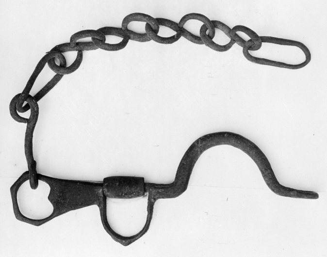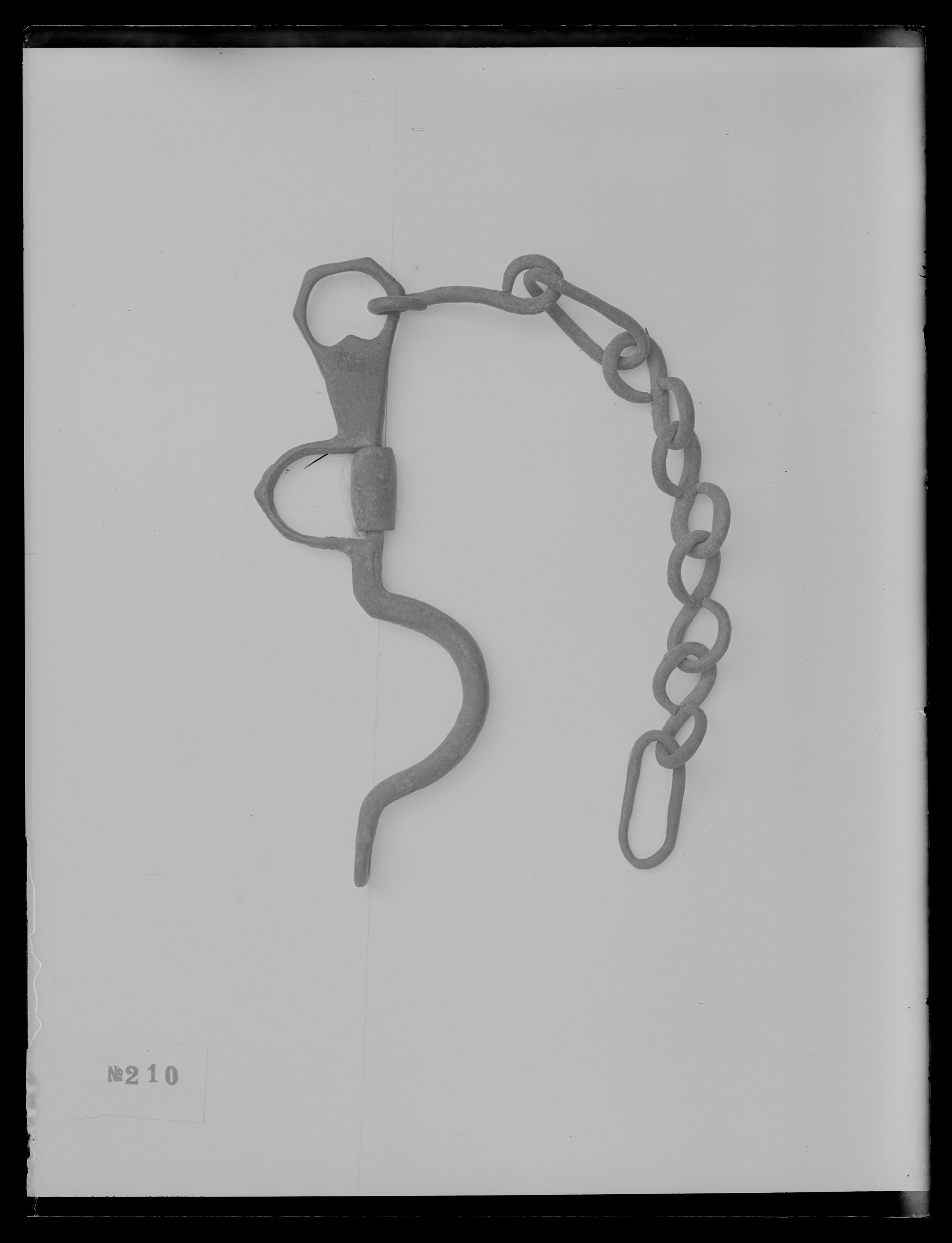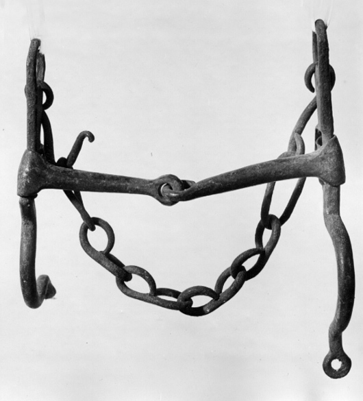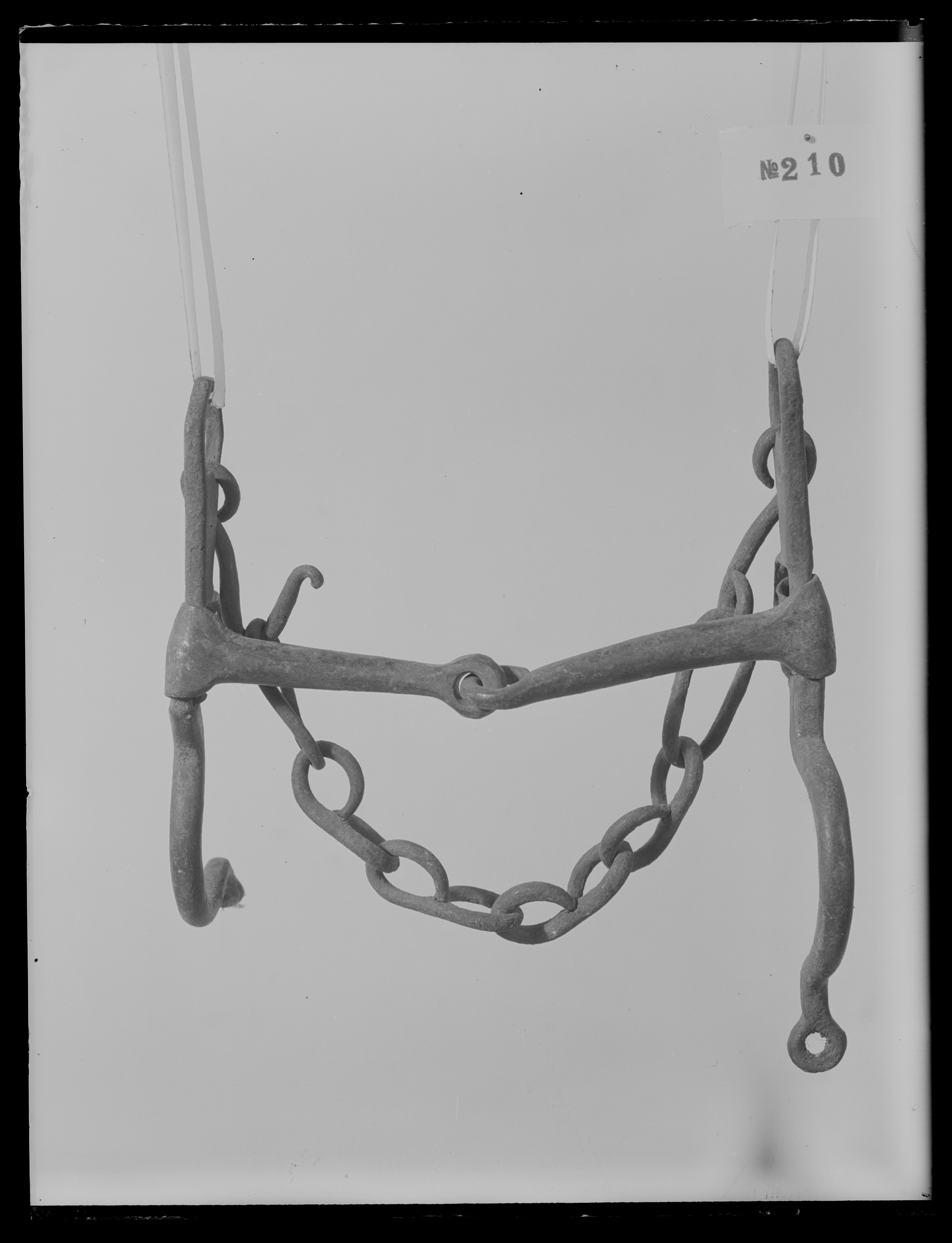 Stångbetsel med smalt munstycke, ledat på mitten, 52 mm l. Överskänklar med skumkedja, 98 mm l. Underskänklar böjda i V-form, i ändarna hål för skumkedja, som saknas.