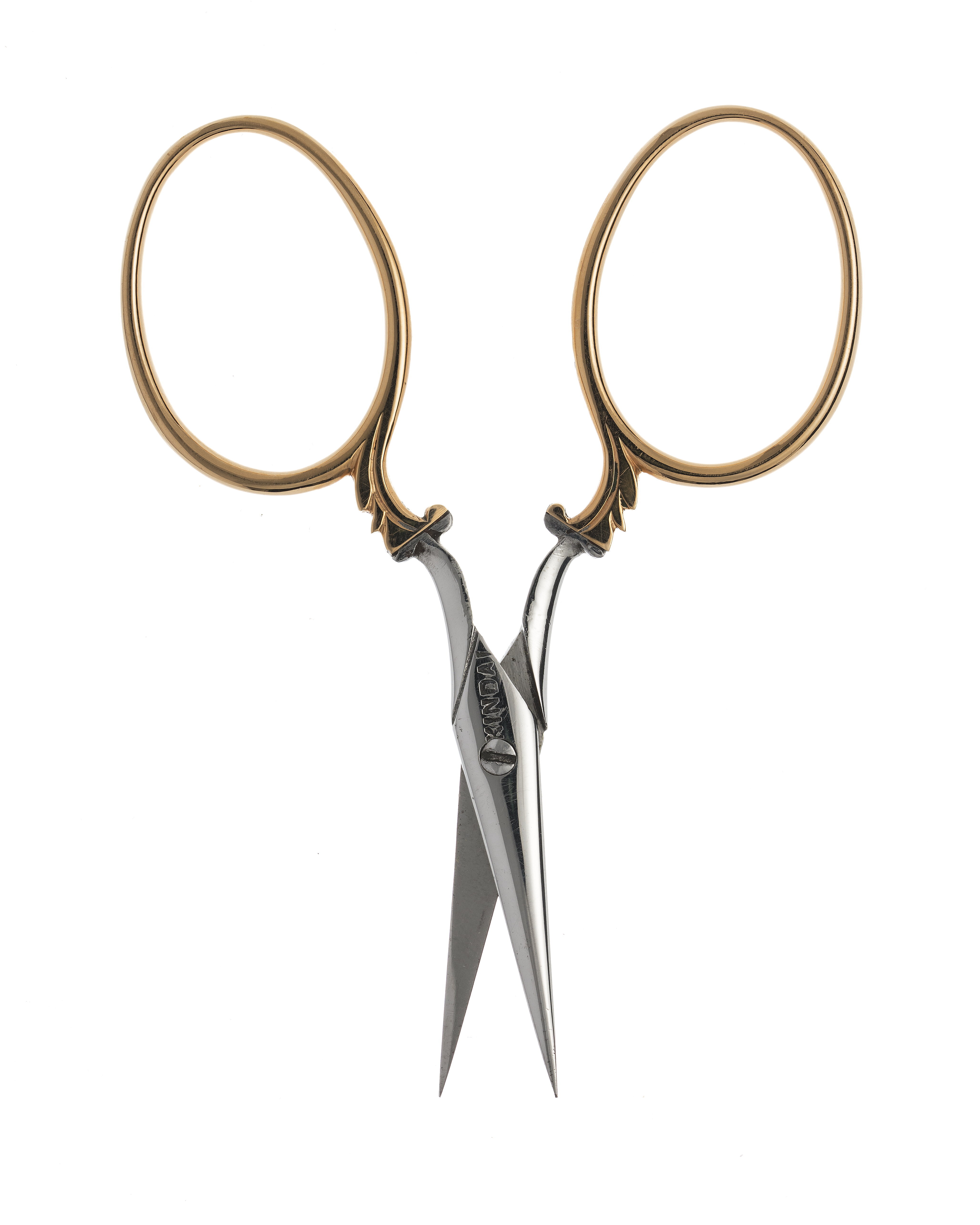 Sax med skär av stål och byglar av guld. På ena skänkeln är stämplat vid skruven: "KINDAI".