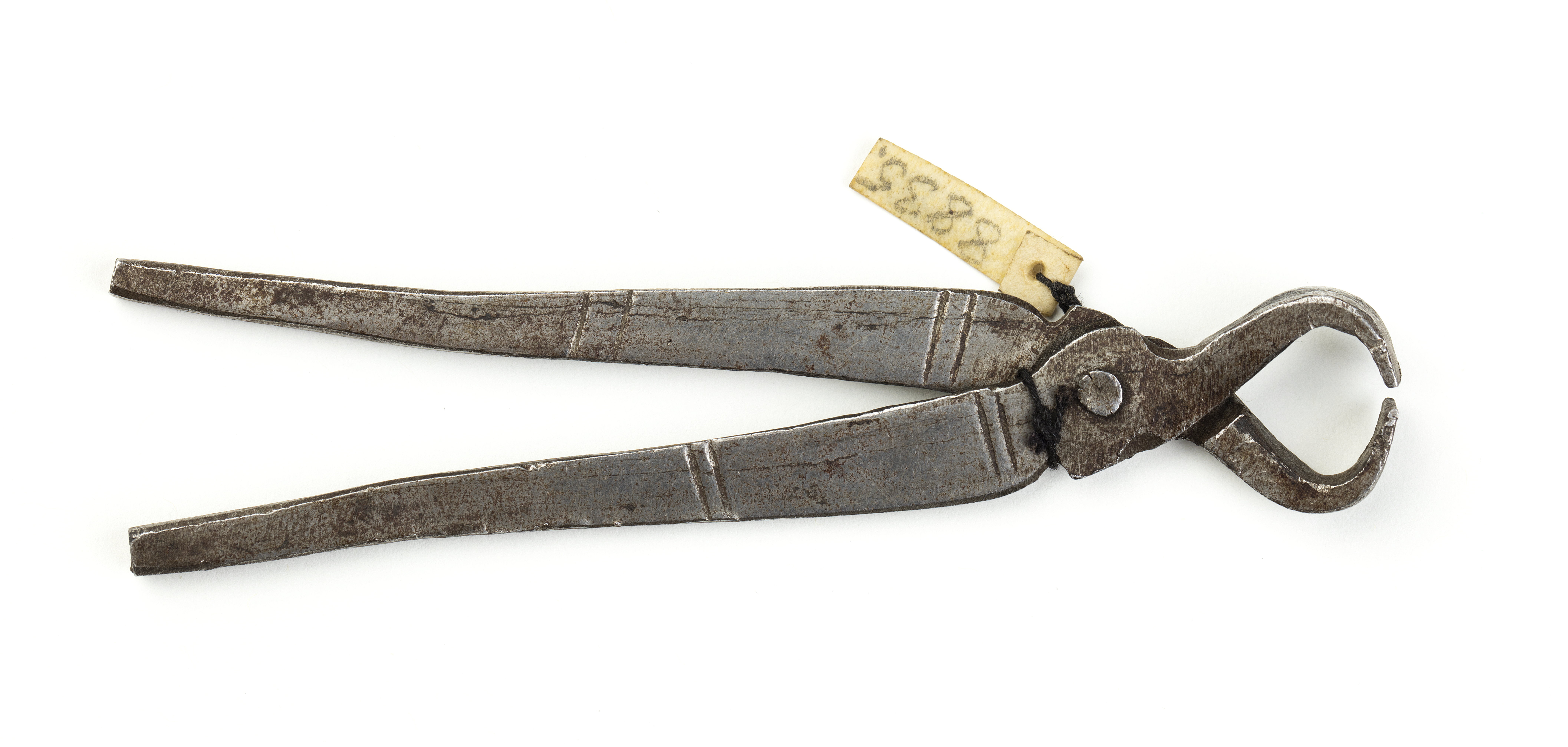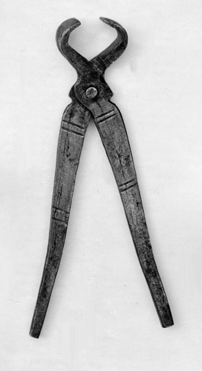Kniptång med böjda käftar, enkel led och platta, något utåtböjda skänklar, dekorerade med tvärstreck.