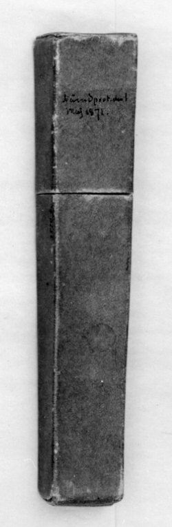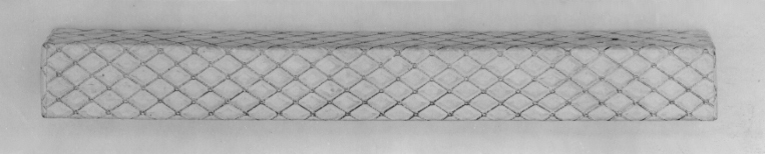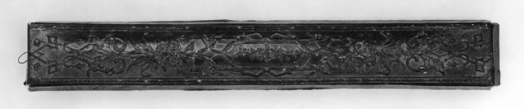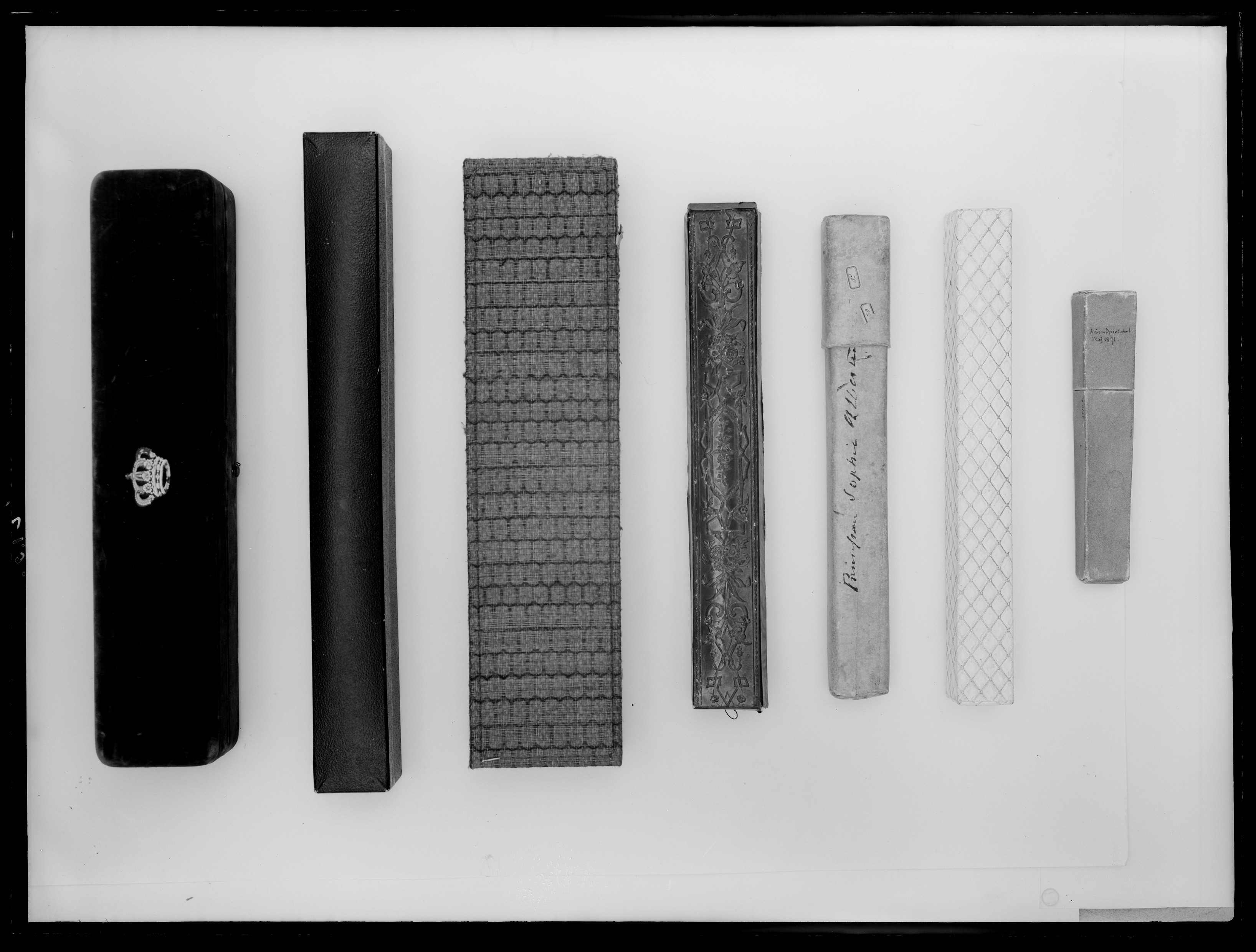 Ask av papp, rektangulär, locket halva höjden. Utvändigt klädd med vitt papper, pressat i romber, nätmönster i guld. På undersidan vitt papper.