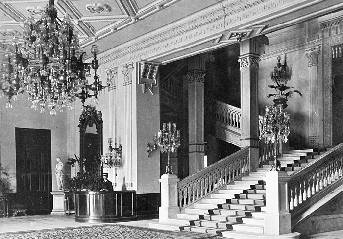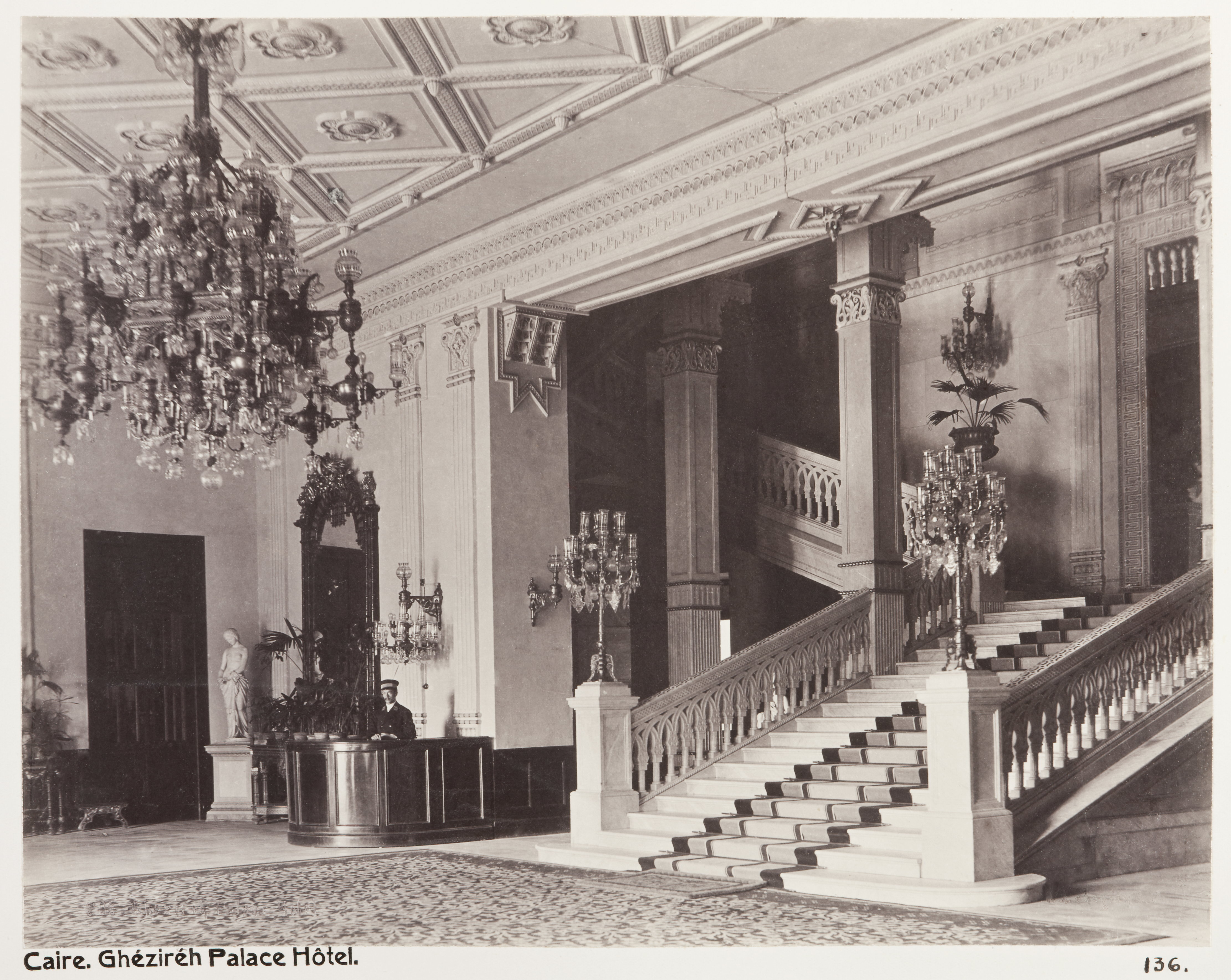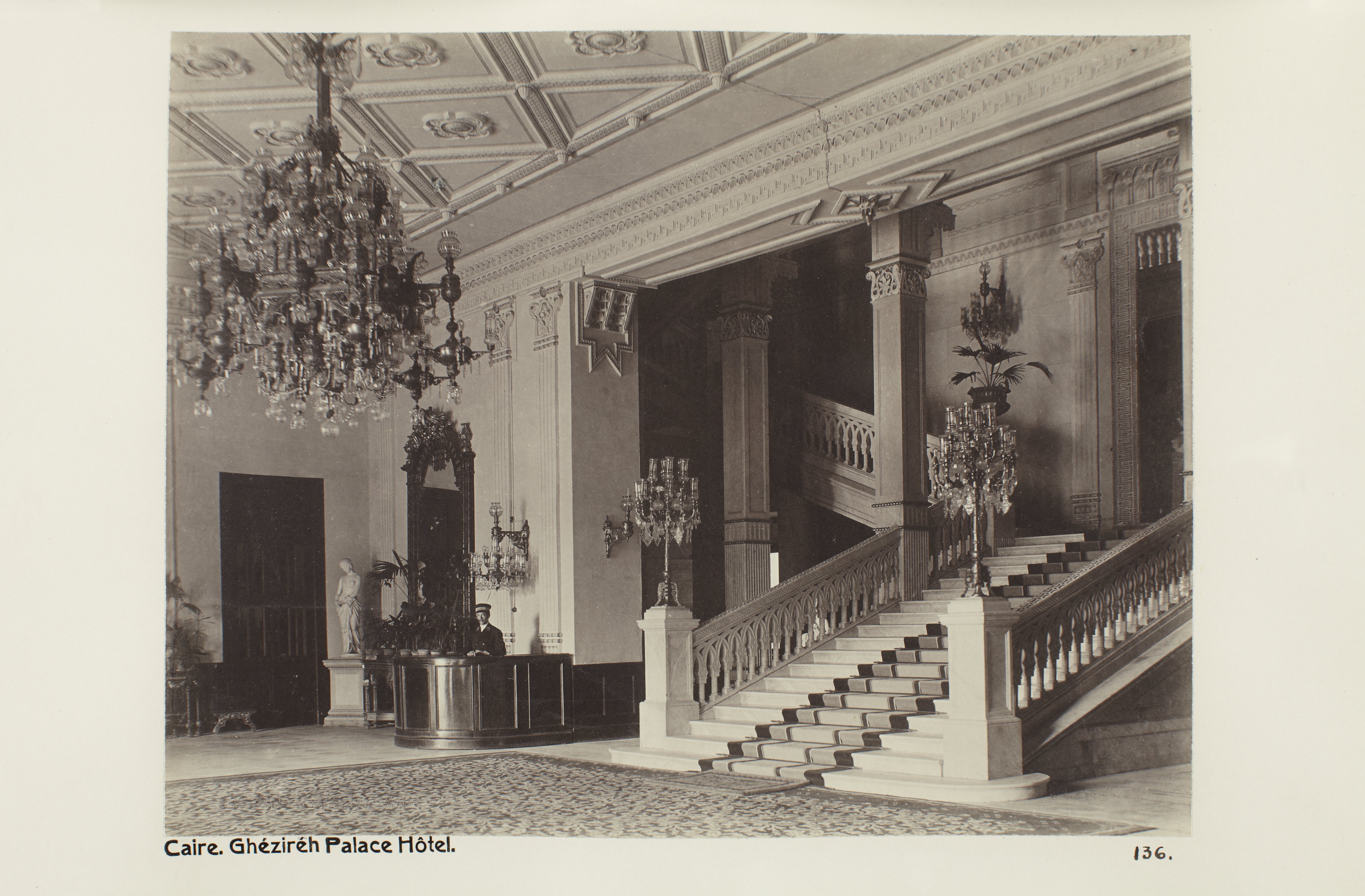 Interiör från Gezirah Palace Hotel. Kairo, Egypten. Text på fotografiet: Caire. Ghézireh Palace Hôtel. Fotografierna LXVI:M.01.- 201. kommer från resan till Egypten och Sudan som Wilhelmina och Walther von Hallwyl gjorde vintern 1900-1901. De lämnade Sverige den 5 november 1900 och fortsatte från Egypten till Palestina den 28 mars 1901. Med på resan var döttrarna Ellen med maken Henric de Maré och Irma med maken Wilhelm von Geijer. Wilhelminas sällskapsdam, fröken Ida Uhse reste också med. Under en del av resan anslöt sig ledamoten av Internationella domstolen i Kairo, assessorn Otto Conrad Waldemar Cedercrantz med makan Anna Elisabeth. Vid resan uppför Nilen hade Walther von Hallwyl hyrt ångfartyget Columbia med besättning. Båtresan startade i Kairo 27 december 1900, gick ända till Wadi Halfa varifrån man reste vidare med tåg till Khartum och tillbaka till Wadi Halfa. Båten vände åter i riktning mot Kairo, men det verkar som att sällskapet tog tåg sista biten, från Luxor. Henric och Ellen de Maré samt fru Cedercrantz lämnade båten redan då de passerade Luxor första gången. Resten av sällskapet återvände till Kairo den 1 mars. Fotografierna LXVI:M.01.-120. togs av resenärerna själva, de största av Ellen de Maré, de mellersta av Wilhelmina von Hallwyl och de minsta av Wilhelm von Geijer. Resten köptes av professionella fotografer i Kairo, de flesta från Studio Photogr. Artistique G. Lekegian & Cie. Alla uppgifter kommer från Ida Uhses reseanteckningar. Inköpt hos studio Photogr. Artistique G. Lekegian & Co.