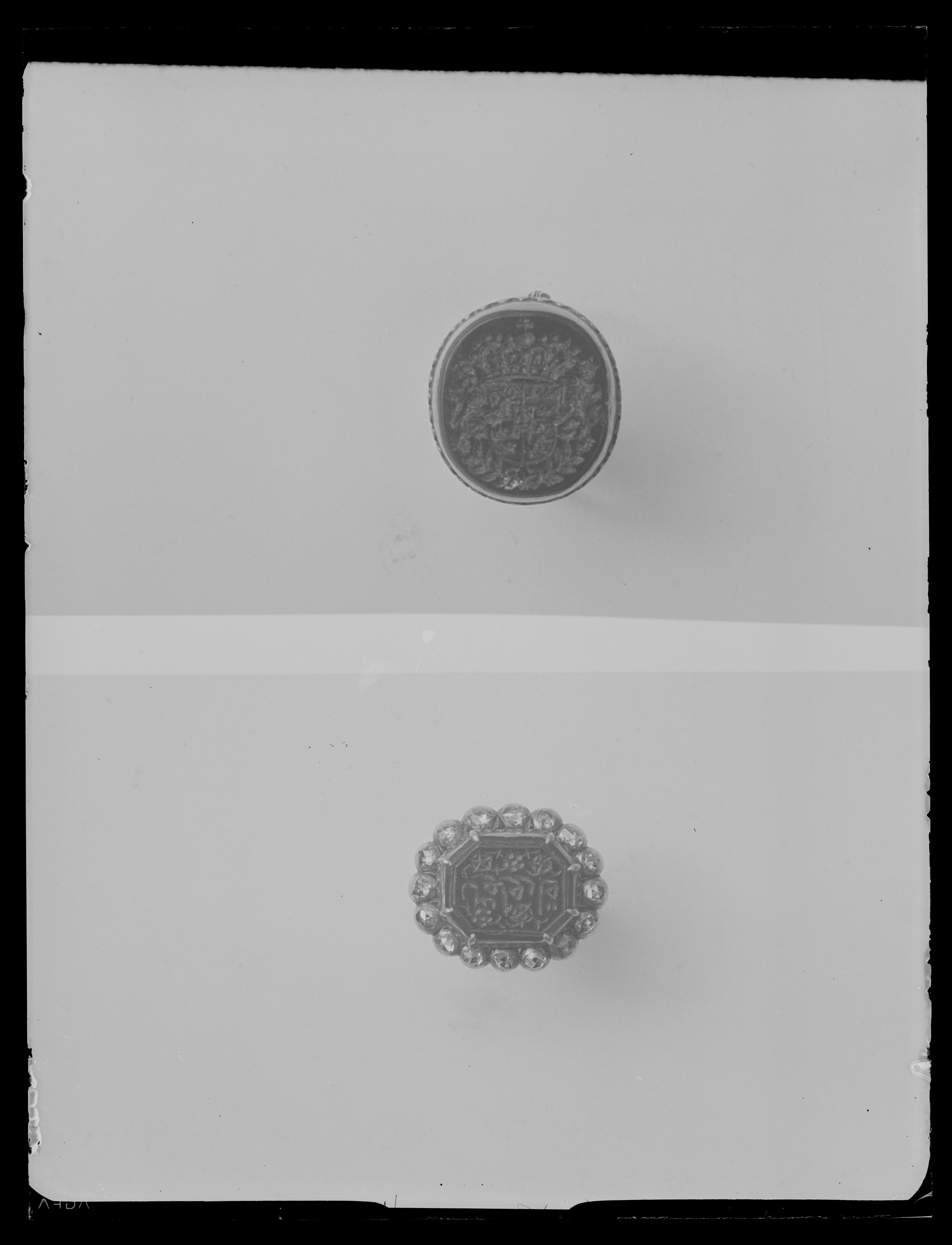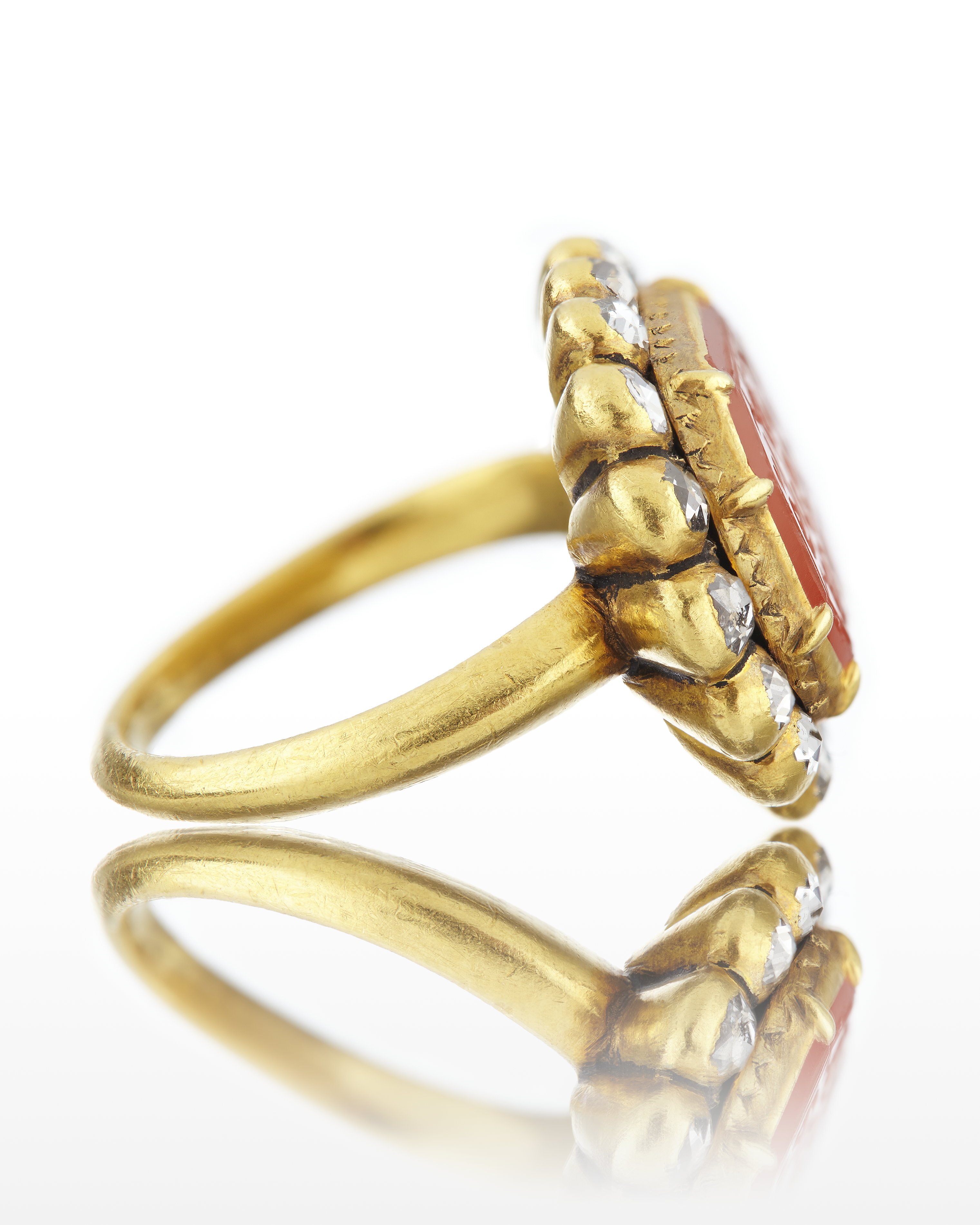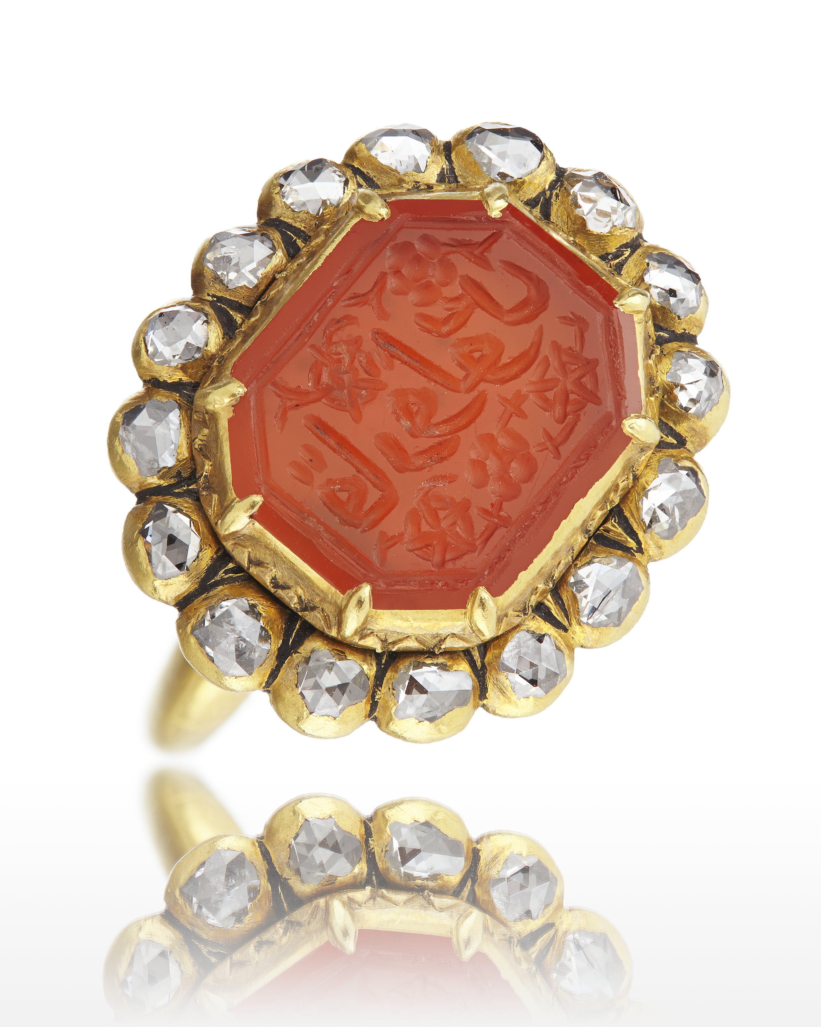 Oregelbundet rund guldring med åttkantig karneol med fasade kanter, graverade blommor och persiska bokstäver, Carolus, (Karl XI). Avdeckt fattning av guld, däromkring oval ring av sexton rosenstenar i släta fattningar av guld, plattans baksida blomformigt konturerad med sexton blad, övergående i stenarnas fattningar. Skattkammaren, Nationalmuseikat. 35, nr 432, "Torde vara förd till Sverige genom någon av de svenska ambassaderna till Persien, t.ex. Ludvig Fabricius 1678-1682."