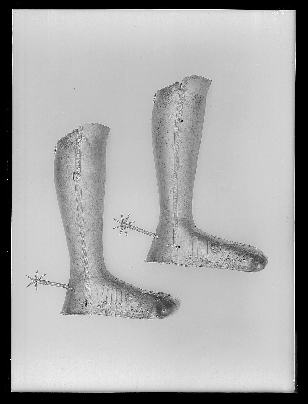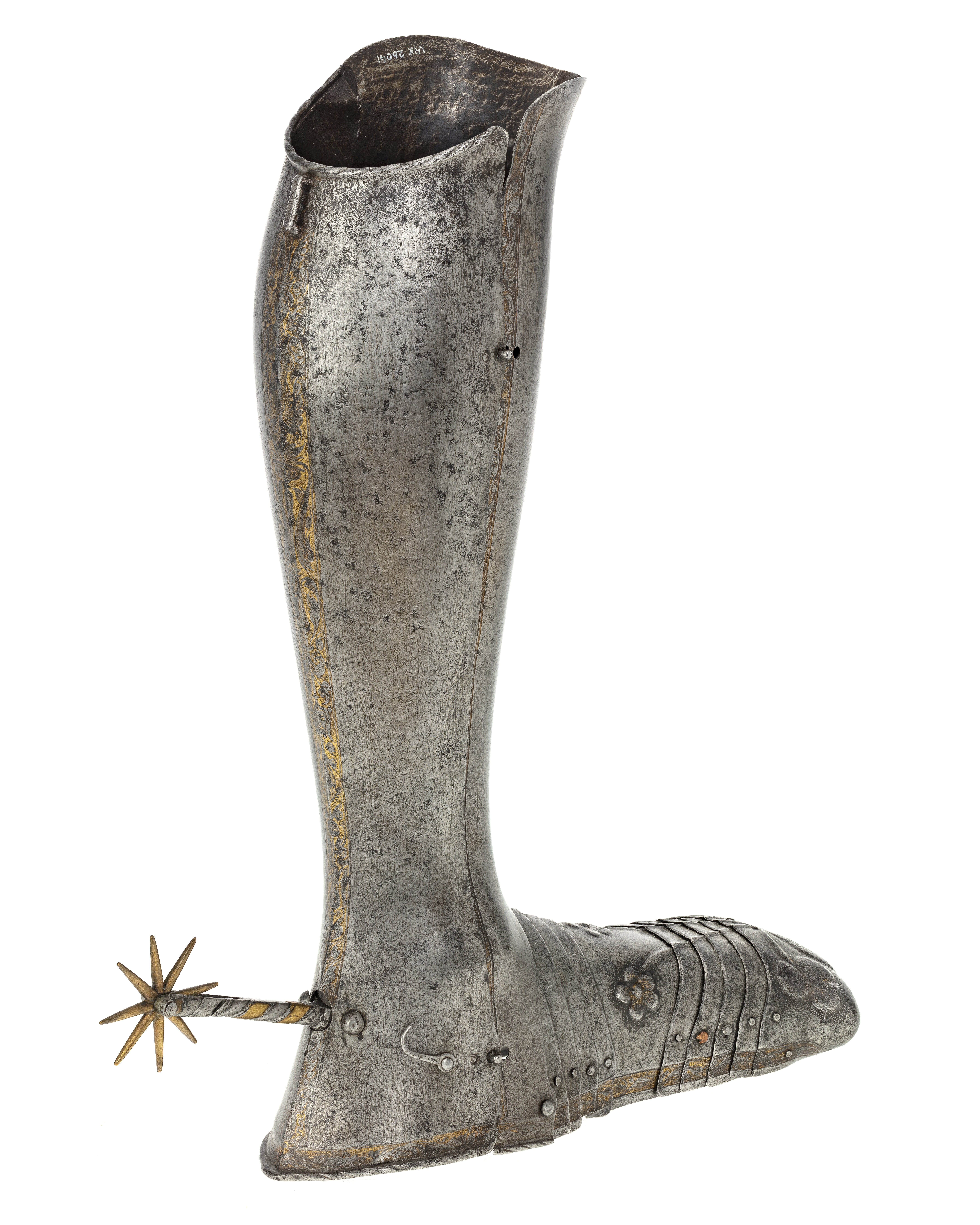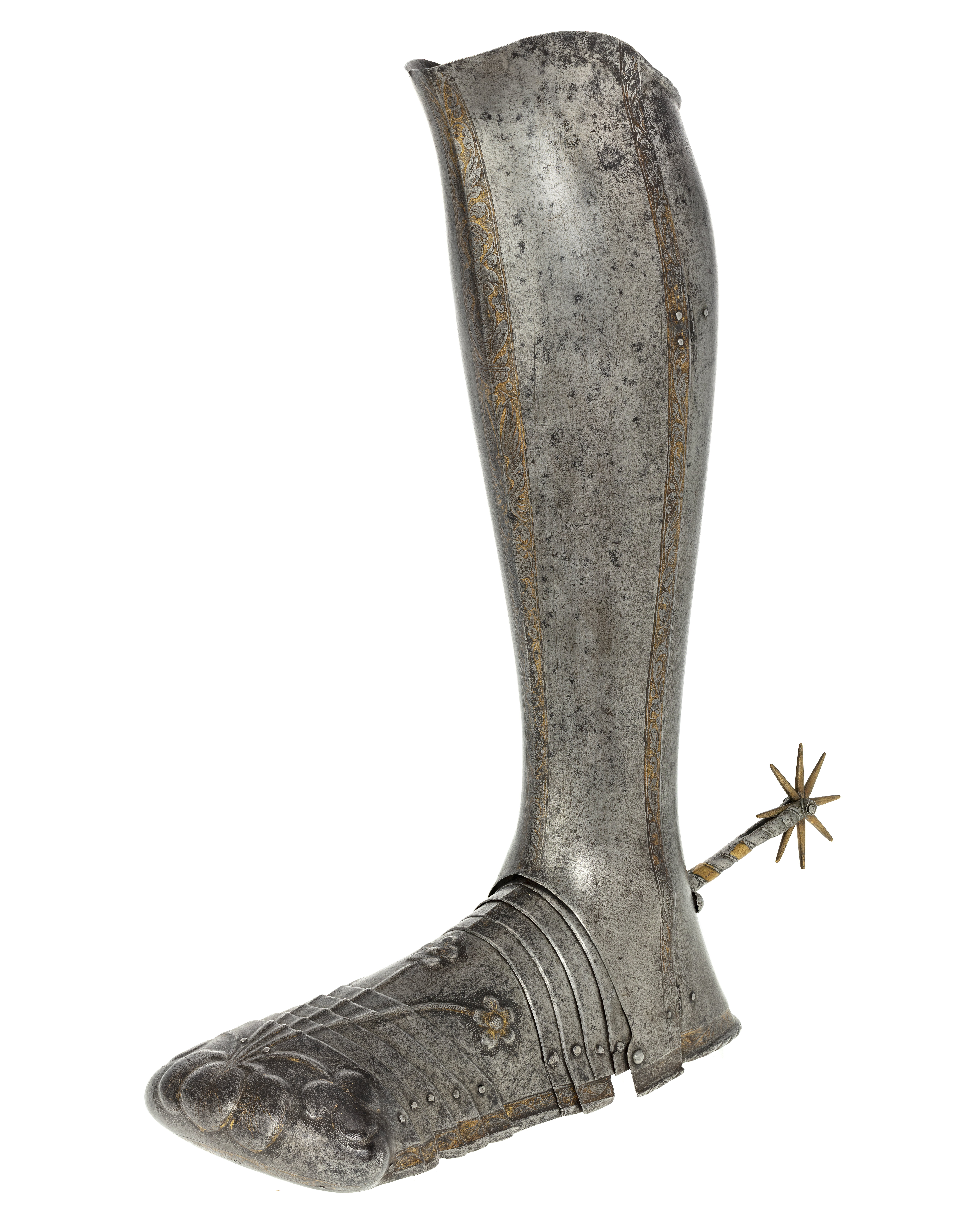 Bestående av skenbenspansar i två halvor förenade med 2 gångjärn på utsidan och låsning med knapp upptill och hake nertill. På hälen en något rörlig, fast stjärnsporre, l: 92 mm arm och klingan förgylld (mässing?), armen med sned banddekor, vartannat band guld (?) vartannat stål. Foten sammansatt av fyra vristlameller, mittplåt, fyra framfotslameller och stor, mulformig tålamell med omvikt kant. Driven dekor i form av slåtterblomma med tre fembladiga blommor på fotplåten samt fem blad på tålamellen. Etsad oförgylld dekor som ovan. På mittlisten en kvinnlig herm, fas, samt två örnvingar. Sporrklingan åttauddig, armens l: 95 mm, d: 65 mm.