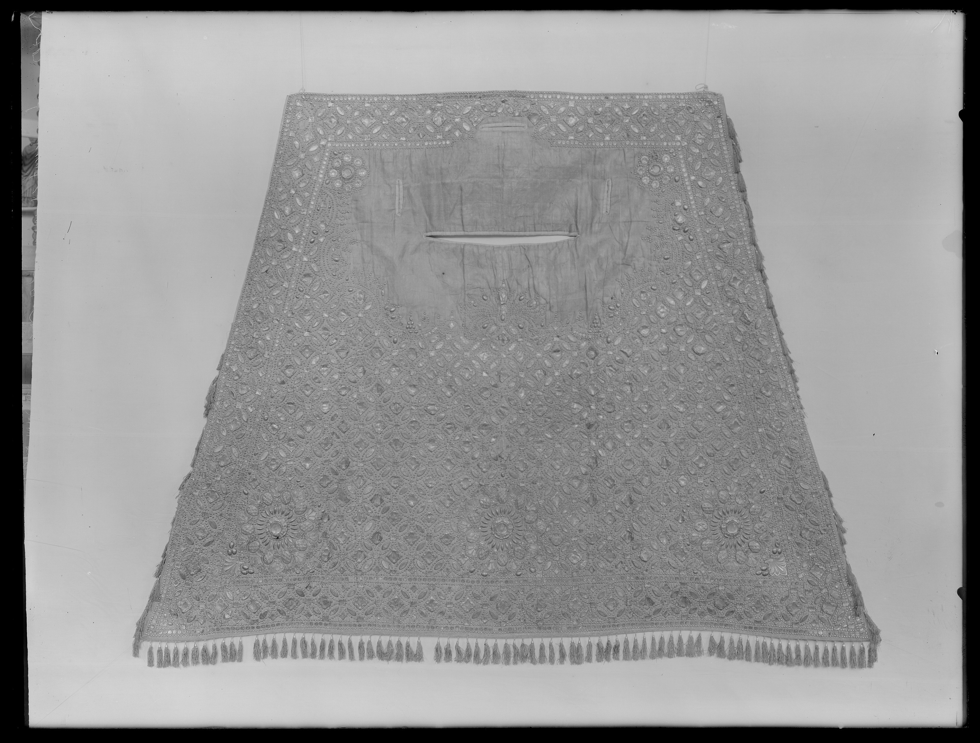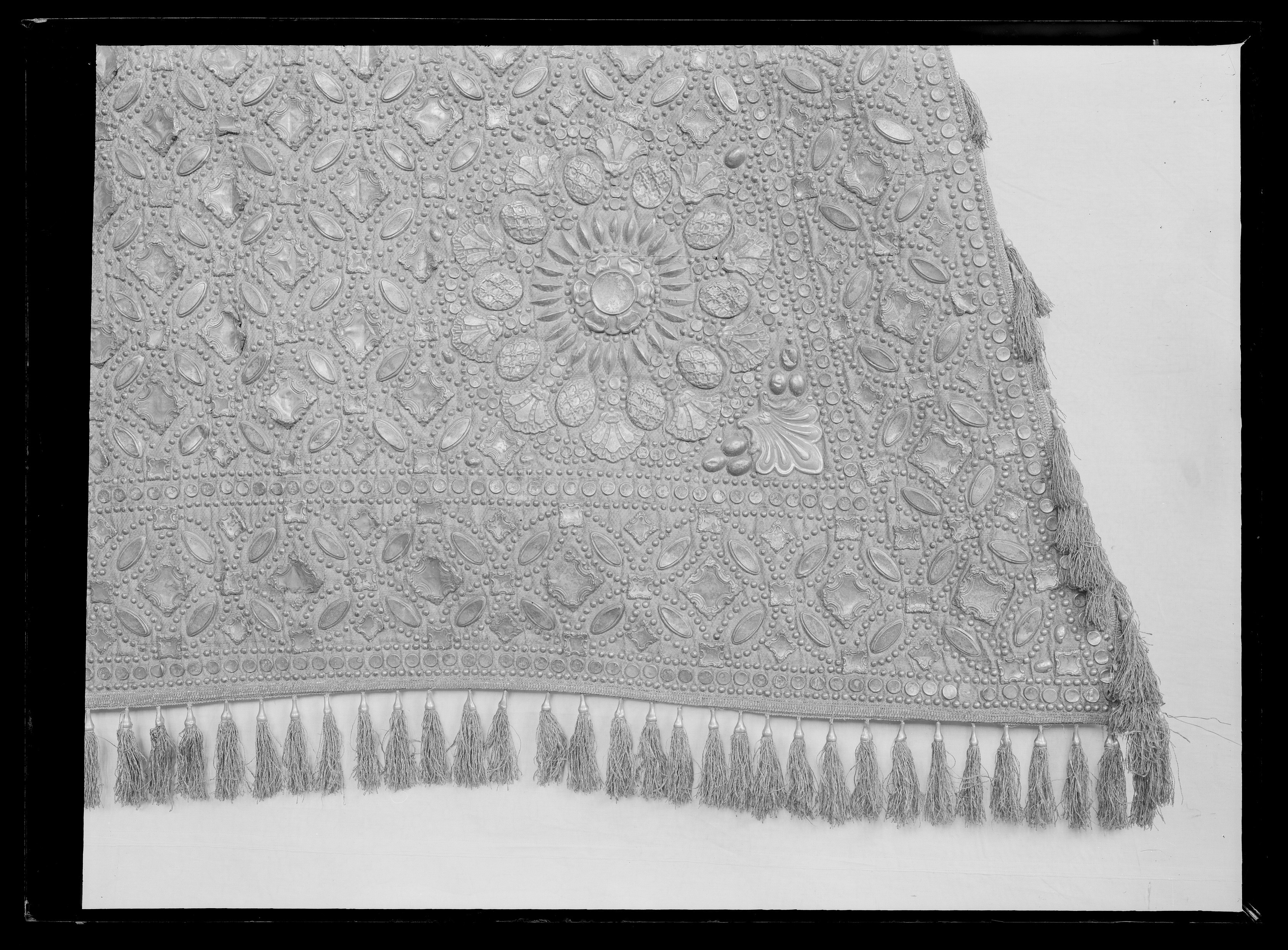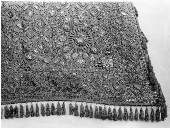 Sadeltäcke, stort, af silfvermoiré, rikt beslaget med förgylda större och mindre silfverpucklor och plåtar, samt kantadt med 166 silfvertofsar med förgylda silfverknappar; fodret af grönt siden.....