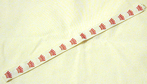 Vitt band av bomull med maskinvävda röda kronor.