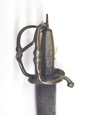 Fäste av stål. Knapp fattas (förkommen). Handbygel och sidohandbygel påtagligt illa smidda. Båda släta och med runt tvärsnitt, något nedanför mitten två intill varandra liggande runda knoppar, mellan hand- och sidobygeln en snett nedåtriktad spång av samma utförande som byglarna, dock utan knoppar. Den yttre parerplåten genombruten med rundahål och inom stavformig list, vars mitt utgör sidohandbygelns fäste. Den inre parerplåten uppåtsvängd, slät, mellan dess mitt och krysset en bågformig tumbygel. Bakre parerstångkort, nedåtböjd och med ansvälld spetsig ytterände. Kavellindning av tvinnad tunn ståltråd. Klinga böjd, eneggad, utom vid det ca 315 mm långa tvåeggade spetspartiet. På insidan ca 150 mm från basen i en längsgående rad tre inslagna märken, det mellersta i form av ett riksäpple. På klingryggen ovanför jelmanen tre skålade fasningar på vardera sidan. Klingans yta i sin helhet artificiellt behandlad för att ge sken av rostskada.