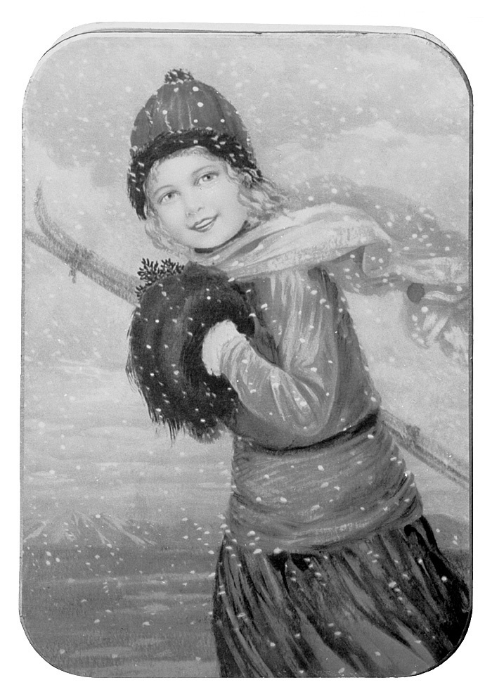 KONFEKTASK Av papp. Rektangulär med rundade hörn och platt fällock samt klädd med ljust blågrönt papper, varpå pressat blommönster; på locket i färger en sportklädd flicka i snöväder; flickan gående åt vänster, med lockigt gult hår och blåa ögon, i toppig rödgredelin mössa, bakåt fladdrande lång ljusgredelin halsduk, röd kofta och gredelin kjol, på vänstra handen en stor brun muff samt under högra armen ett par skidor. Lock och botten med utstående kanter i guld; locket fällbart vid bakre änden, där med två ljusblåa sidenband av silke. Höjd: 5 cm, längd: 34,5 cm, bredd: 23,8 cm. Gåva (med innehåll) till Wilhelmina von Hallwyl, julaftonen 1927 från hennes svärson ryttmästaren Fredrik Wilhelm Gustaf von Geijer.