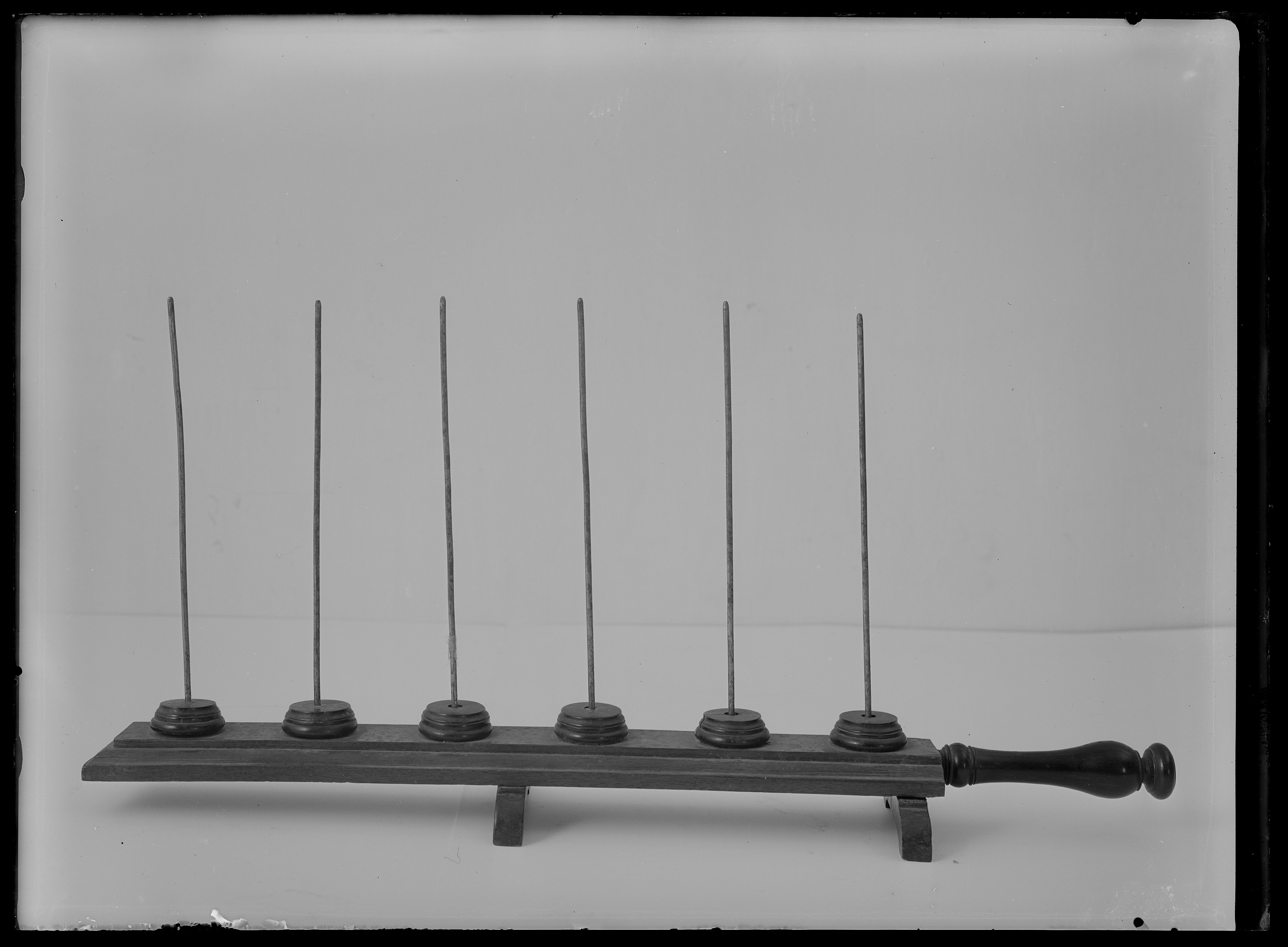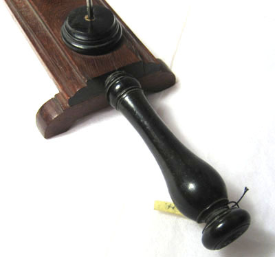 Bestående av rektangulär platta av mörkt brunröd mahogny med profilerade kanter och på undersidan i var ände ett fotstöd, ursprunglige tre. I ena kortsidan ett balusterformigt hantag svarvat i svart trä, l 90 mm. På ovansidan sex cirkulära träklackar med profilerad kant med i mitten ståndare av stål, h 162 mm.