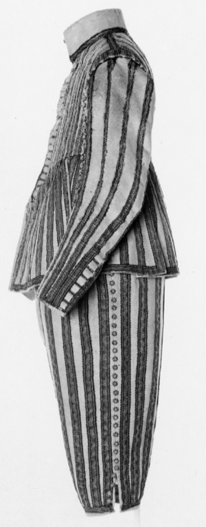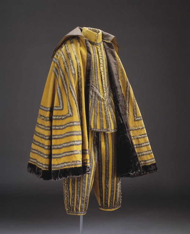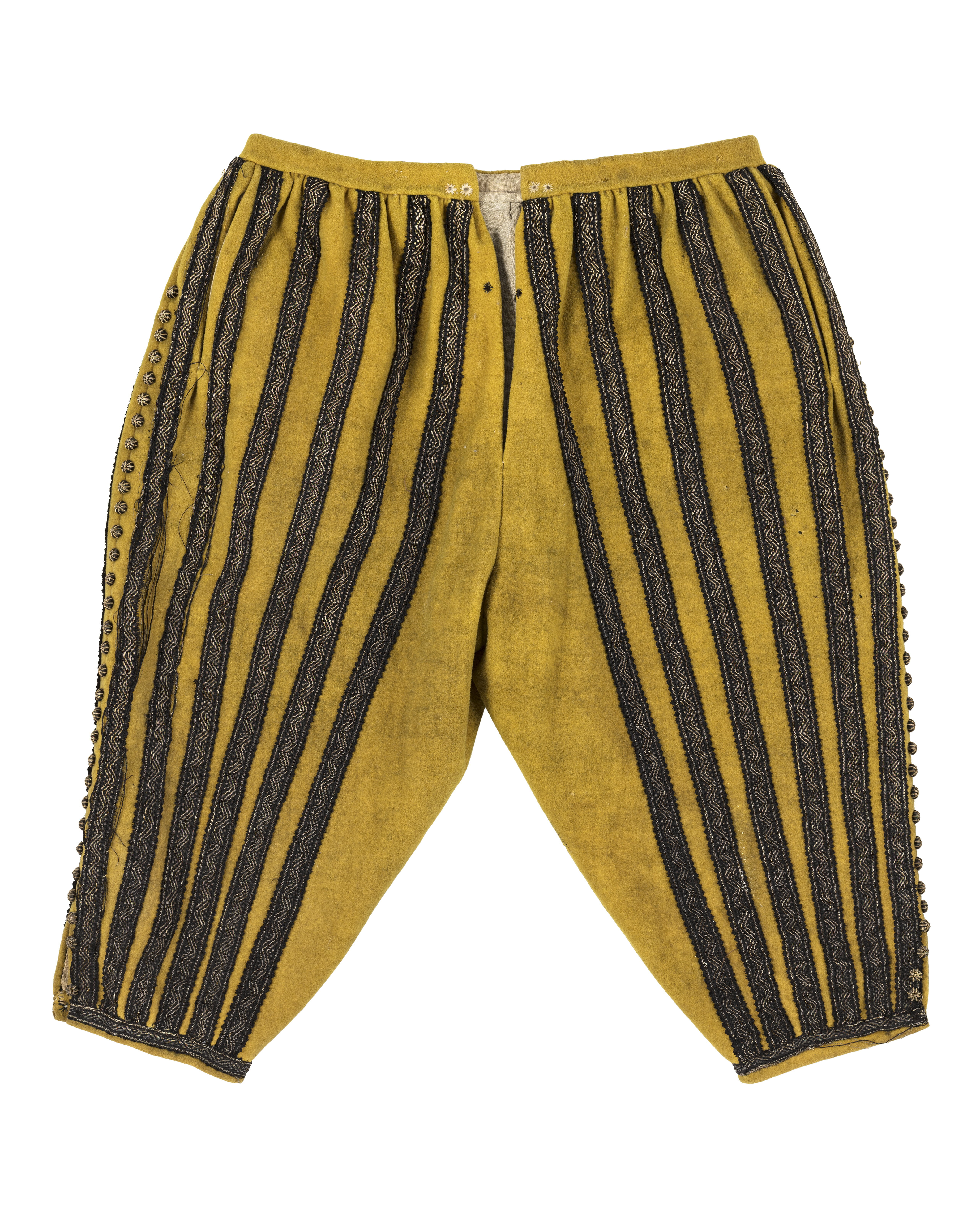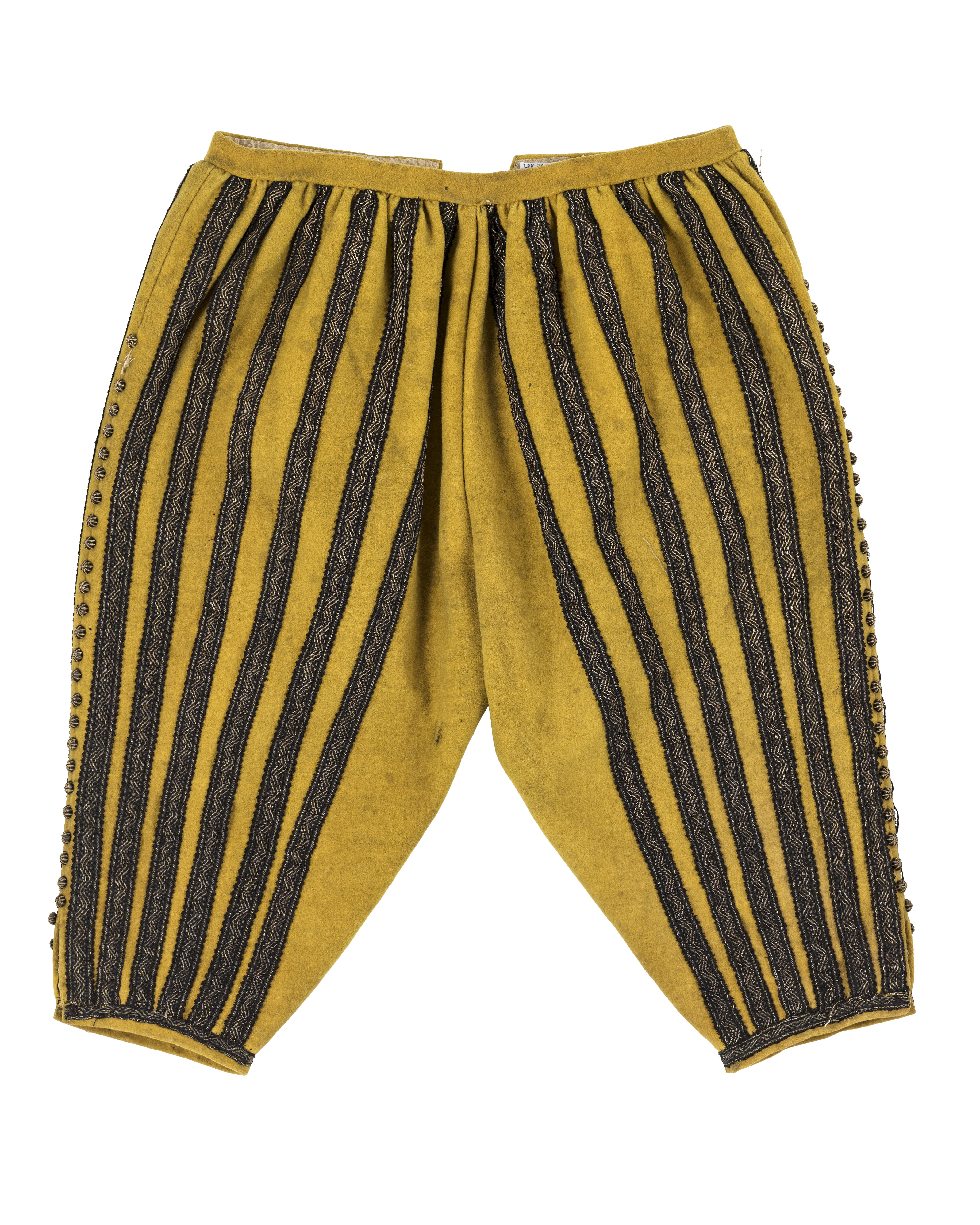 Knäbyxor i smal modell, s.k. venetianare, av gult kläde. Byxorna är dekorerade med flera rader av påsydda svarta silkeband med invävt mönster i metalltråd, banden är ca. 2,5 cm breda. Längs sidsömmarna är dekorknappar påsydda, knapparna har en kärna av mörkt (svartfärgat) trä, delvis överspunnet med metalltråd. I vänster sida finns 29 knappar samt spår/rester av en knapp. I höger sida finns 31 knappar, några (2 st?) saknas. Byxorna har midjelinning av gult kläde, ca. 2,8 cm bred, byxan är rynkad mot linningen. Fram en öppning, ca. 21 cm djup. I öppningen nära linningen finns två hål för band, att kunna knyta ihop byxorna fram. Hålen är runt om sydda med svart silke. I var sida har byxorna en ficka med vertikal öppning, fickpåse av oblekt tuskaftsvävt linne. I en ficka finns små delar av svart sidentyg, de ligger invikta i ett papper med text på: "OBS Fragment av fodret". Byxbenen har i sidan nedtill ett sprund, ca. 9 cm långt. Byxan avslutas vid knäet med en linning, ca. 2,5 cm bred, 36 cm lång. I var ände har linningen ett hål, för att kunna knytas ihop. Hålet är runt om sytt med svart silke. I grenen, på byxbenens insida finns ett parti där inga band är påsydda. Byxorna är fodrade med oblekt tuskaftsvävt linne.