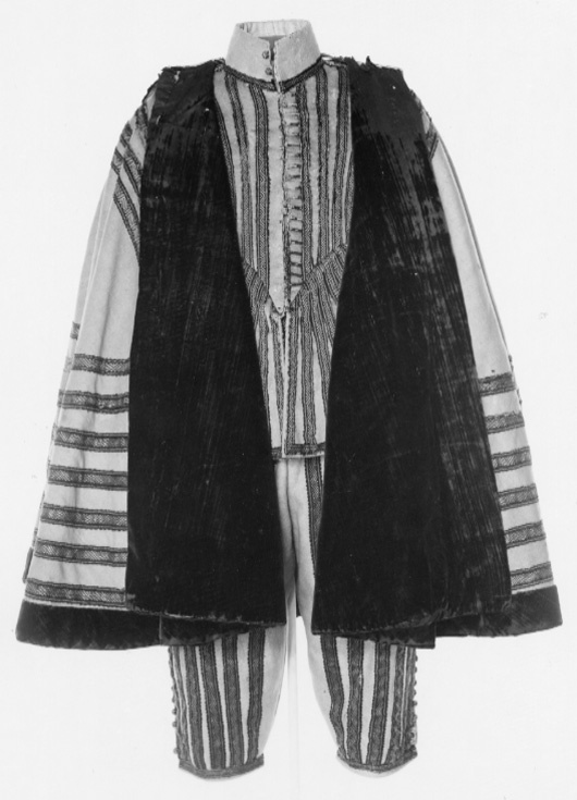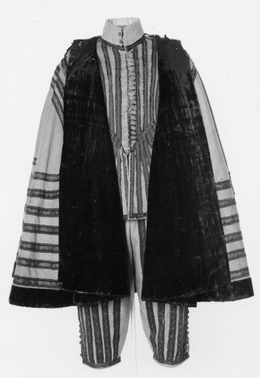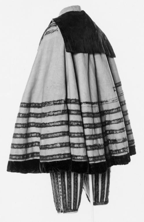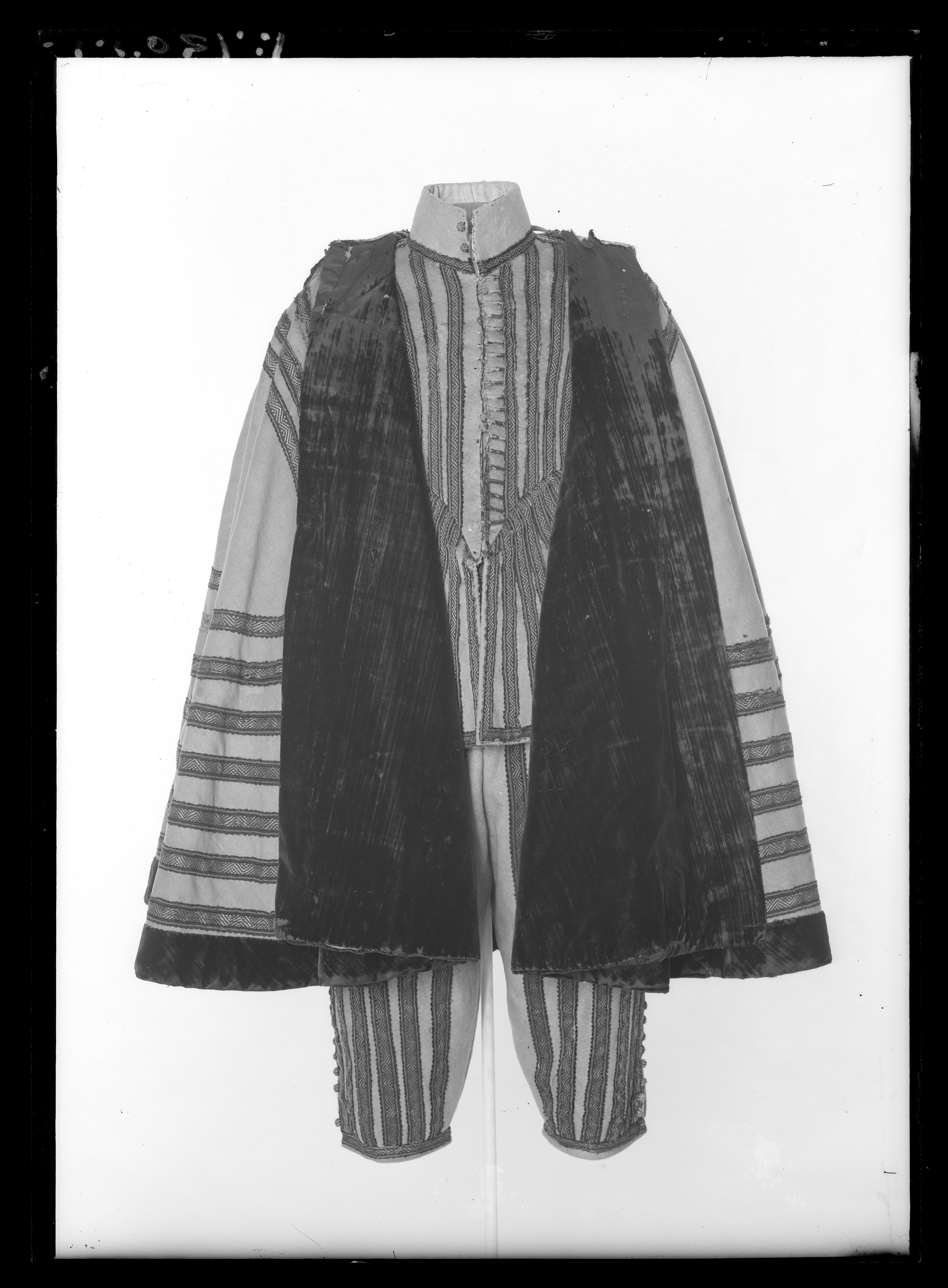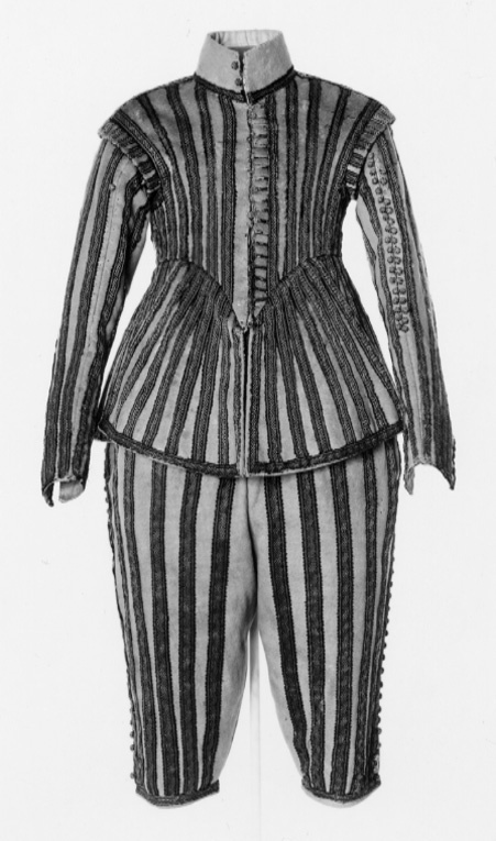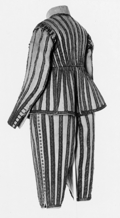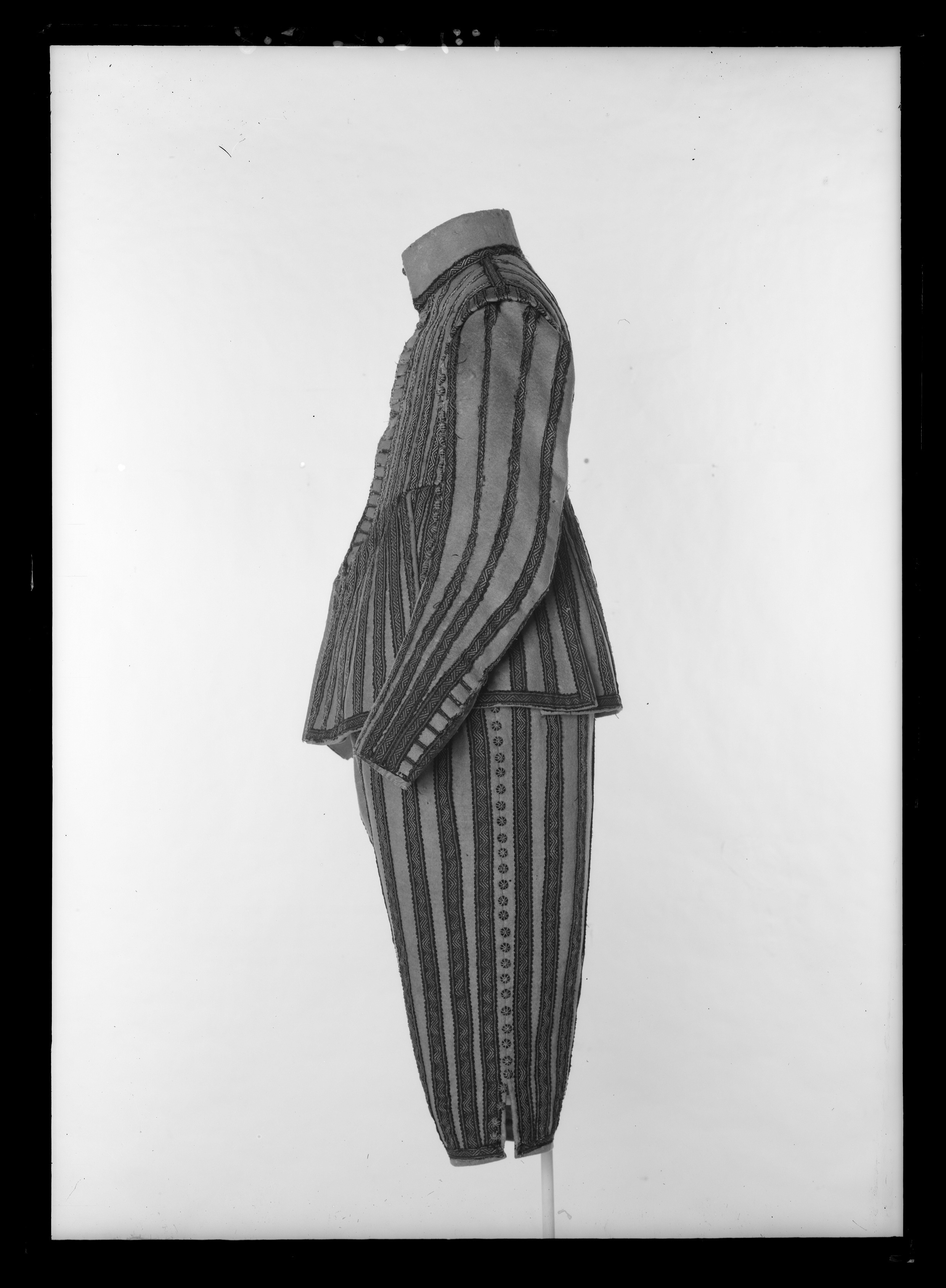 Knäbyxor i smal modell, s.k. venetianare, av gult kläde. Byxorna är dekorerade med flera rader av påsydda svarta silkeband med invävt mönster i metalltråd, banden är ca. 2,5 cm breda. Längs sidsömmarna är dekorknappar påsydda, knapparna har en kärna av mörkt (svartfärgat) trä, delvis överspunnet med metalltråd. I vänster sida finns 29 knappar samt spår/rester av en knapp. I höger sida finns 31 knappar, några (2 st?) saknas. Byxorna har midjelinning av gult kläde, ca. 2,8 cm bred, byxan är rynkad mot linningen. Fram en öppning, ca. 21 cm djup. I öppningen nära linningen finns två hål för band, att kunna knyta ihop byxorna fram. Hålen är runt om sydda med svart silke. I var sida har byxorna en ficka med vertikal öppning, fickpåse av oblekt tuskaftsvävt linne. I en ficka finns små delar av svart sidentyg, de ligger invikta i ett papper med text på: "OBS Fragment av fodret". Byxbenen har i sidan nedtill ett sprund, ca. 9 cm långt. Byxan avslutas vid knäet med en linning, ca. 2,5 cm bred, 36 cm lång. I var ände har linningen ett hål, för att kunna knytas ihop. Hålet är runt om sytt med svart silke. I grenen, på byxbenens insida finns ett parti där inga band är påsydda. Byxorna är fodrade med oblekt tuskaftsvävt linne.