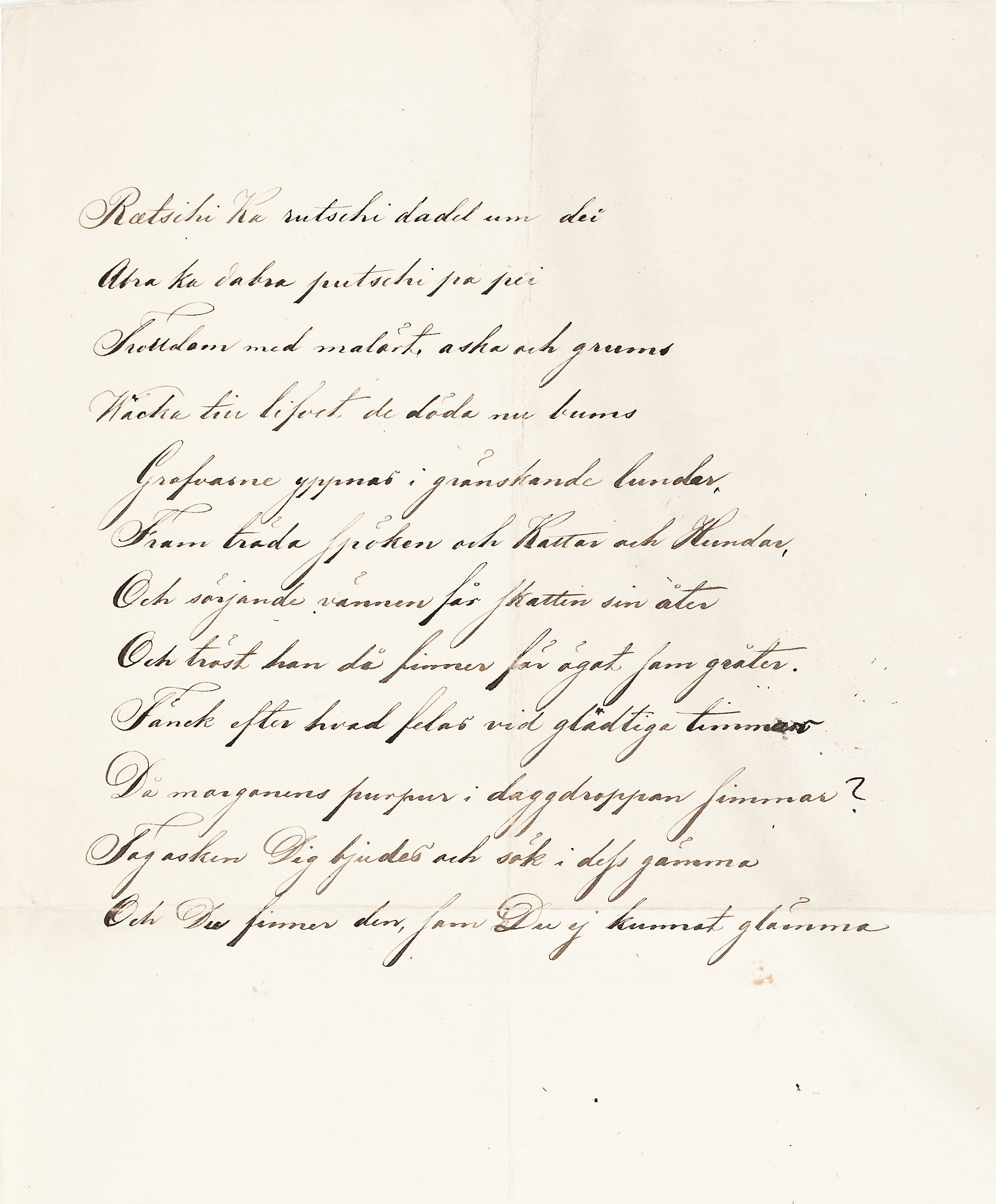 Trollformel. "Ratschi Ka rutschi dadel um dei" 12 versrader. Folio. Handskriften utförd med svartbrunt järngallusbläck på vitt papper. Papperet är klistrat på fals och inhäftat i arkivvolym 25.