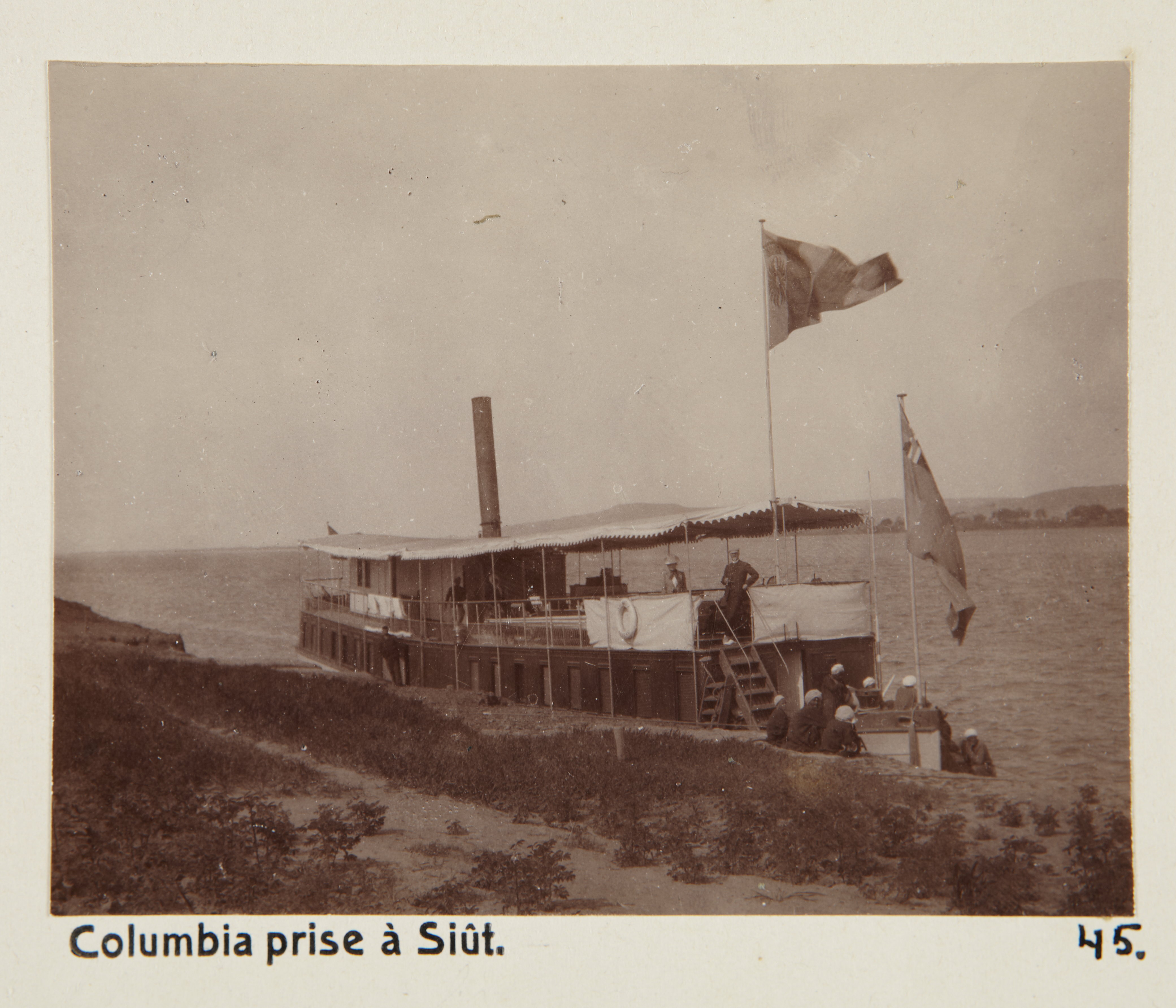 Ångfartyget "Columbia" fotograferat nära Asyut, Egypten. Text på fotografiet: "Columbia" prise à Siût. Fotografierna LXVI:M.01.- 201. kommer från resan till Egypten och Sudan som Wilhelmina och Walther von Hallwyl gjorde vintern 1900-1901. De lämnade Sverige den 5 november 1900 och fortsatte från Egypten till Palestina den 28 mars 1901. Med på resan var döttrarna Ellen med maken Henric de Maré och Irma med maken Wilhelm von Geijer. Wilhelminas sällskapsdam, fröken Ida Uhse reste också med. Under en del av resan anslöt sig ledamoten av Internationella domstolen i Kairo, assessorn Otto Conrad Waldemar Cedercrantz med makan Anna Elisabeth. Vid resan uppför Nilen hade Walther von Hallwyl hyrt ångfartyget Columbia med besättning. Båtresan startade i Kairo 27 december 1900, gick ända till Wadi Halfa varifrån man reste vidare med tåg till Khartum och tillbaka till Wadi Halfa. Båten vände åter i riktning mot Kairo, men det verkar som att sällskapet tog tåg sista biten, från Luxor. Henric och Ellen de Maré samt fru Cedercrantz lämnade båten redan då de passerade Luxor första gången. Resten av sällskapet återvände till Kairo den 1 mars. Fotografierna LXVI:M.01.-120. togs av resenärerna själva, de största av Ellen de Maré, de mellersta av Wilhelmina von Hallwyl och de minsta av Wilhelm von Geijer. Resten köptes av professionella fotografer i Kairo, de flesta från Studio Photogr. Artistique G. Lekegian & Cie. Alla uppgifter kommer från Ida Uhses reseanteckningar.