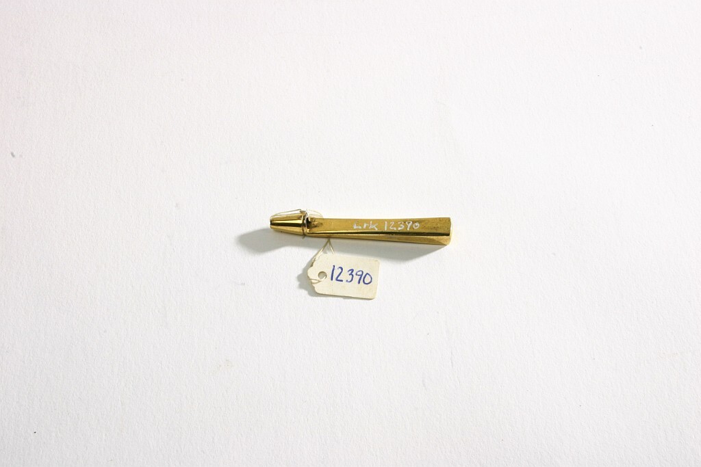 Huggpipa av förgyllt stål. Pipan koniskt, med runt tvärsnitt. På ena sidan firmanamn: "LEUCHARS".
