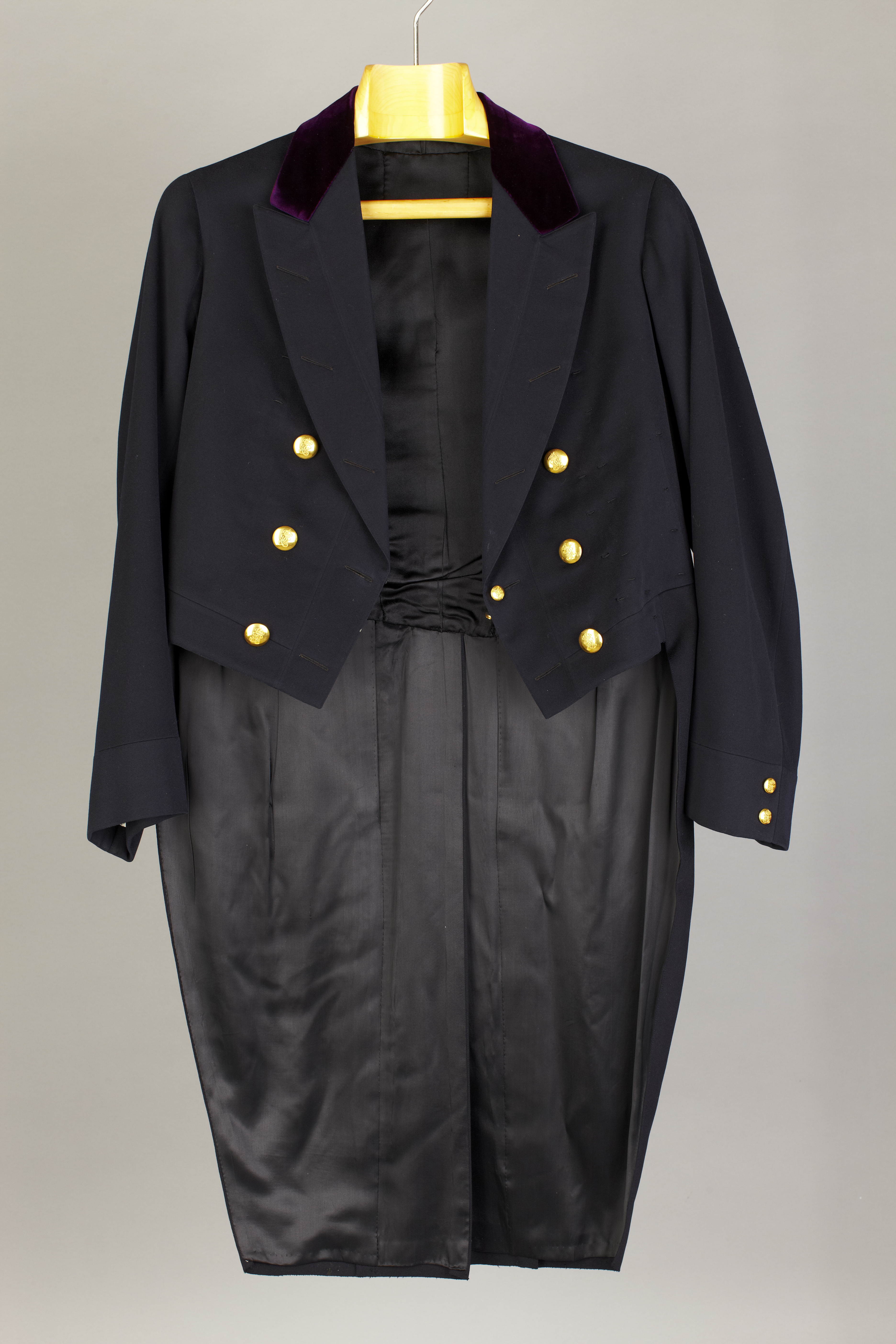 Chifferfrack med knappar med Gustav V:s namnchiffer. I ena innerfickan firmaetikett: "ENGELSKA SKRÄDDERI // ETABLISEMENTET Stockholm // Hamngatan 1A (Norrmalmstorg) // Baron H. J. Rudbeck // April 1908". Engelska Skrädderietablissementet, Stockholm 1908. På vänster framstycke 16 tränsar för bröstdekoration. På höger sida två tränsar. Mitt fram dubbelknapp. Mitt bak i livsömmen två knappar. Vid sidan av dessa två mindre knappar. Foder av svart siden i ärmarna vitt siden. Har tillhört kammarherren friherre Reinhold H.J.Rudbeck (1871-1957).