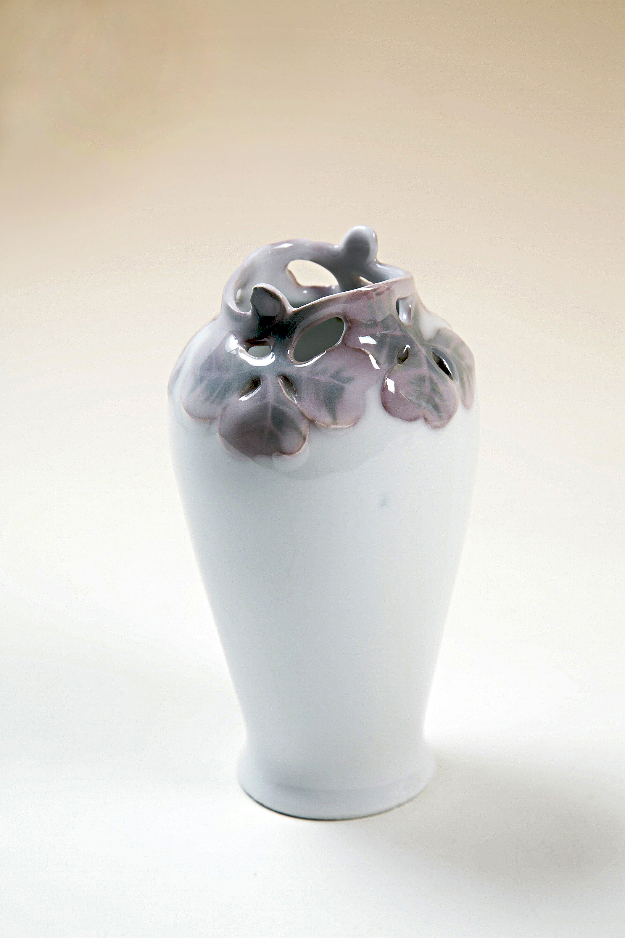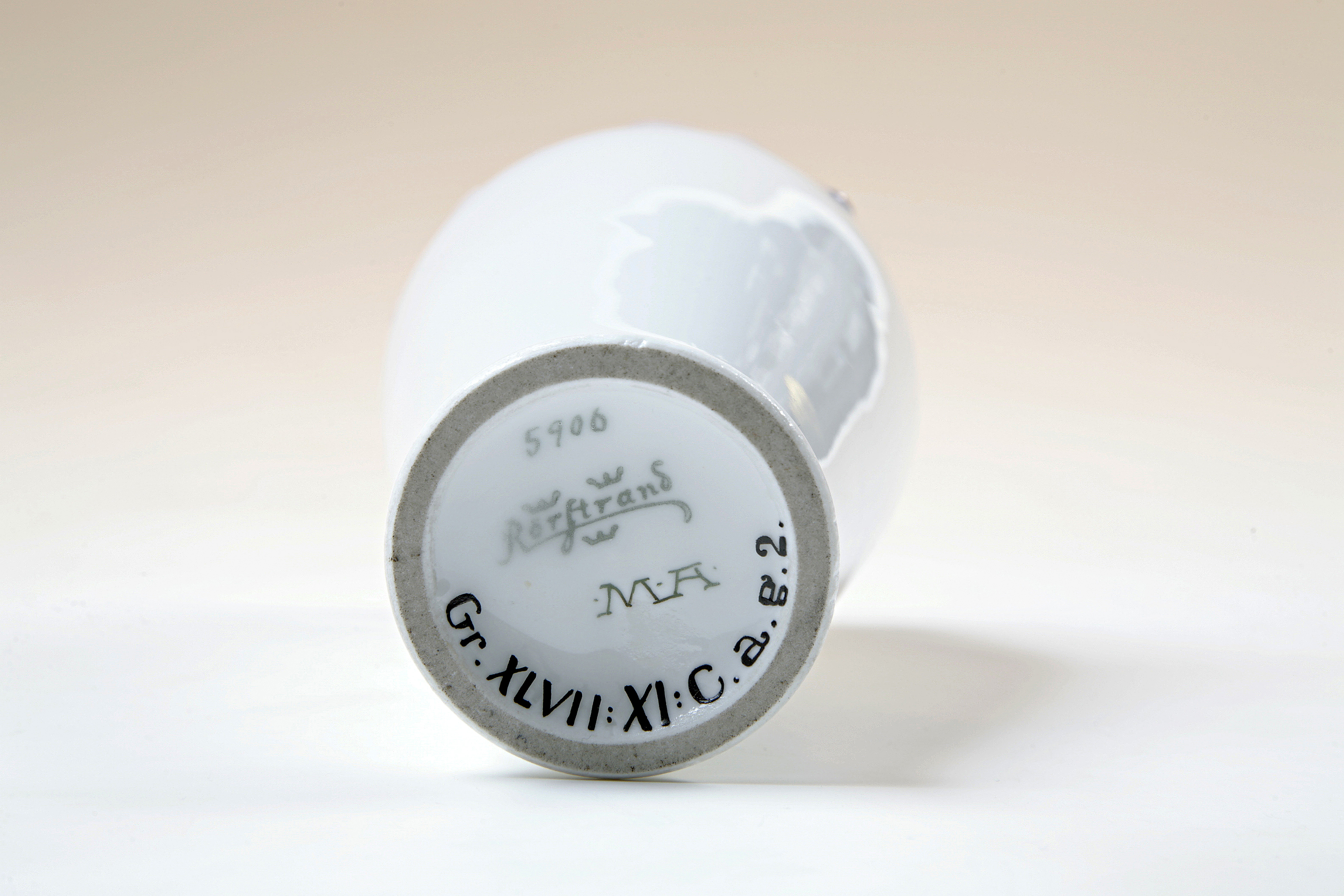 Vas av omvänd utdragen päronform, nederdelen något utsvängd; bottnen insänkt. Dekor i färger under glasyren, i form av en krans av klöverblad i blekt gredelint med skiftning i grågrönt; bladskaften bildande en ojämn mynning. Fabrikens privilegium utfärdades 1729, dess verksamhet synes dock ha börjat redan 1726. Intill 1860-talet tillverkades endast fajans av olika slag, från 1857 även benäkta porslin samt från 1881 fältspatäkta porslin. Fabriken flyttades 1926 till Göteborg. Mela Anderberg var frilans på Rörstrands Porslinsfabrilk vid sekelskiftet 1900 och deltog med en servis av mjukt proslin i "Delftmanér" på Stockholmsutställningen 1897. Hon signerade M.A.