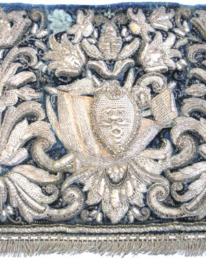 Fyra stycken Broderade Stycken af blått Sammet och lika Arbete, som sjelfva Careten, omkring hvilka äro Fingers breda Silfver Fransar. Desse stycken synes hafva varit brukade på Sidorne vid steget.