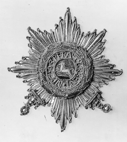 Åttauddig strålstjärna av silverbleck och silverpaljetter, varje stråle kantad med silverkantiljer. Fyra av strålarna förgyllda och bildar två korslagda svärd, försedda med kanter, parerstänger och knappar (av guldkantiljer) . Medaljong, broderad med rött och grönt silke, därpå häst av silverkantiljer. Däromkring ring av grått linne (?), kantringar och text av guldkantiljer: "NEC ASPERA TERRENT". Därutanför välvd lagerkrans broderad med grönt silke i två nyanser, bär av rött silke, bladen kantade med guldkantiljer. På baksidan klistrat gulvitt skinn.