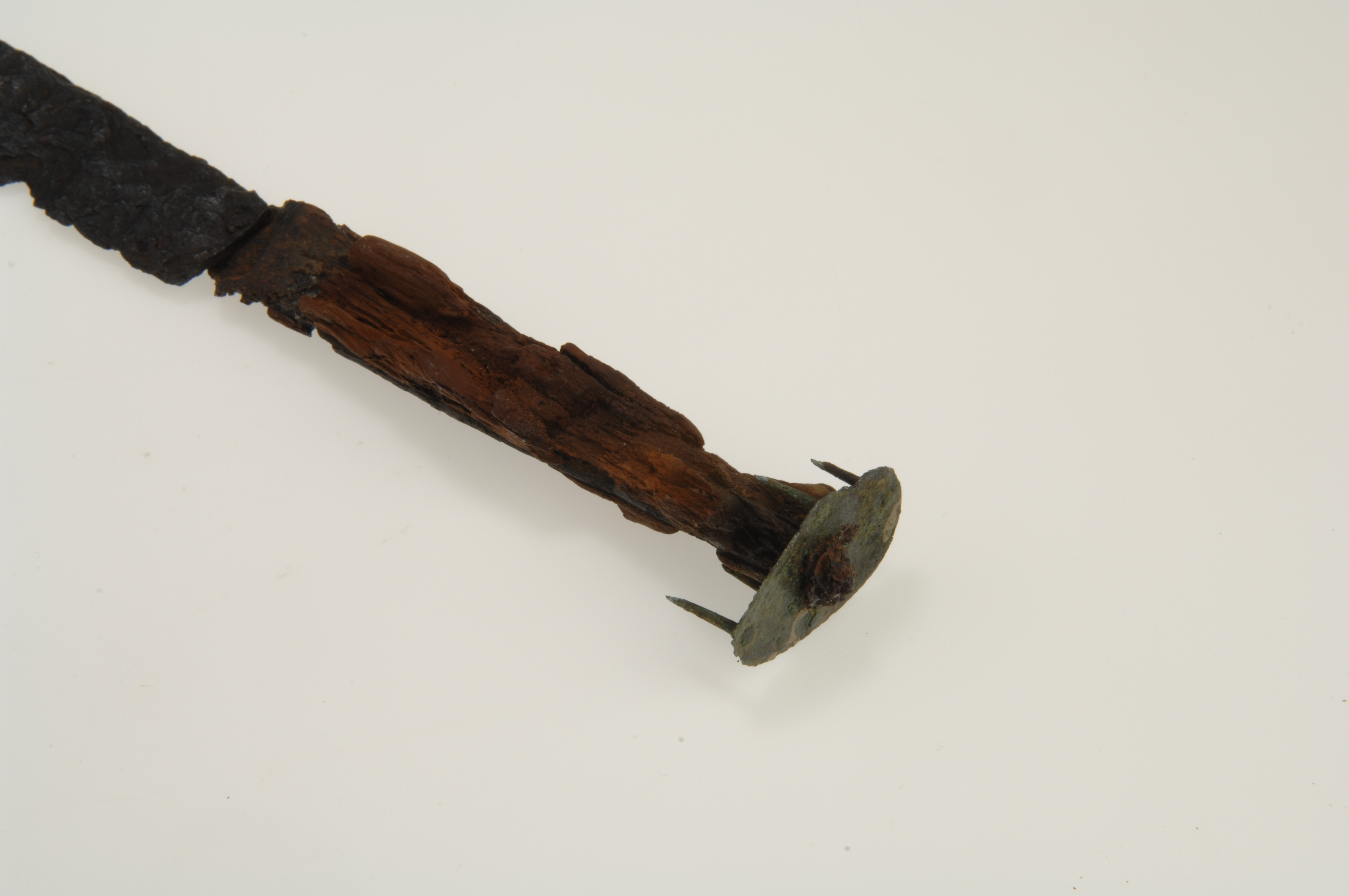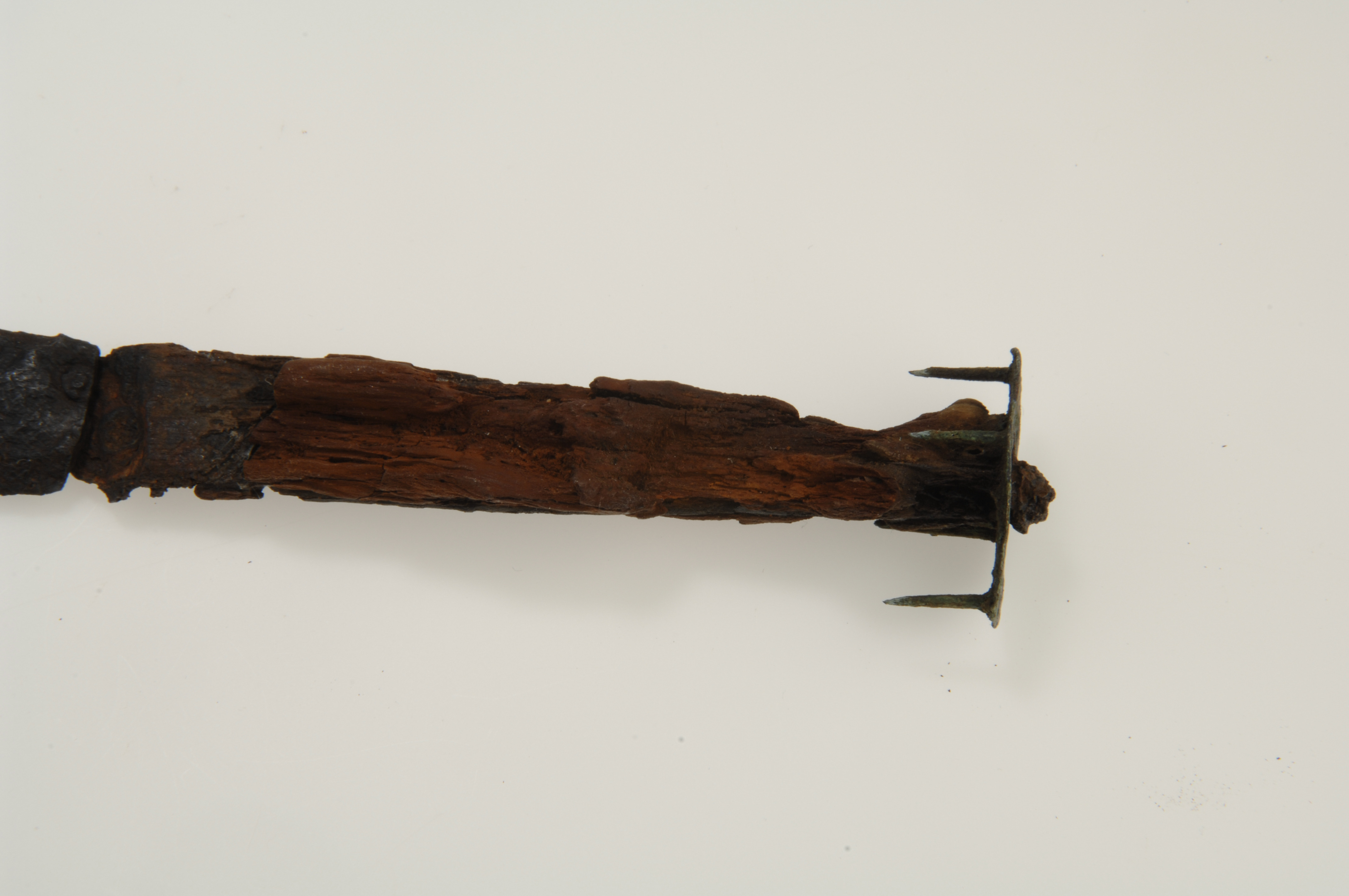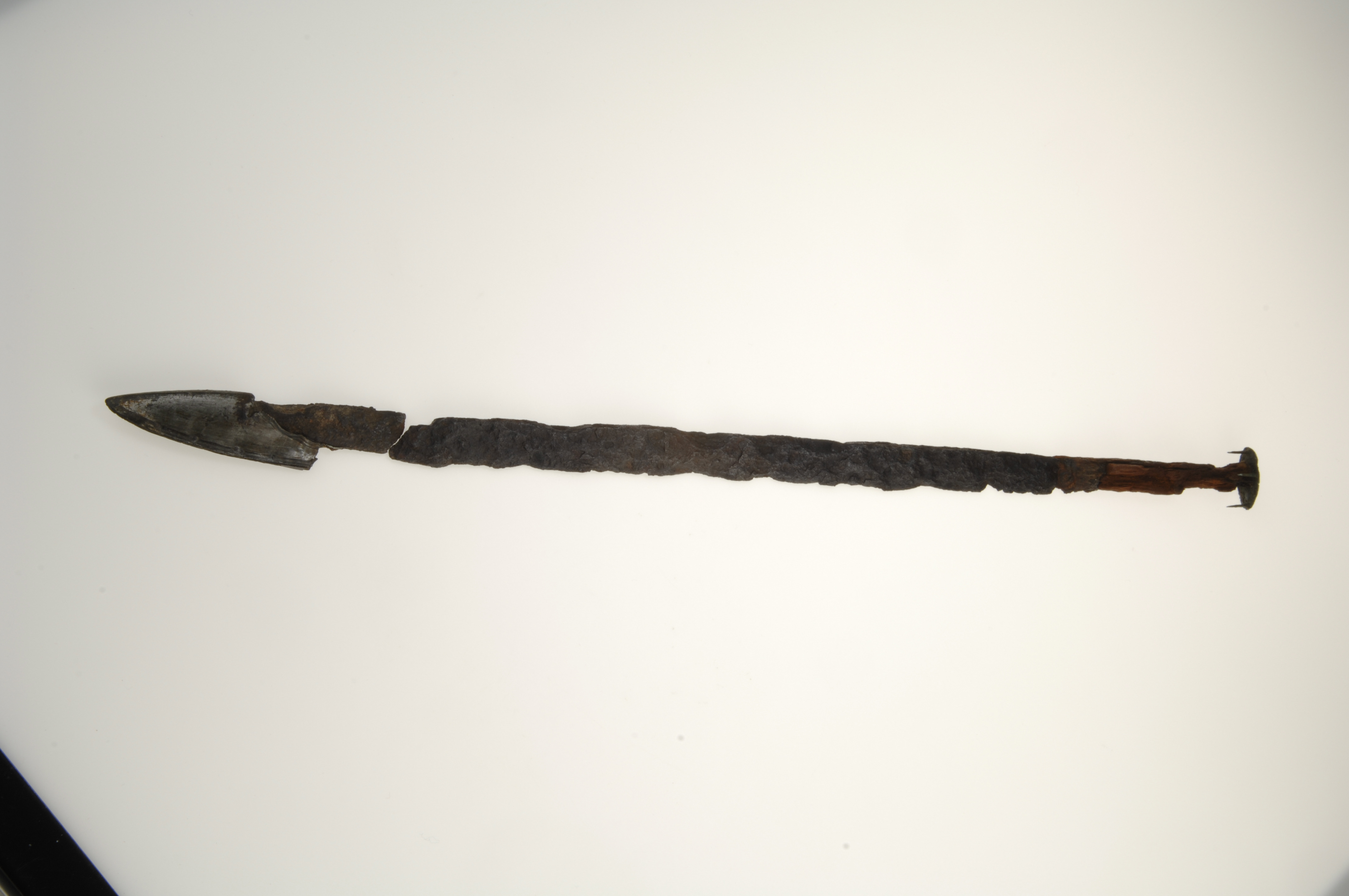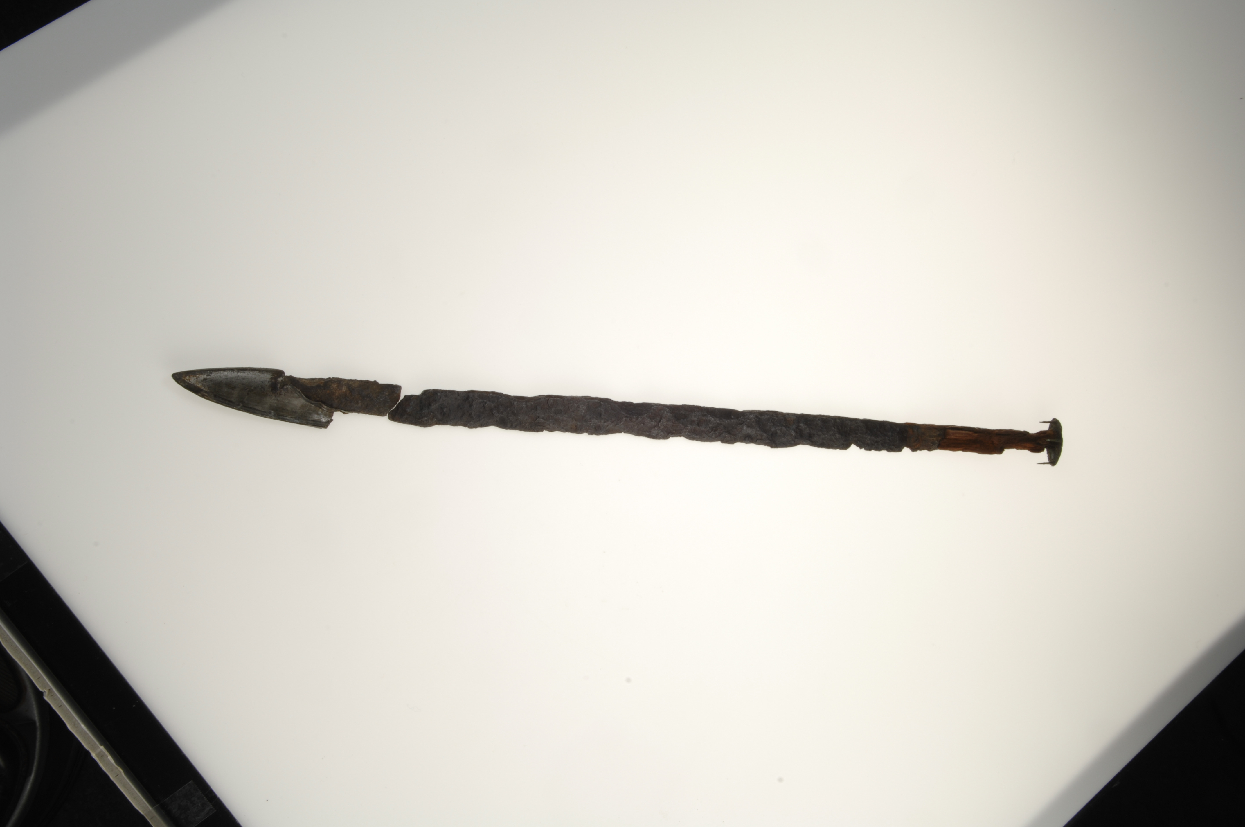 Vapenkniv av järn föreliggande i flera fragment. Träskaftet delvis bevarat.