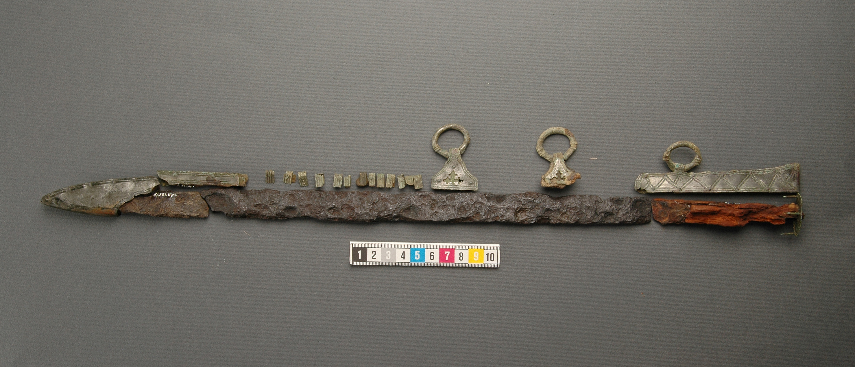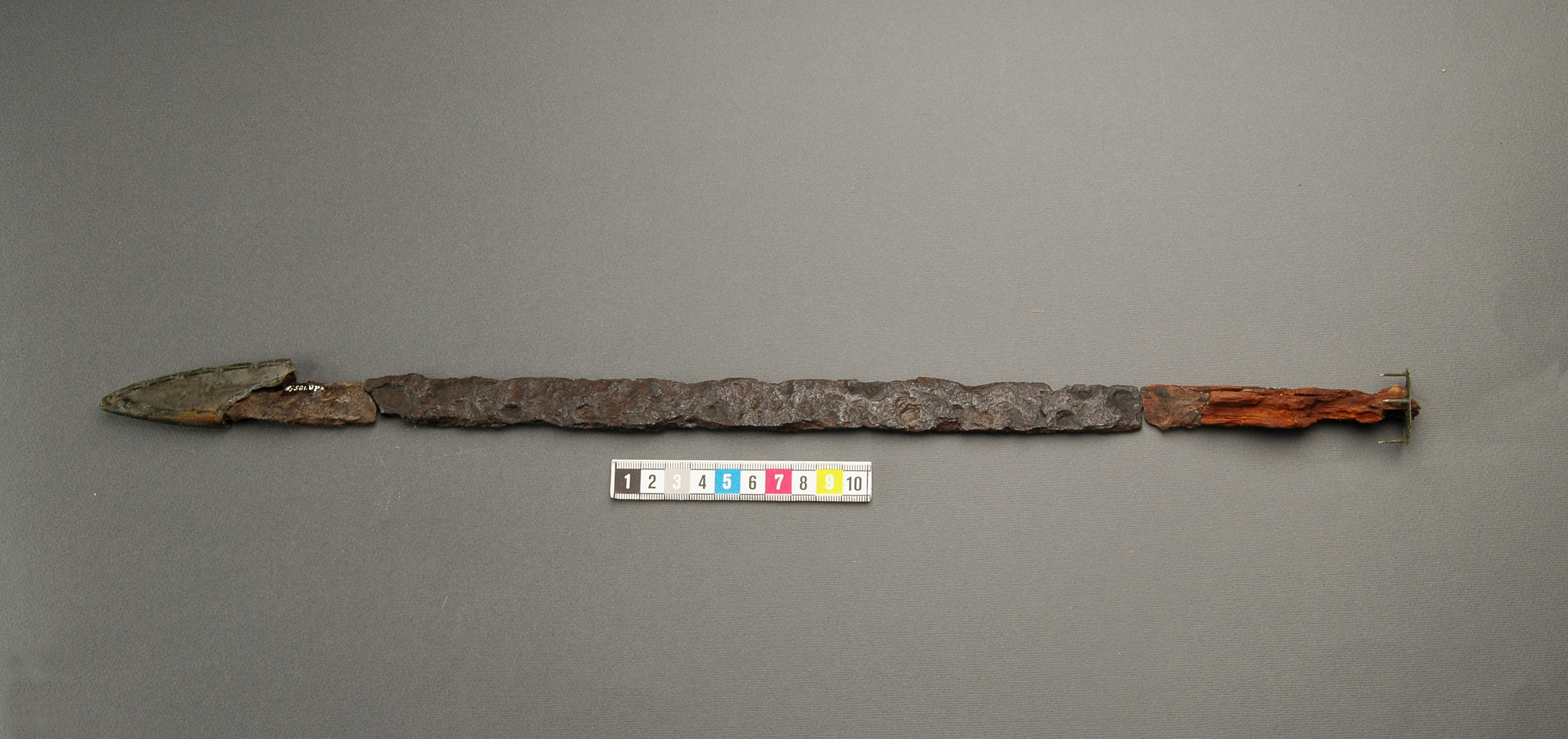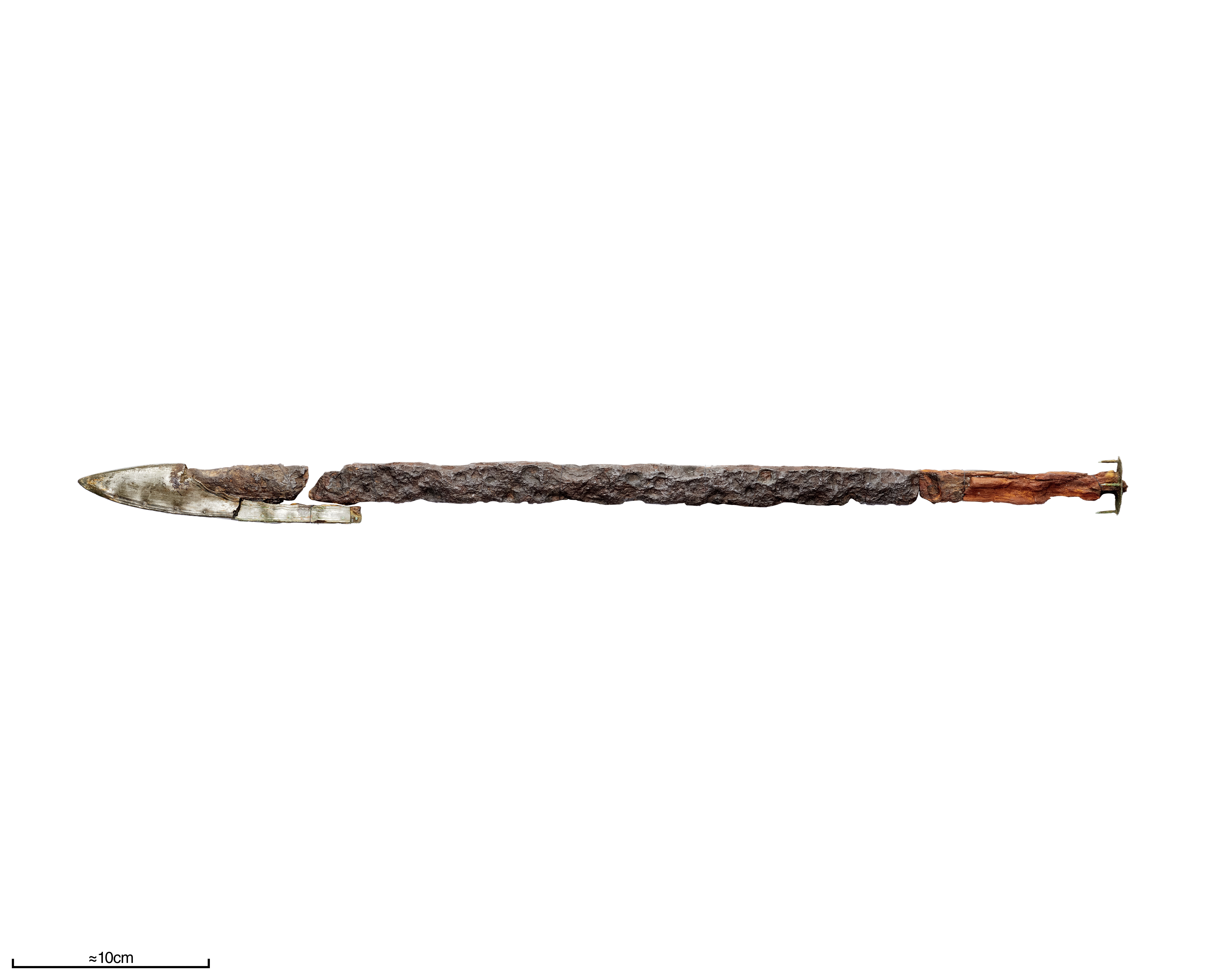 Vapenkniv av järn föreliggande i flera fragment. Träskaftet delvis bevarat.