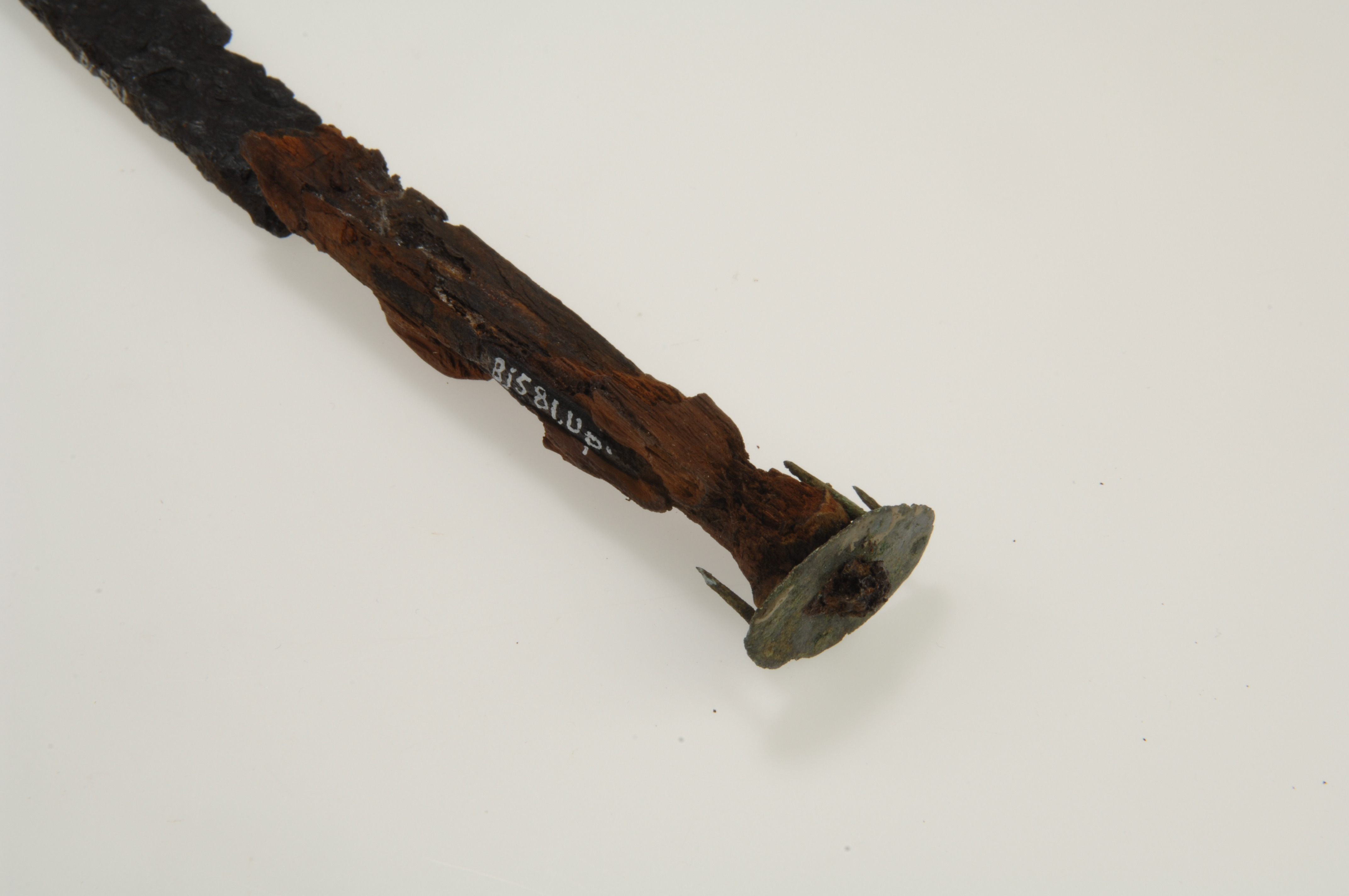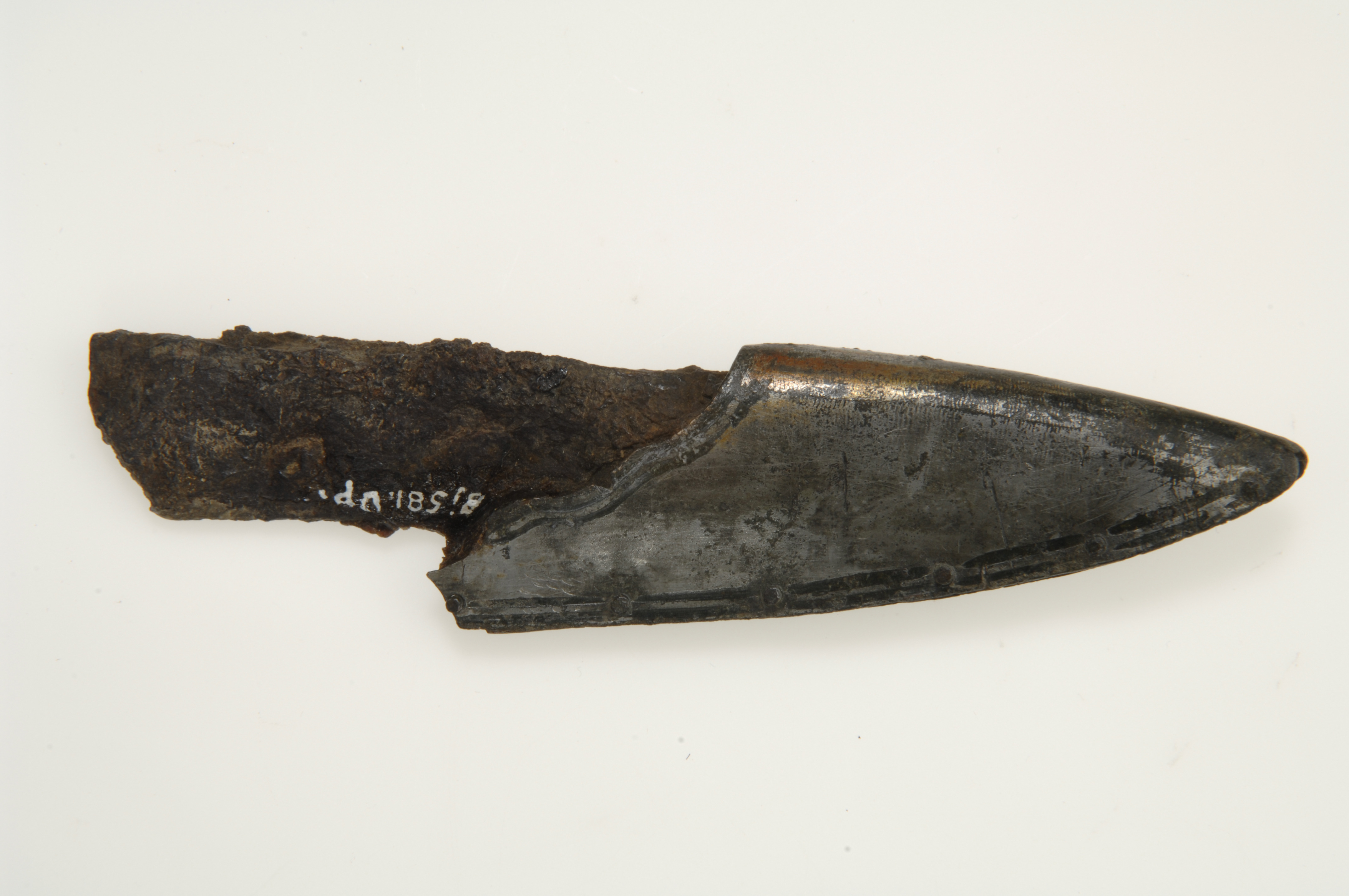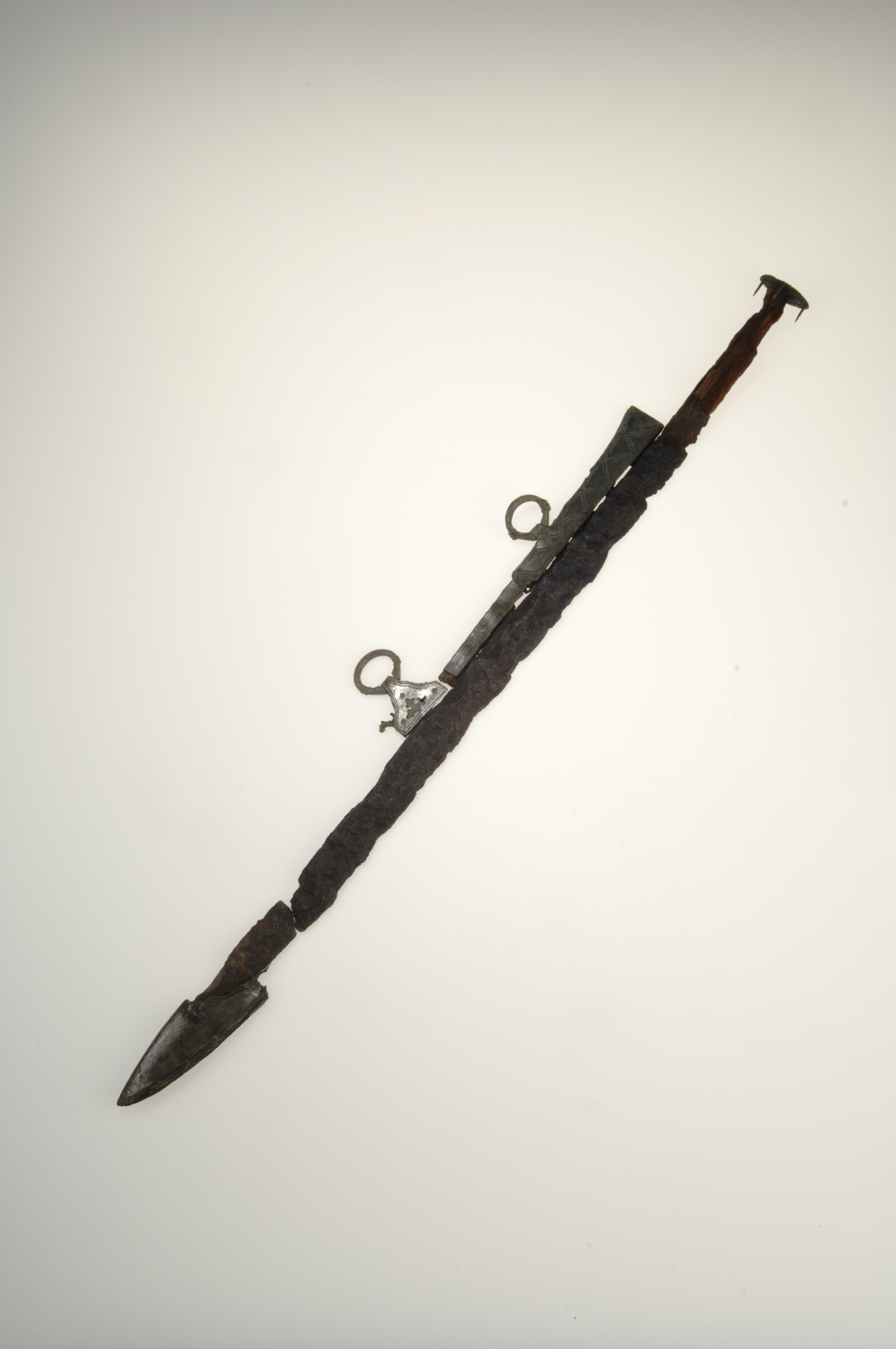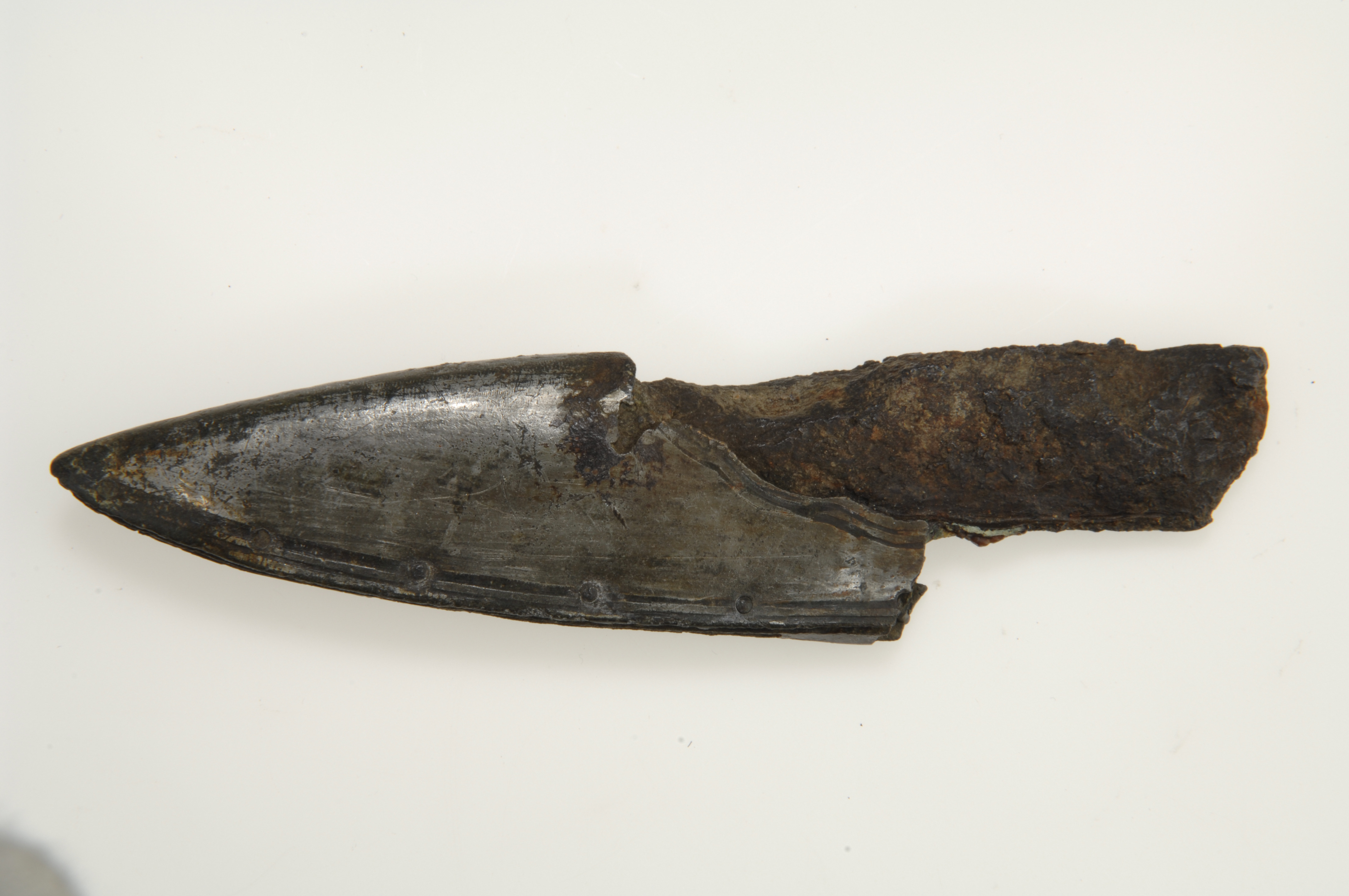 Vapenkniv av järn föreliggande i flera fragment. Träskaftet delvis bevarat.
