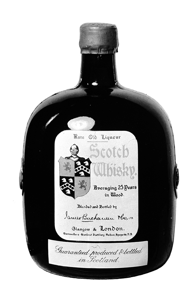 RARE OLD LIQUER, SCOTCH WHISKY, James Buchanan & Co., Ltd., Glasgow & London, en helbutelj Butelj av mörkgrönt glas. Låg, bukig, tryckt från två sidor samt med kupigt indragen skuldra och kort smal cylindrisk hals, kring vars mynning en bandliknande utsvällning (s. k. stärkring); bottnen svagt insänkt. Etiketter två, vita, den övre större, på denna text i svart och rött, till vänster därom en fyrdelad vapensköld, i fält 1 och 4 ett lejon i mörkt på botten i guld, i fält 2 och 3 en sparre i vitt med stjärnor i svart jämte tre hästhuvuden i vitt och rött, allt mot svart botten; på den nedre etiketten text i svart. Över korken ett svart pappersband, nedlöpande på ömse sidor på halsen, över skuldran och på halva smalsidorna samt med ändarna där avslutade vardera under ett rött lacksigill, varpå monogram i relief inom en ring i relief; på bandet på ömse sidor om halsen text i guld. Kapsyl av förtent bly, rödfärgad, ovanpå text i relief. Höjd: 18,4 cm.; bredd: 11,5 cm.; tjocklek: 9,1 cm. Inköpt av Walther von Hallwyl något av åren 1917-1921.