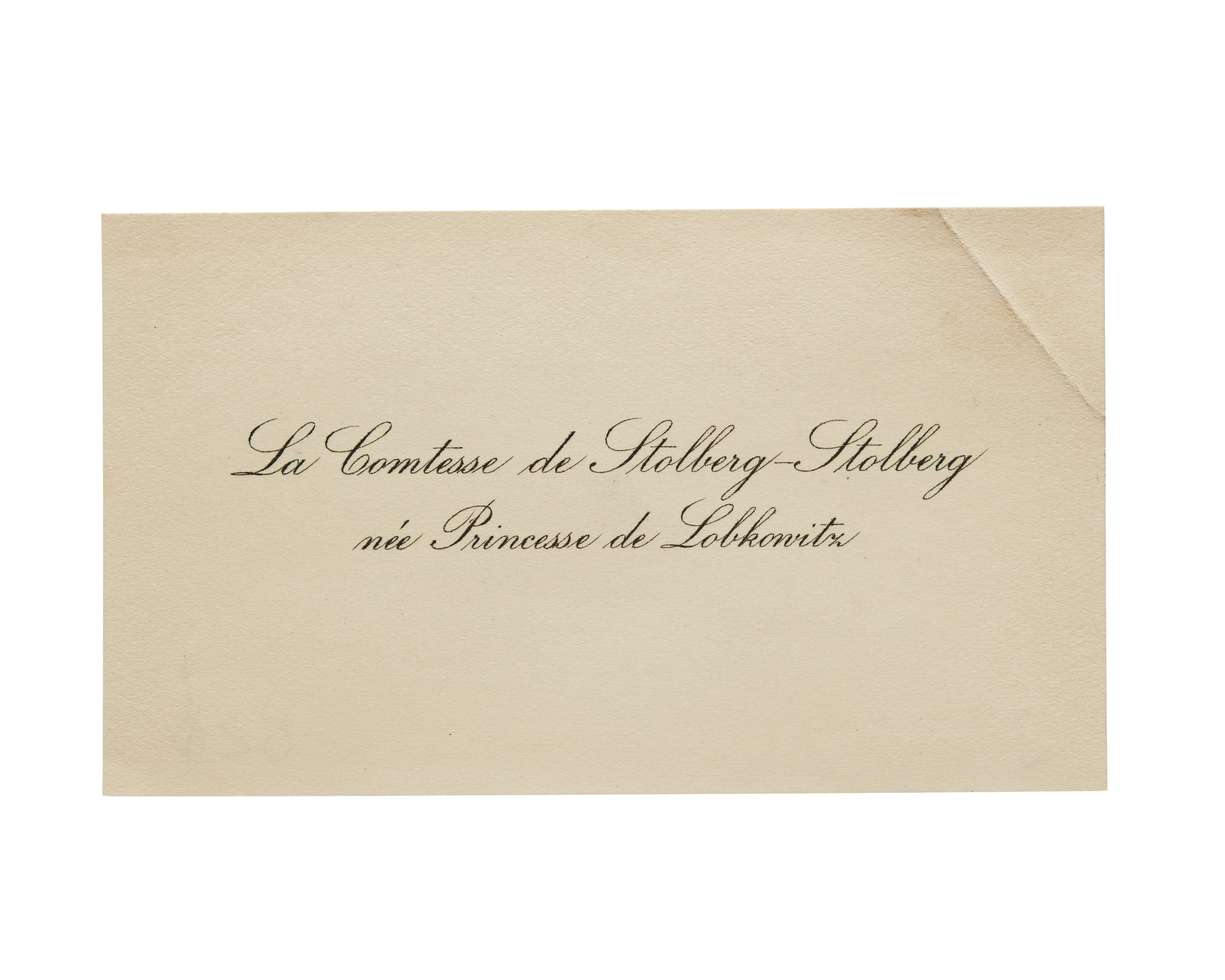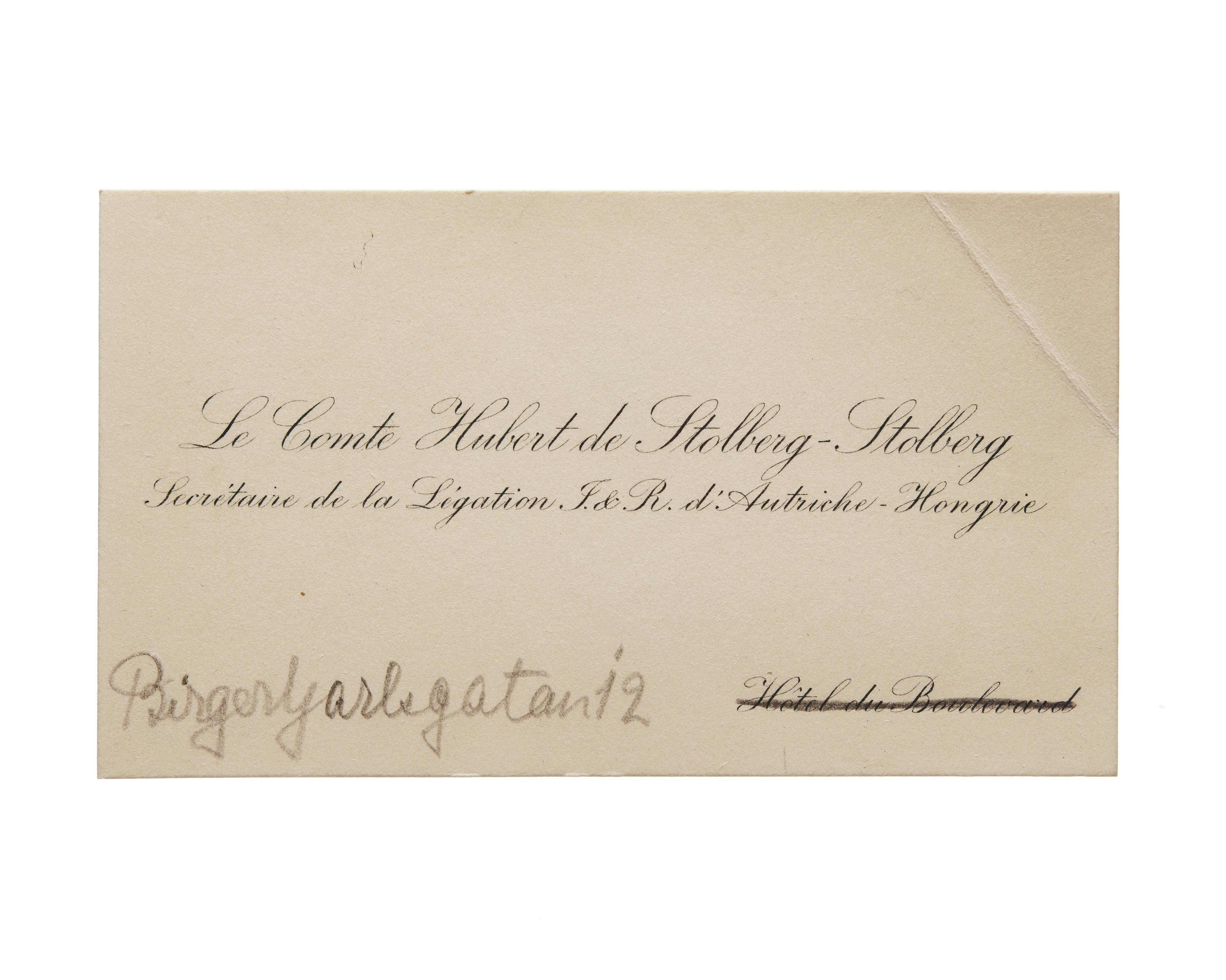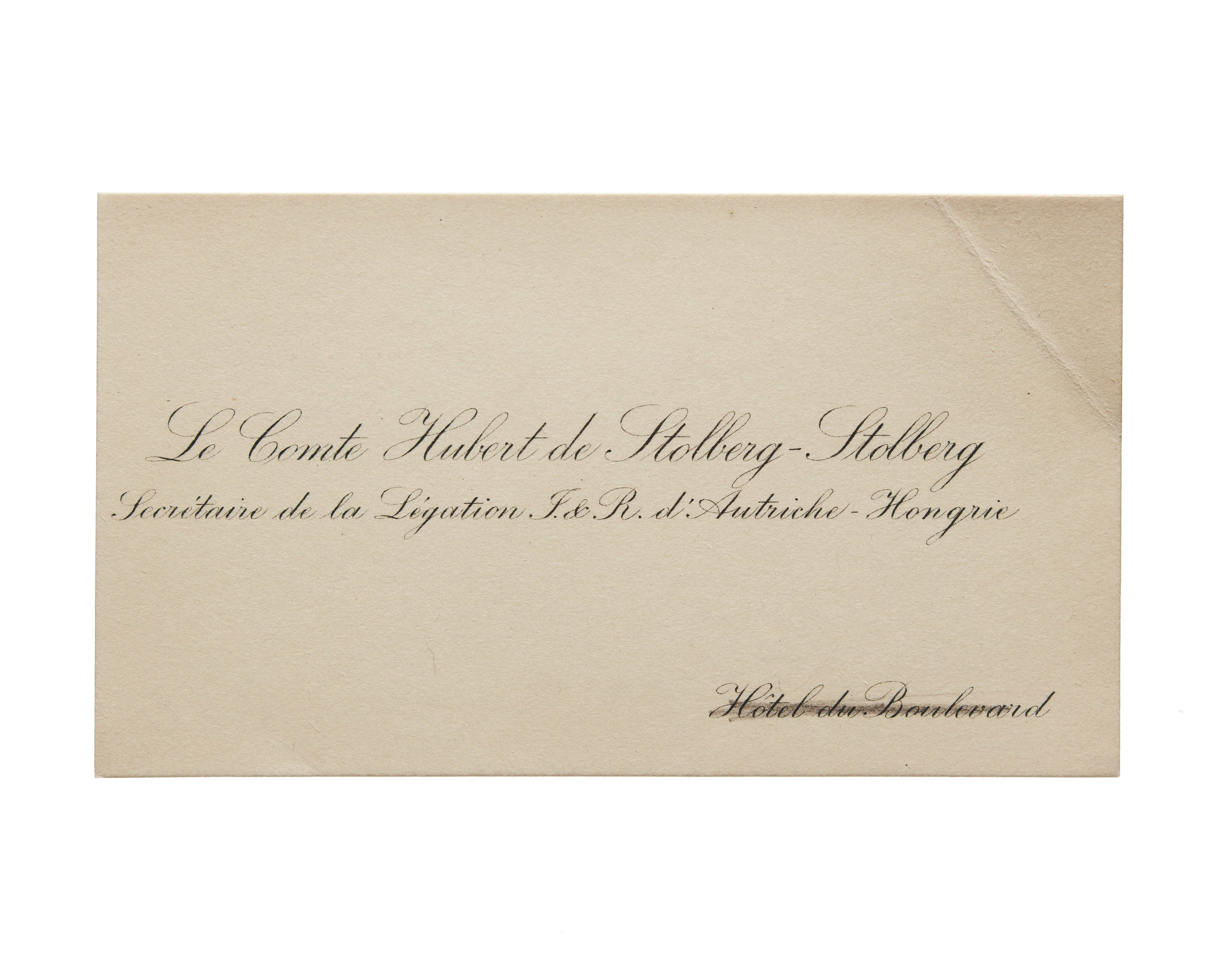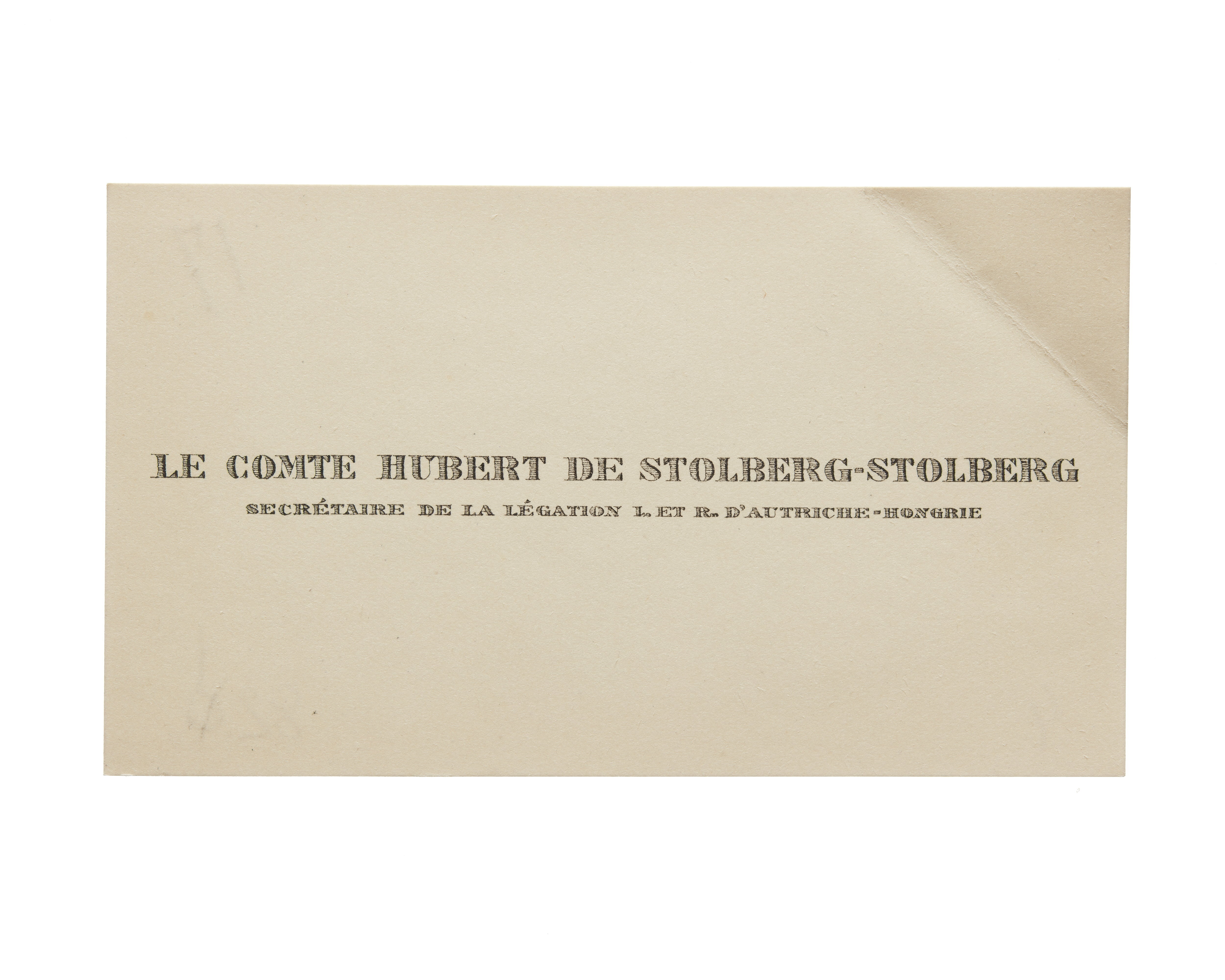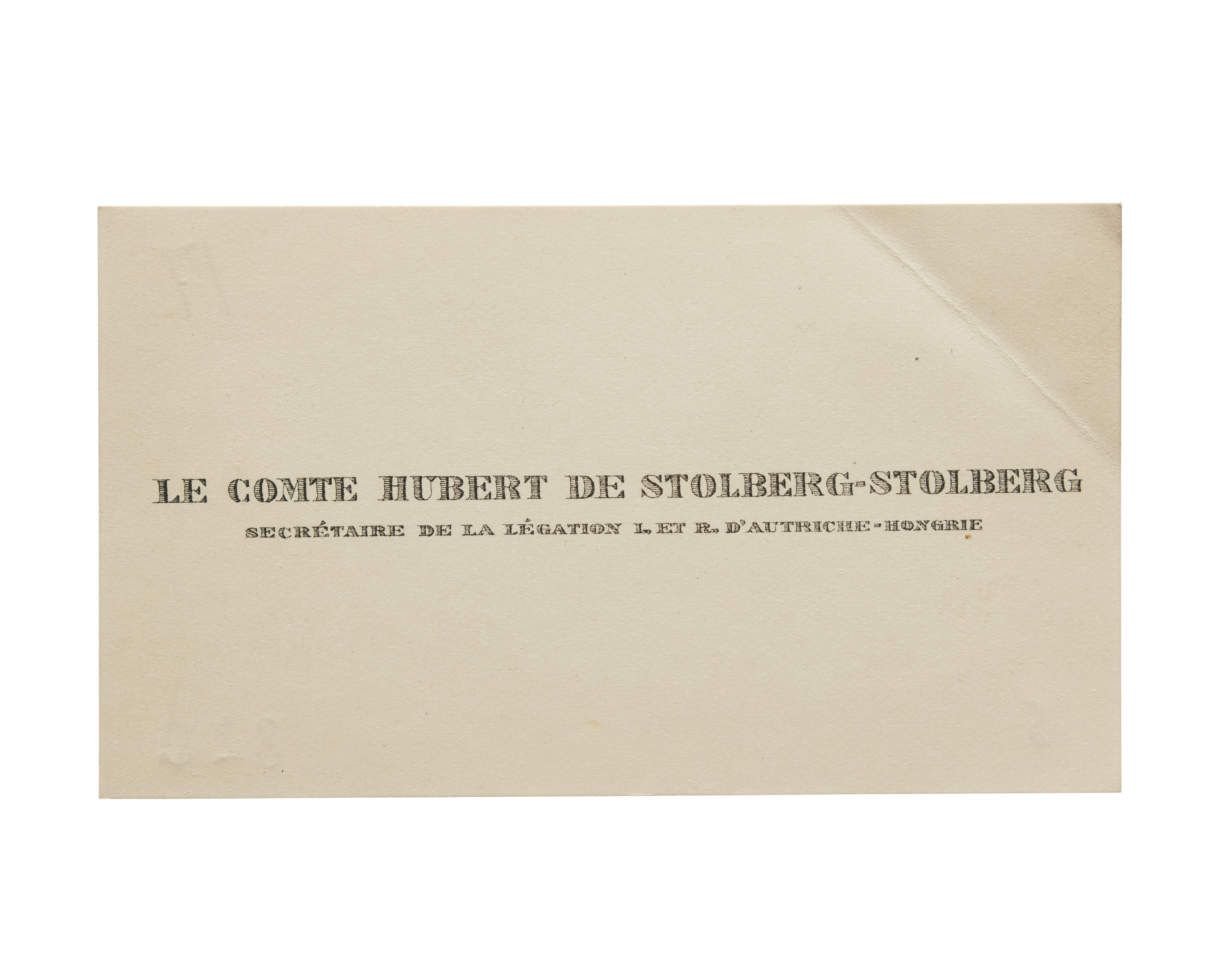 Visitkort från la comte Hubert de Stolberg-Stolberg, Secretarie de lalegation I. et R. d'Autriche-Hongrie och La comtesse Anne de Stolberg-Stolberg, nee Princesse de Lobkowitz